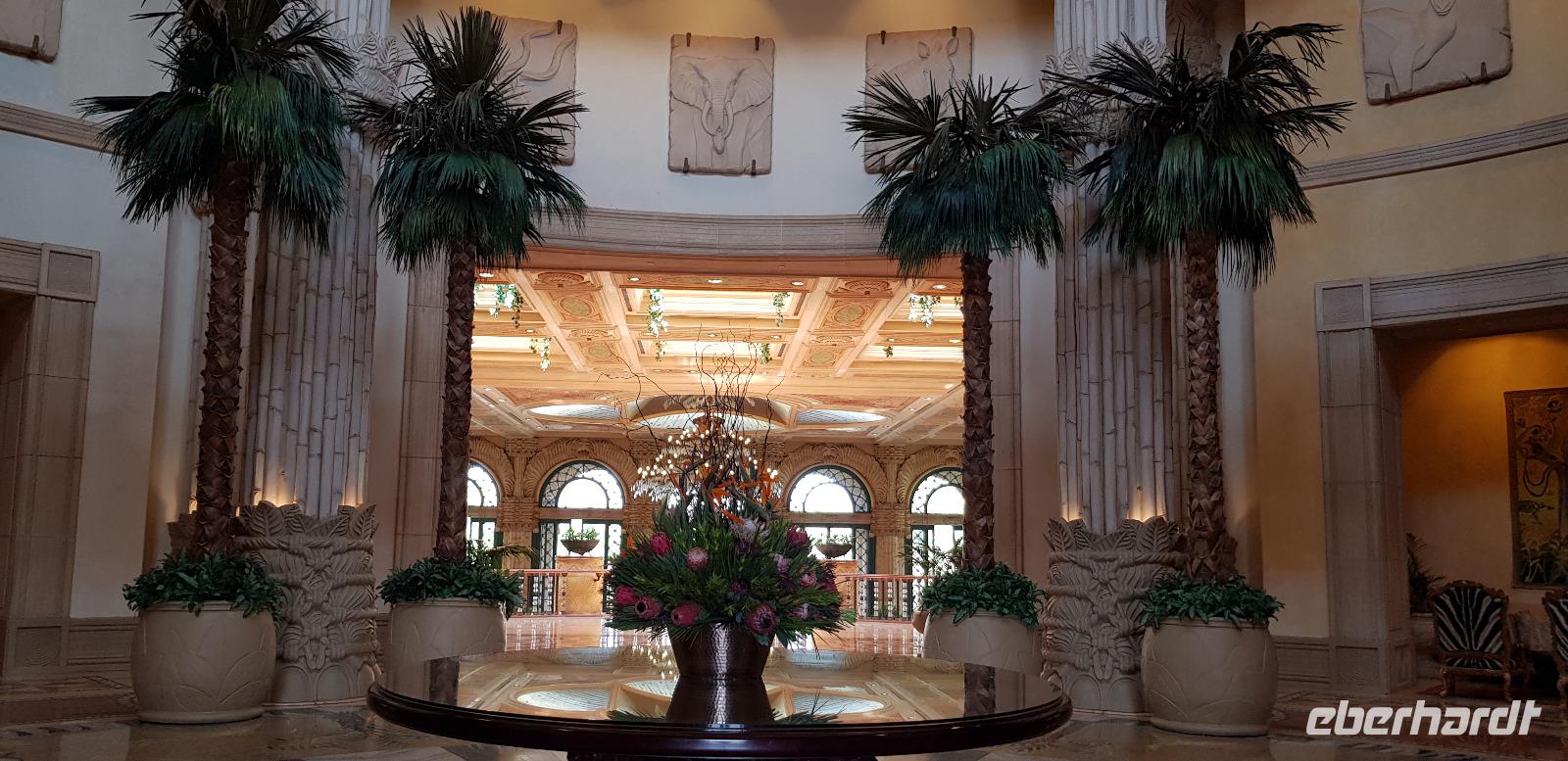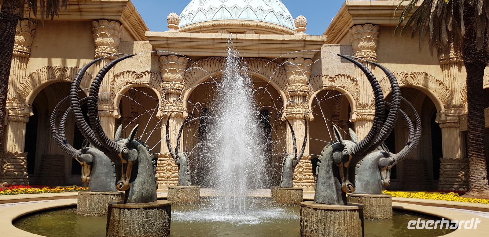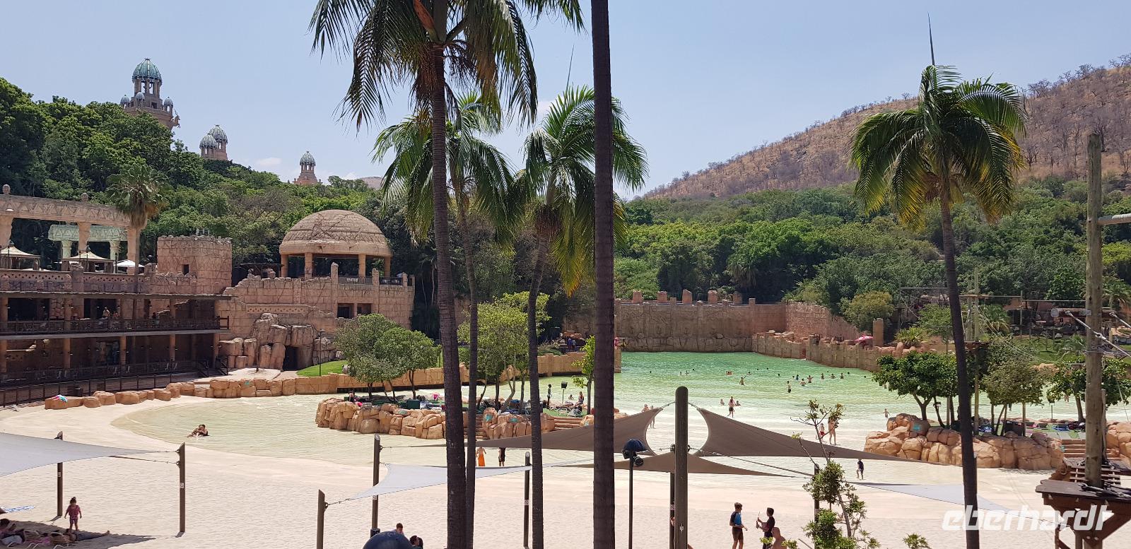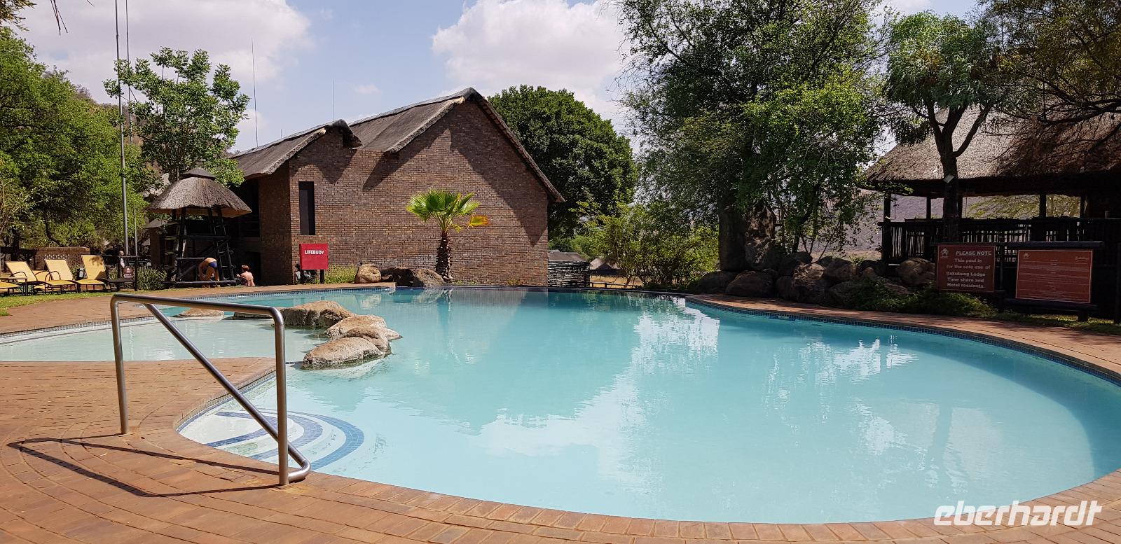 Danach erkunden wir gemütlich die gigantische Ferienanlege von Sun City, sehen den künstlichen Strand und besuchen das Palace Luxushotel. Hier schaffen wir es sogar - Dank Anita - hinein und spazieren einmal kurz durch die Lobby und wieder zurück. Zum Abschluss blicken wir noch einmal kurz ins Casino. Hier demonstriere ich wie schnell man in wenigen Minuten 10€ verspielt. Es gewinnt eben immer die Bank. Nun fahren wir zurück in unsere schöne Lodge, wo wir noch etwas Freizeit haben bis zur nächsten Safari. Die meisten entspannen sich am schönen Pool oder packen schon die Koffer für die morgige Abreise