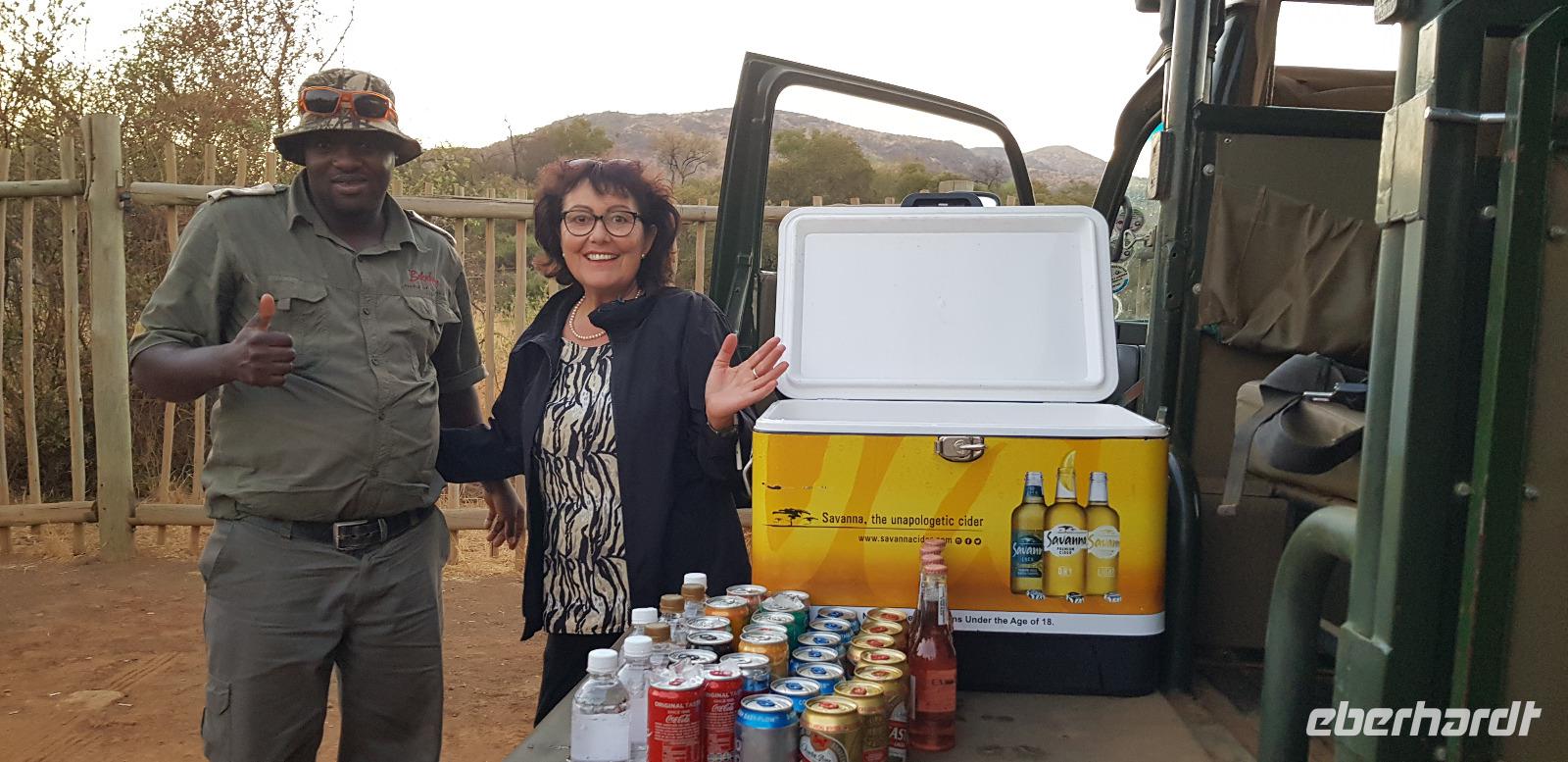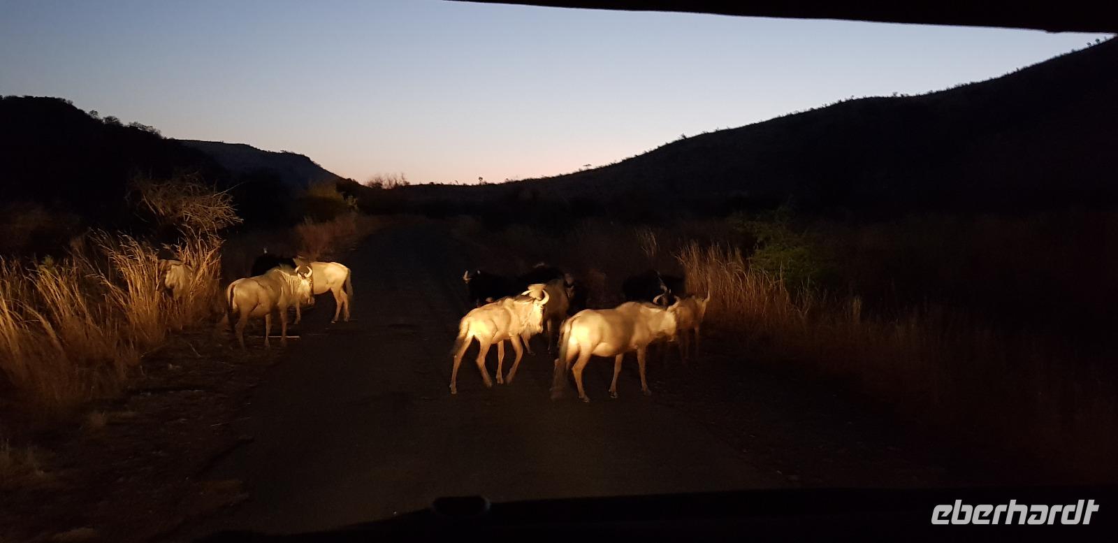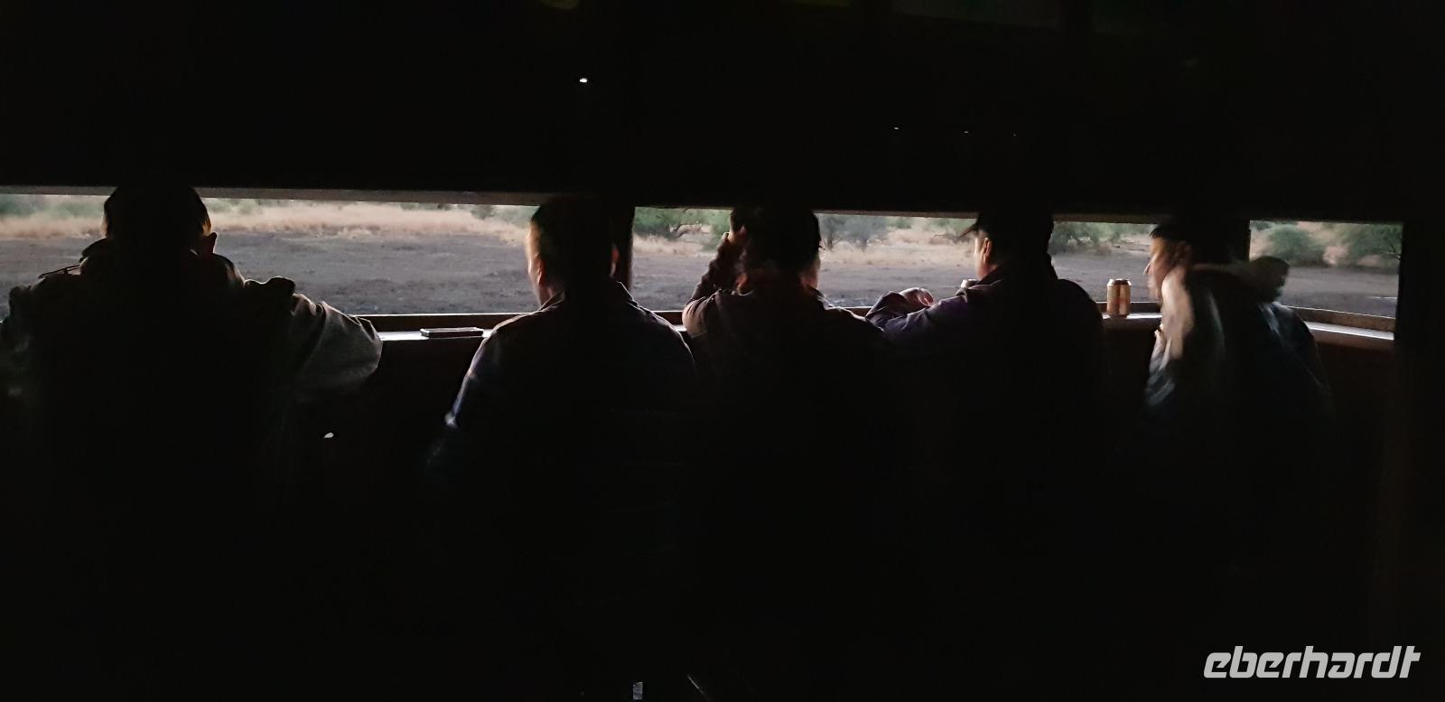 Auch heute stehen zwei Pirschfahrten auf dem Programm. Die erste startet am frühen Morgen von unserer Lodge. Früh sind besonders viele Tiere auf den Beinen, was wir natürlich mit eigenen Augen sehen wollen. Es ist gerade einmal 8 Grad „warm", weshalb wir uns sehr vielschichtig angezogen haben.