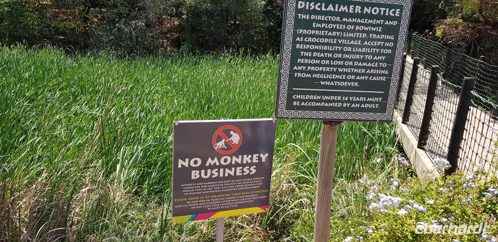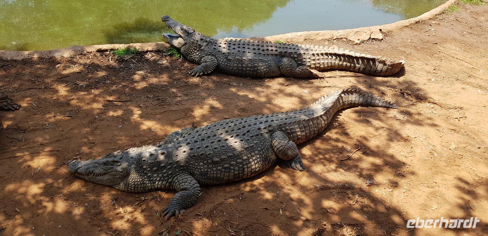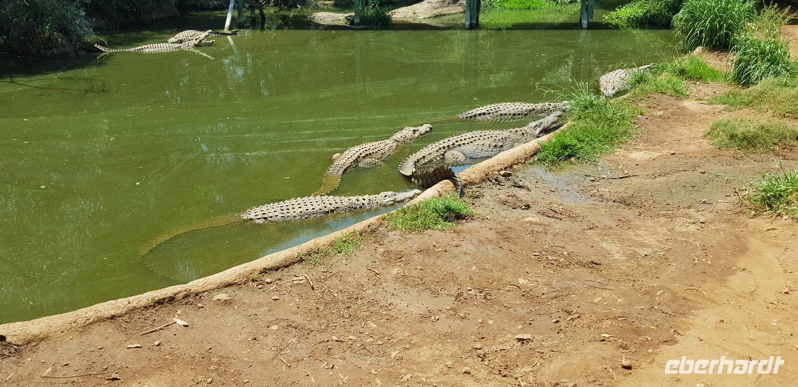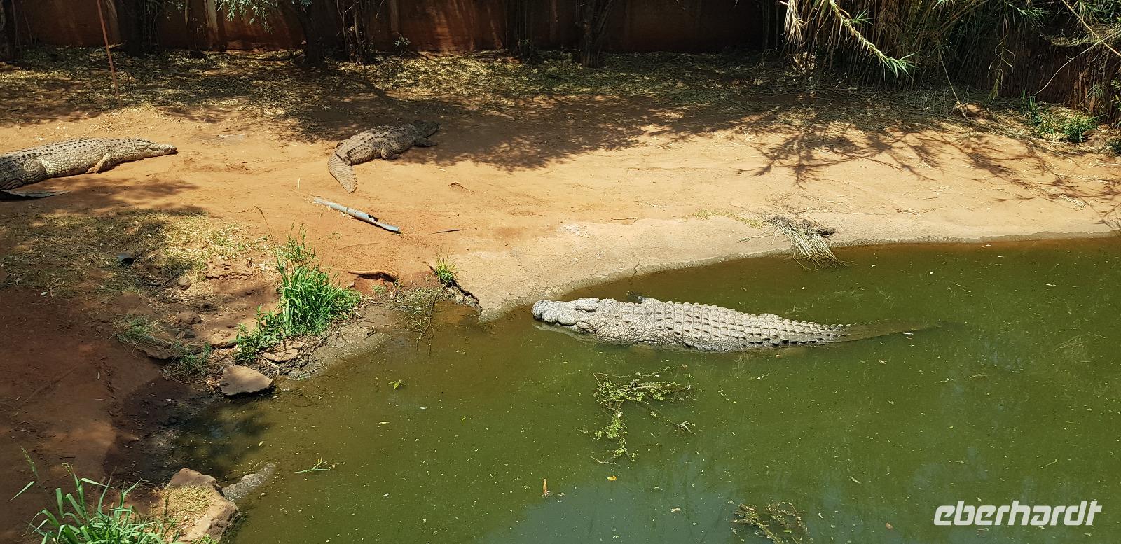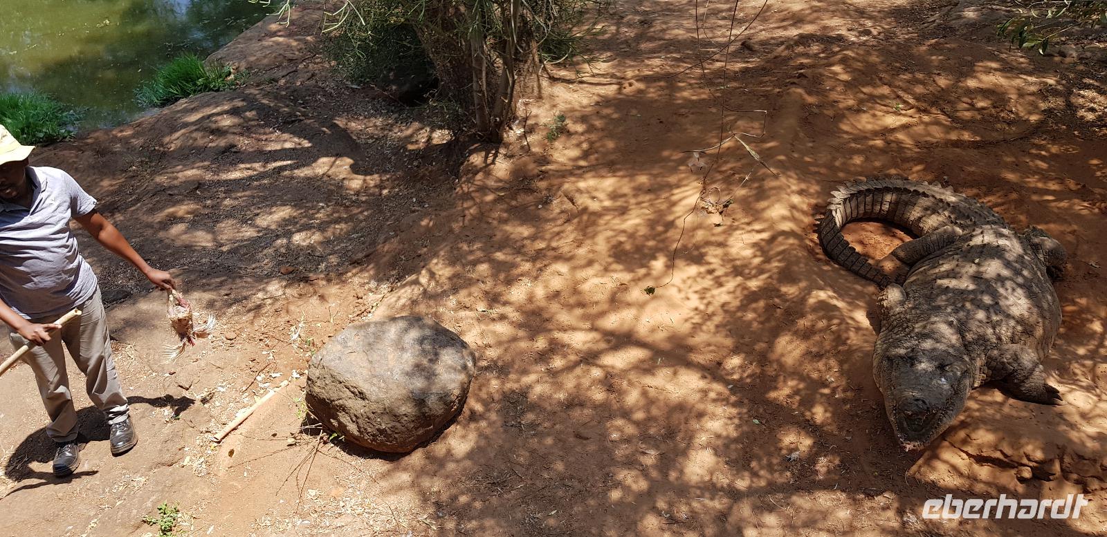 Anschließend geht es weiter nach Sun City, eine Art Vergnügungspark mitten in der Wildnis. Zuerst besuchen wir als Überraschung eine Krokodil-Farm, gesponsert durch Herrn Eberhardt. Hier unternehmen wir mit einem örtlichen Führer einen kleinen Rundgang, wobei uns alles Wissenswertes über die urzeitlichen Tiere erklärt wird. Zum Schluss geht er sogar ins Gehege hinein und füttert die großen Krokodile aus nächster Nähe. Wir sind absolut beeindruckt.