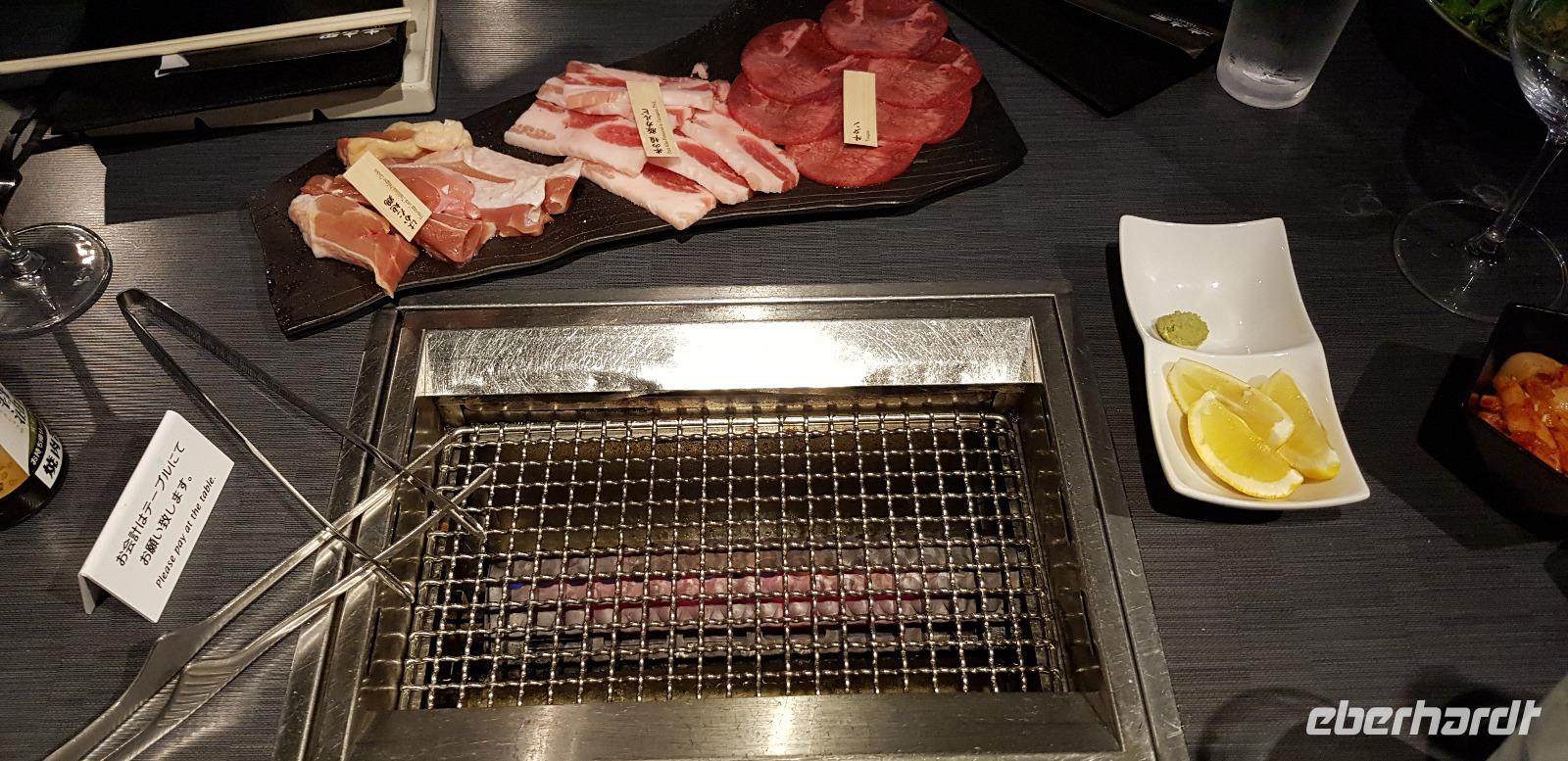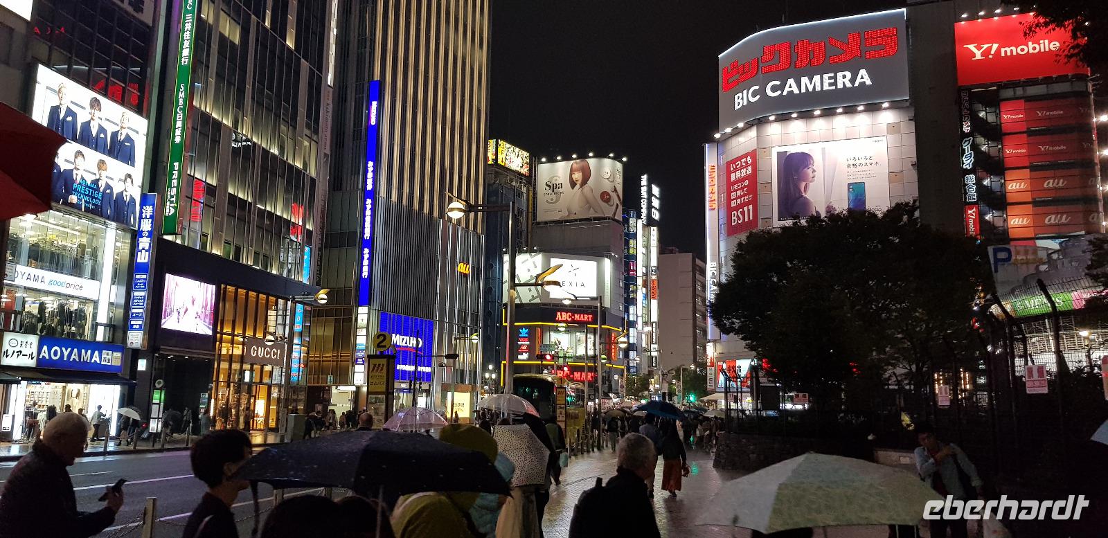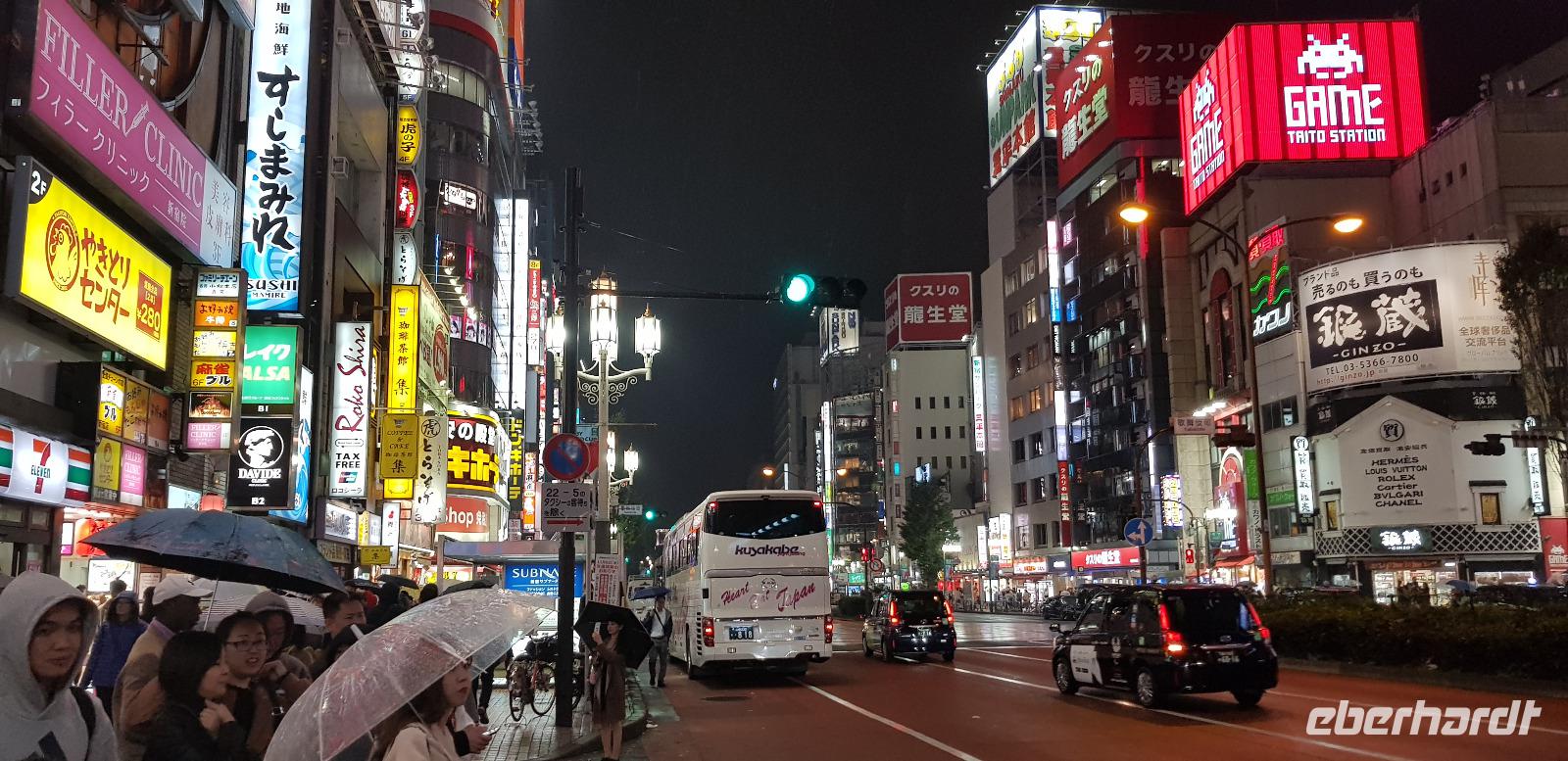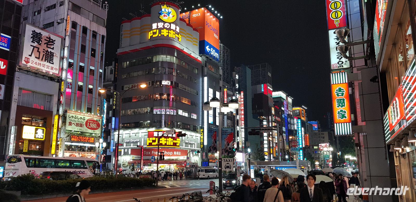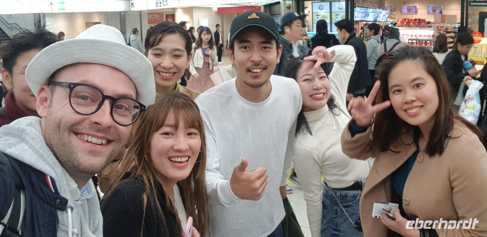 Hier erwarten uns feinste japanische Fleischspezialitäten, wie z.B. Wagyu Rindfleisch. Alles wird roh zum selber Grillen auf Platten serviert... jeder nimmt sich schließlich immer ein Stück Fleisch und grillt es in der gewünschten Stufe. Es schmeckt einfach hervorragend und ist mit das beste was ich je gegessen habe! Hinzu kommt... Eberhardt TRAVEL spendiert wieder 5 Flaschen Wein! Nach dem leckeren Essen spazieren wir noch eine kleine Runde um den Häuserblock, um die bunten Leuchtreklamen zu bestaunen. Auch hier sind wieder Menschenmassen auf den Straßen unterwegs. Besonders spannend wird es, als wir eine große Kreuzung überqueren und die S-Bahn-Station erreichen. Hier werden wir von allein Seiten angesprochen und bewundert. Es entstehen viele lustige Bilder und Videos. Schließlich fahren wir mit der S-Bahn 4 Stationen zu unserem Hotel zurück.