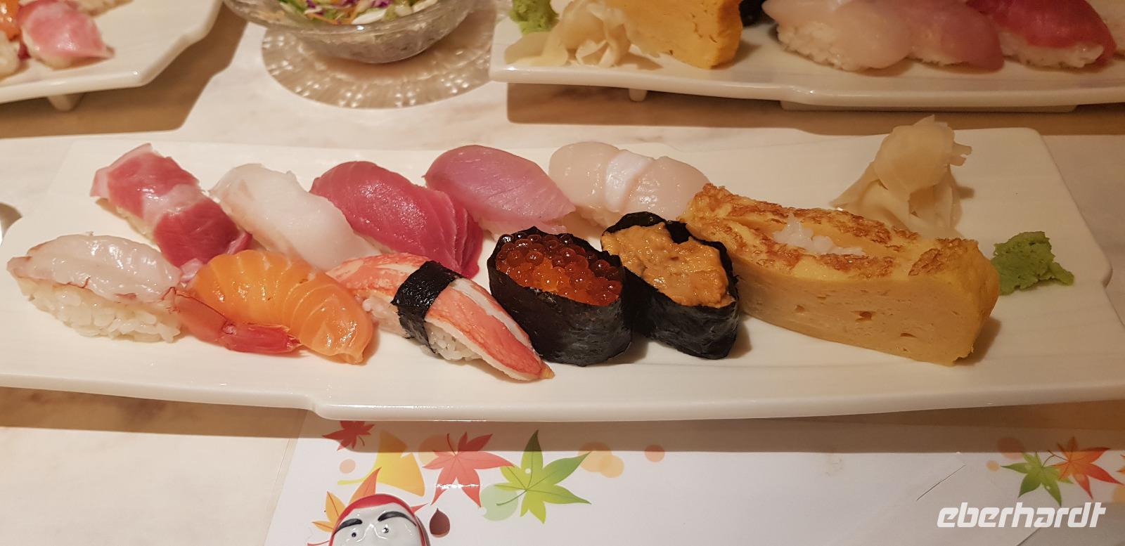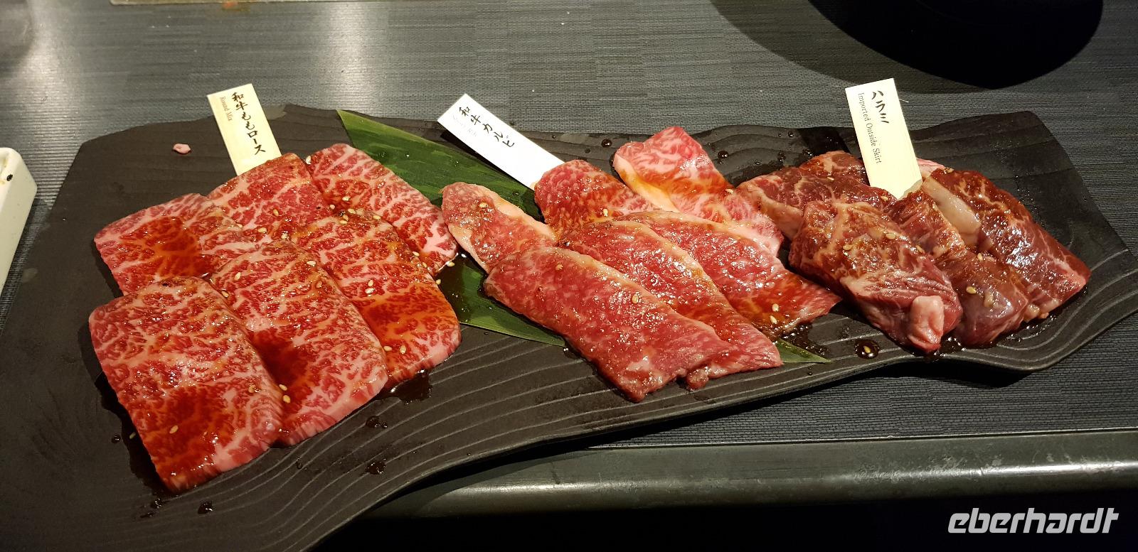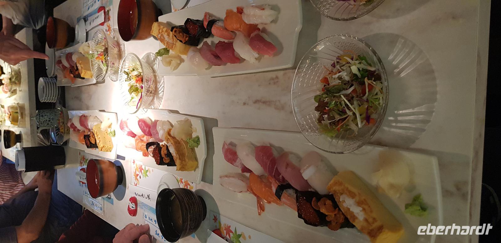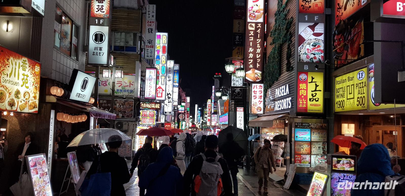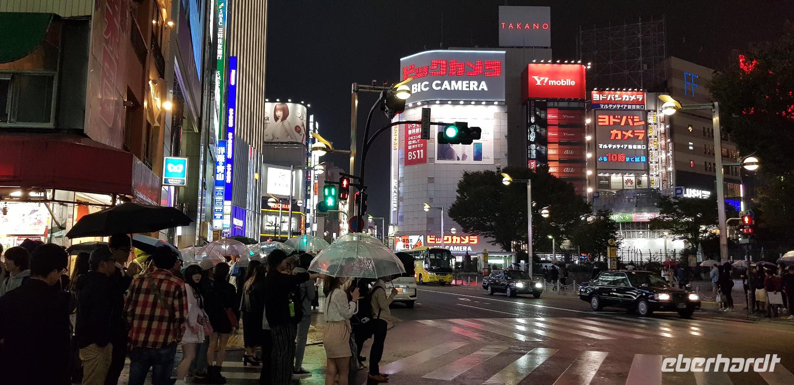 Hier erwarten uns feinste japanische Fleischspezialitäten, wie z.B. Wagyu Rindfleisch. Alles wird roh zum selber Grillen auf Platten serviert... jeder nimmt sich schließlich immer ein Stück Fleisch und grillt es in der gewünschten Stufe. Es schmeckt einfach hervorragend und ist mit das beste was ich je gegessen habe! Hinzu kommt... Eberhardt TRAVEL spendiert wieder 5 Flaschen Wein! Nach dem leckeren Essen spazieren wir noch eine kleine Runde um den Häuserblock, um die bunten Leuchtreklamen zu bestaunen. Auch hier sind wieder Menschenmassen auf den Straßen unterwegs. Besonders spannend wird es, als wir eine große Kreuzung überqueren und die S-Bahn-Station erreichen. Hier werden wir von allein Seiten angesprochen und bewundert. Es entstehen viele lustige Bilder und Videos. Schließlich fahren wir mit der S-Bahn 4 Stationen zu unserem Hotel zurück.