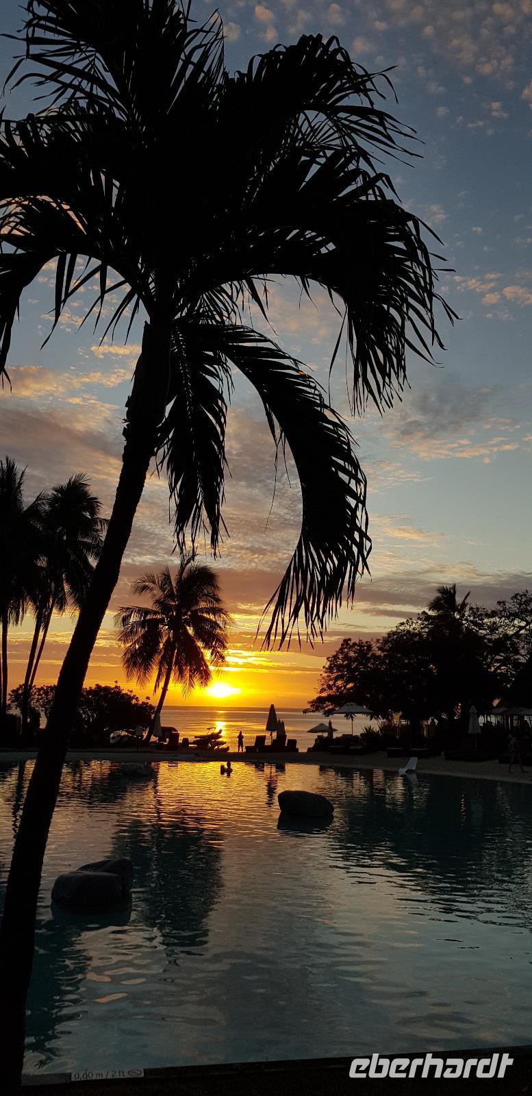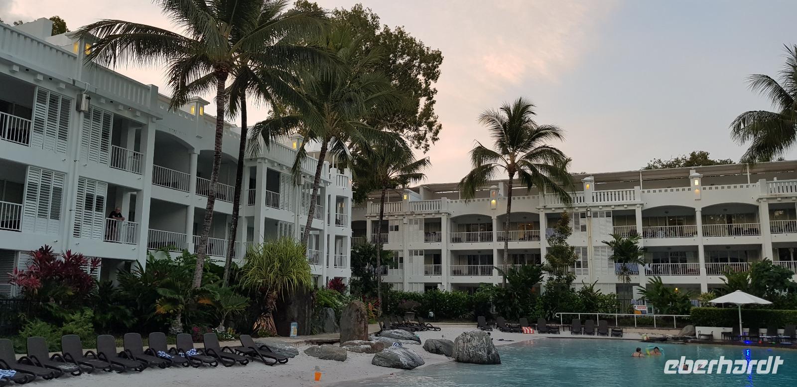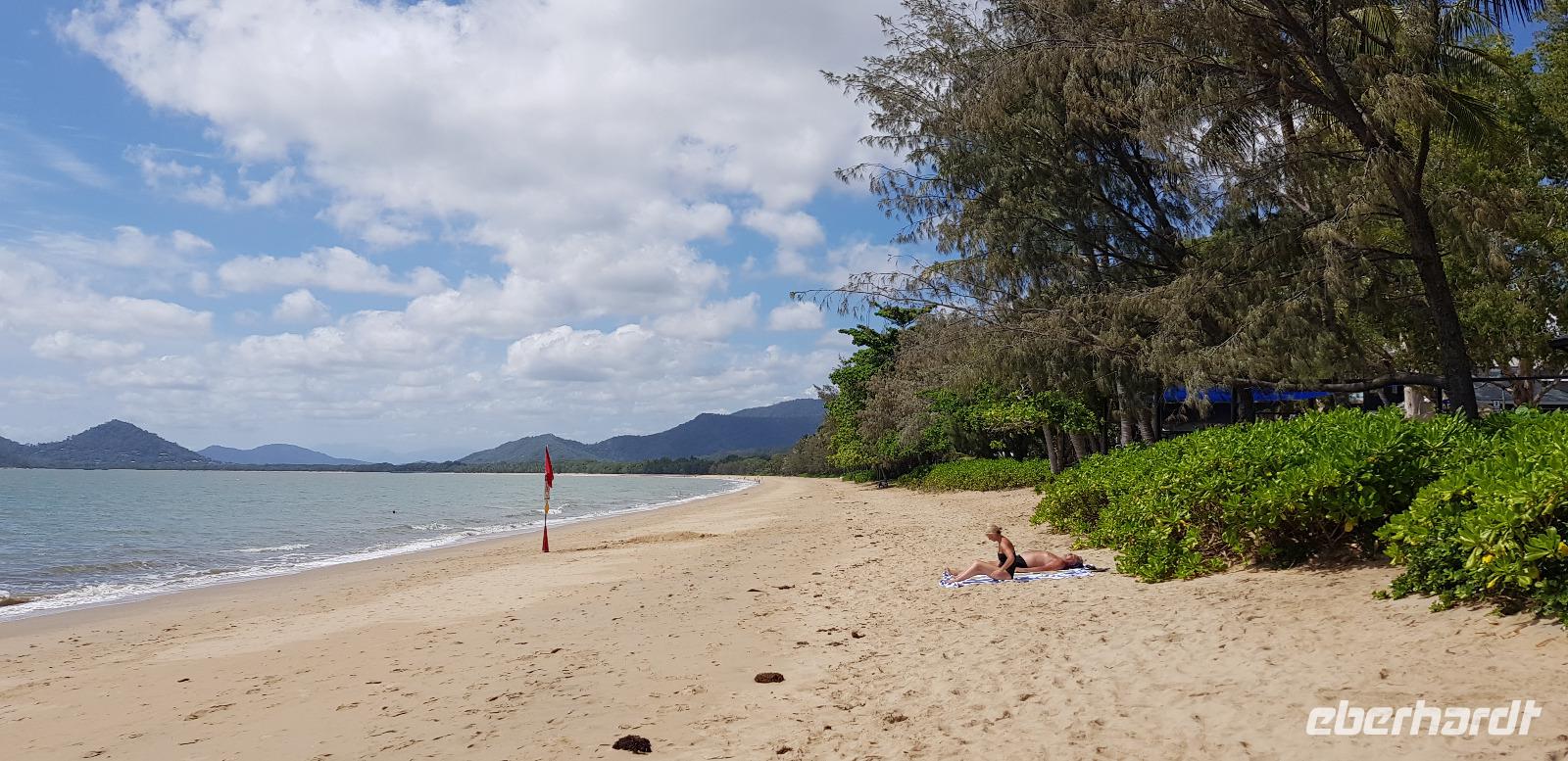 Am frühen Morgen landen wir an der Ostküste von Australien in Cairns. Hier werden wir von Reiseleiterin Claudine in Empfang genommen. Auch sie kenne ich schon von der letzten Eberhardt Reise im Februar... Wiedersehen macht Freude. ?? Gemeinsam fahren wir ca. 30min zu unserem schicken 5 Sterne Hotel „Peppers Beach Club" in Palm Cove. Wir checken ein und genießen das reichhaltige Frühstücksbuffet. Der restliche Tag steht zur freien Verfügung. Die meisten ruhen sich aus oder gehen Baden am schönen Sandstrand gegenüber von der Hotelanlage. Abends treffen wir uns für einen kleinen Umtrunk - sponsert by Herrn Eberhardt - es gibt australischen Bundaberg Rum.