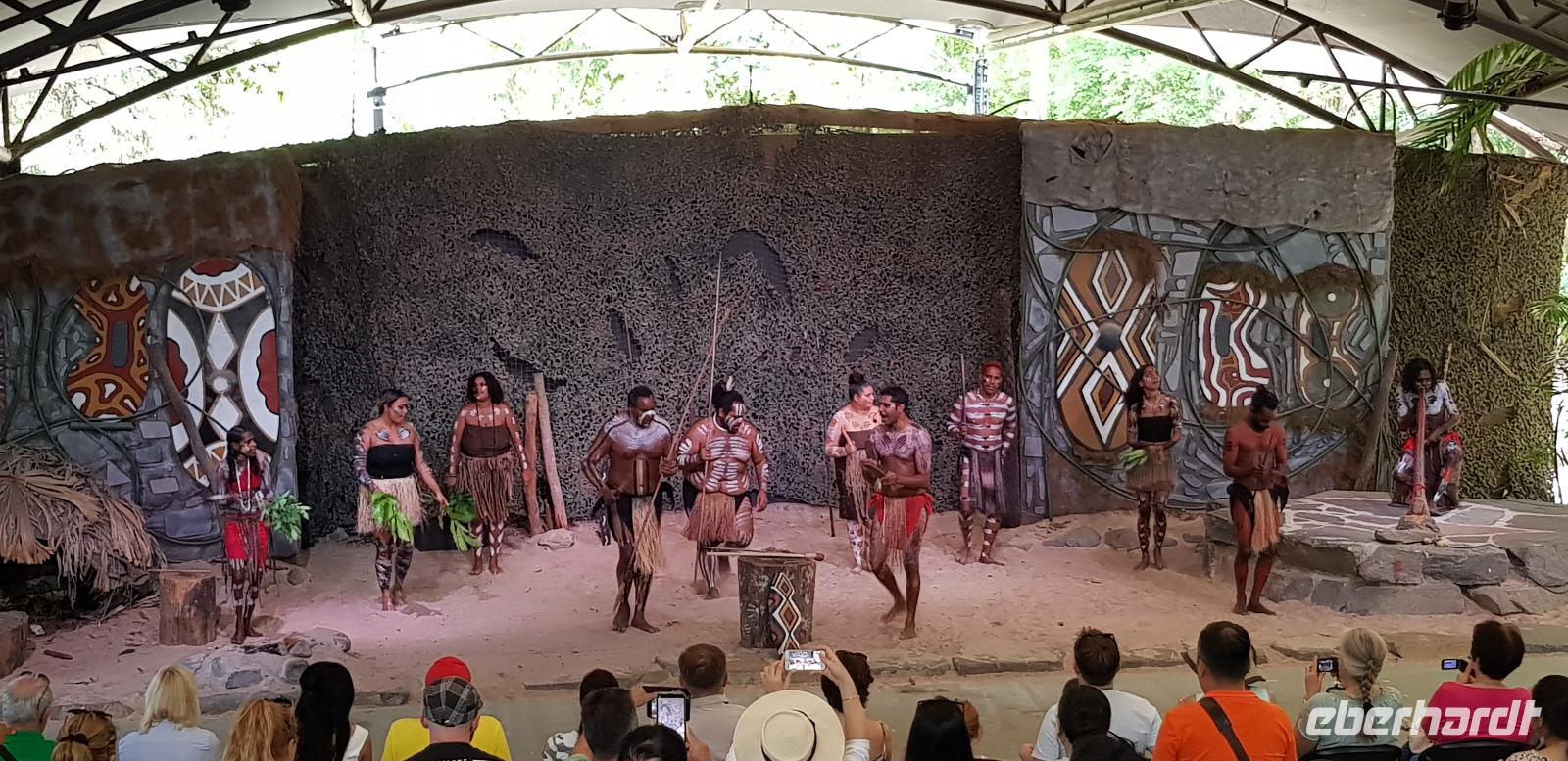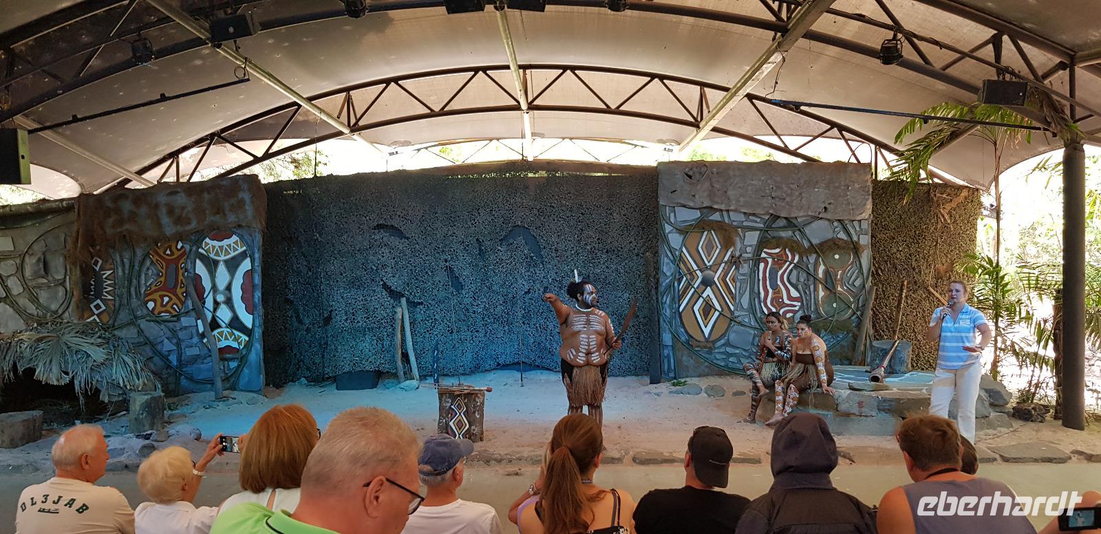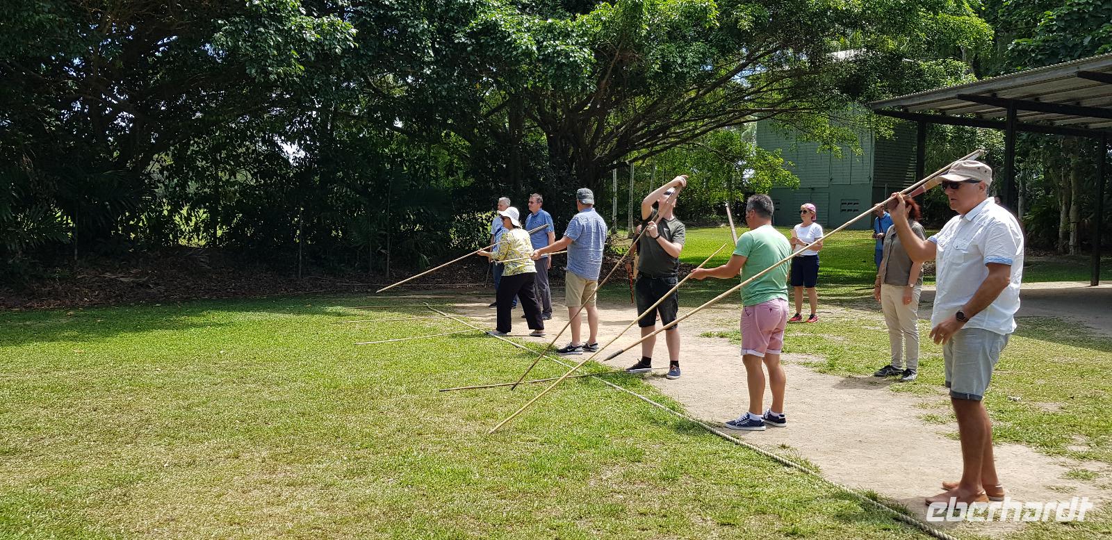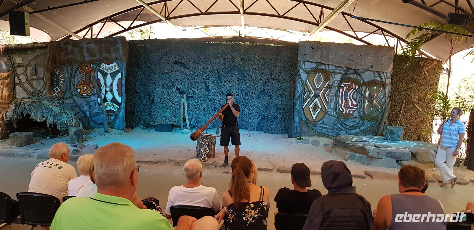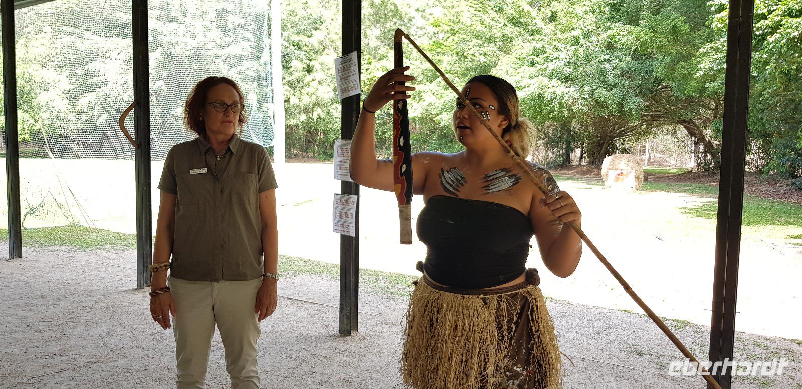 Ein Aborigine Guide versucht uns dabei die richtige Handhabung zu erklären. Zum Spaß der Truppe mit mehr oder weniger großem Erfolg. Anschließend bestaunen wir eine Tanzshows zu Klängen des Australischen Nationalinstruments Didgeridoo. Wir erhalten außerdem eine Erklärung über die Naturmedizin der Einheimischen, wirklich interessant wie viele Pflanzen doch giftig sind.