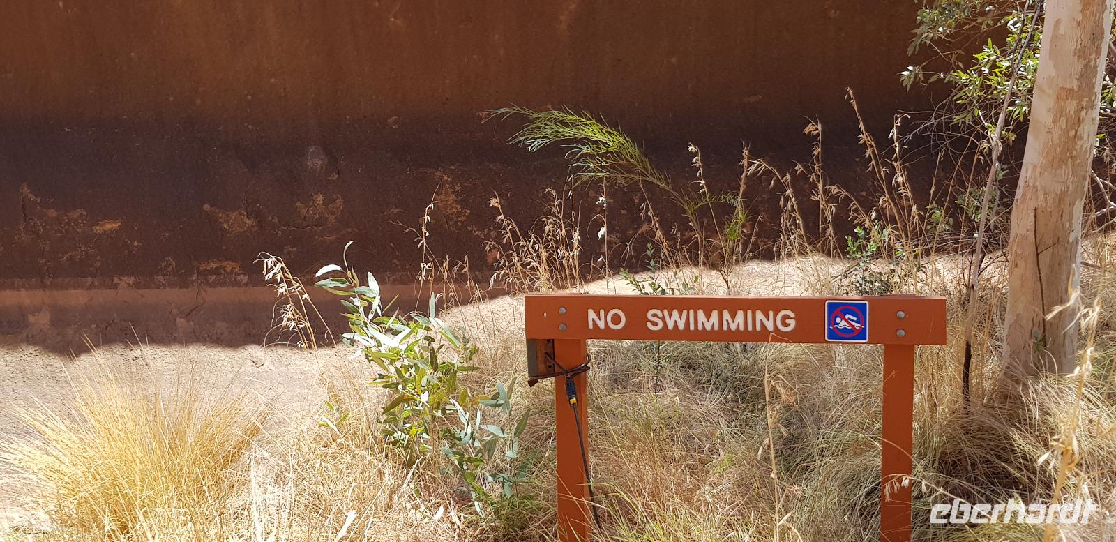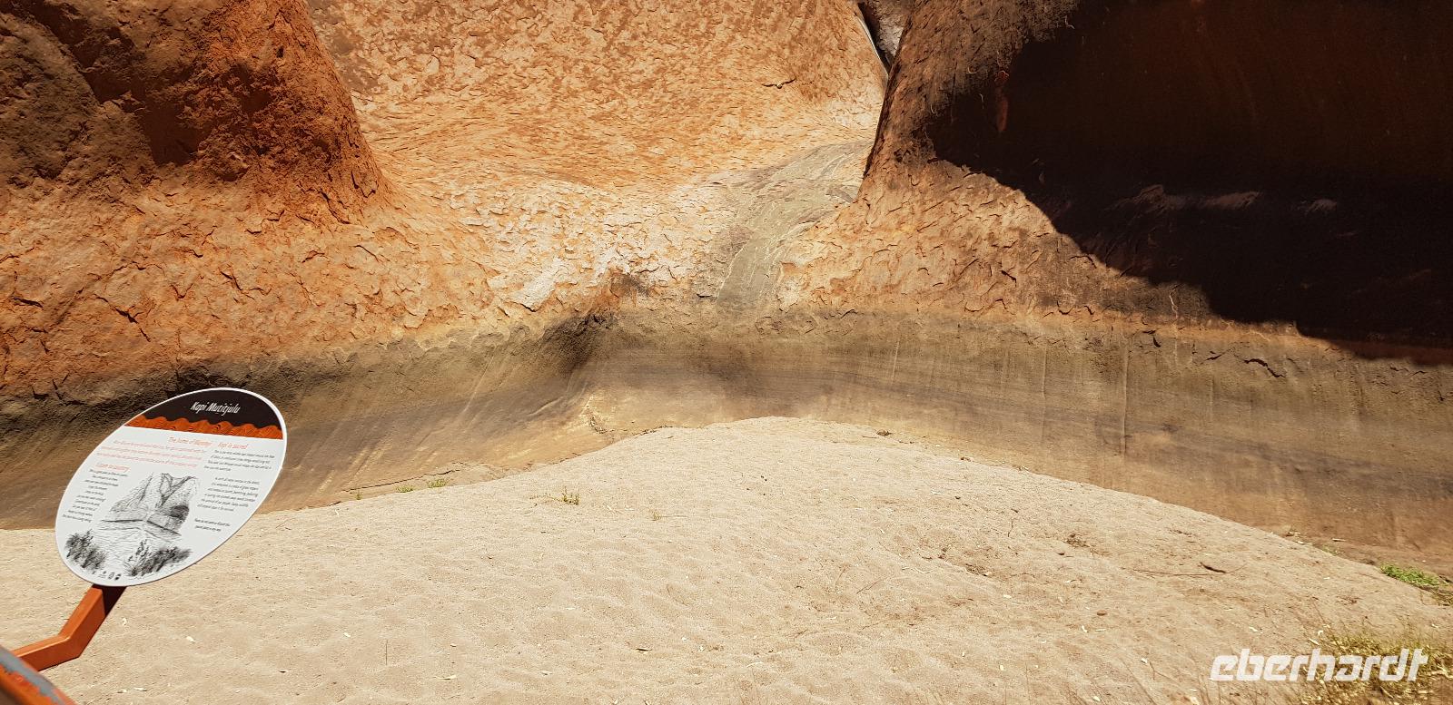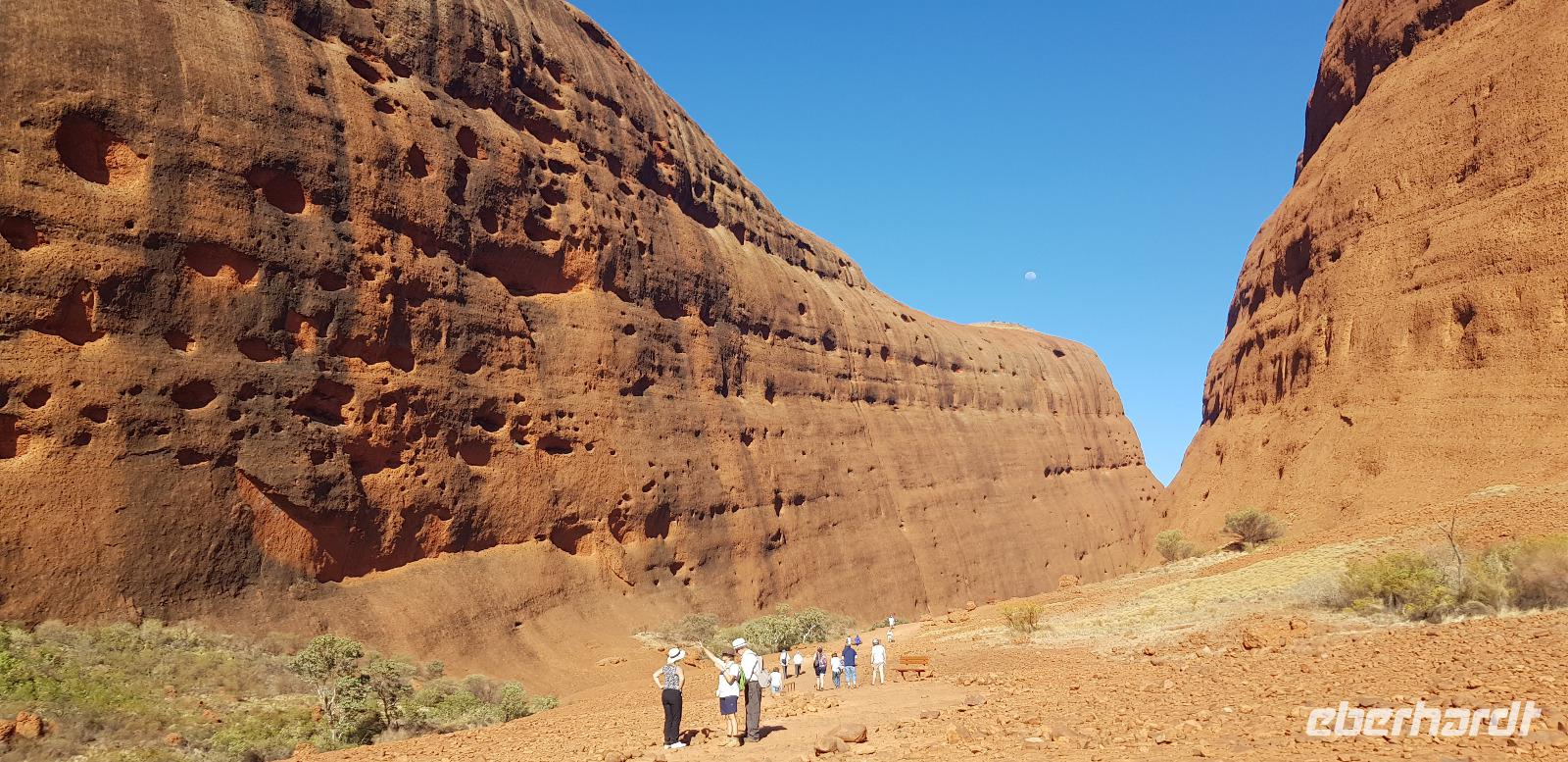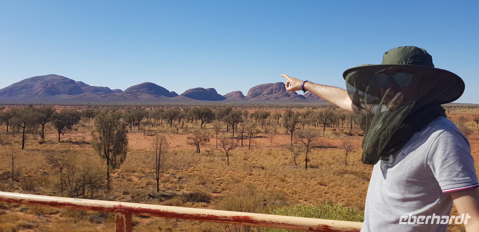 Zur Zeit ist es wieder sehr sehr trocken, weshalb kein Wasser drin ist. Eva erklärt... wir müssten nur tief genug graben, dann würden wir auf Wasser stoßen. So viel Zeit haben wir nun nicht und wir füllen unsere Flaschen einfach mit sauberem Trinkwasser vom Bus-Kanister wieder auf. Danach fahren wir ca. 10min weiter, um den Malawalk abzulaufen. Am Ende erreichen wir die ehemalige Aufstiegsstelle die den Berg hinauf führte. Doch seid ein paar Tagen ist der Aufstieg nun per Gesetz verboten. Besser so... es sind einfach zu viele Unfälle passiert. Nach dem schönen Spaziergang fahren wir in unser schickes „Sails in the Desert" 5 Sterne Resort, wo wir etwas Freizeit bis zum Nachmittag haben. Am Nachmittag stehen die Kata Tju?as / Olgas auf dem Programm, benannt nach Olga von Württemberg. Wir fahren ca. 30min durch das Outback und stoppen unterwegs an einem kleinen Aussichtspunkt. Danach spazieren wir zu den gigantischen Felsformationen, wo wir von lästigen Fliegen attackiert werden. Zum Glück haben die meisten von uns Ihr Fliegennetz über den Hut. Nach dem einstündigen Spaziergang bei über 35 Grad, fahren wir zurück zum Ayers Rock.