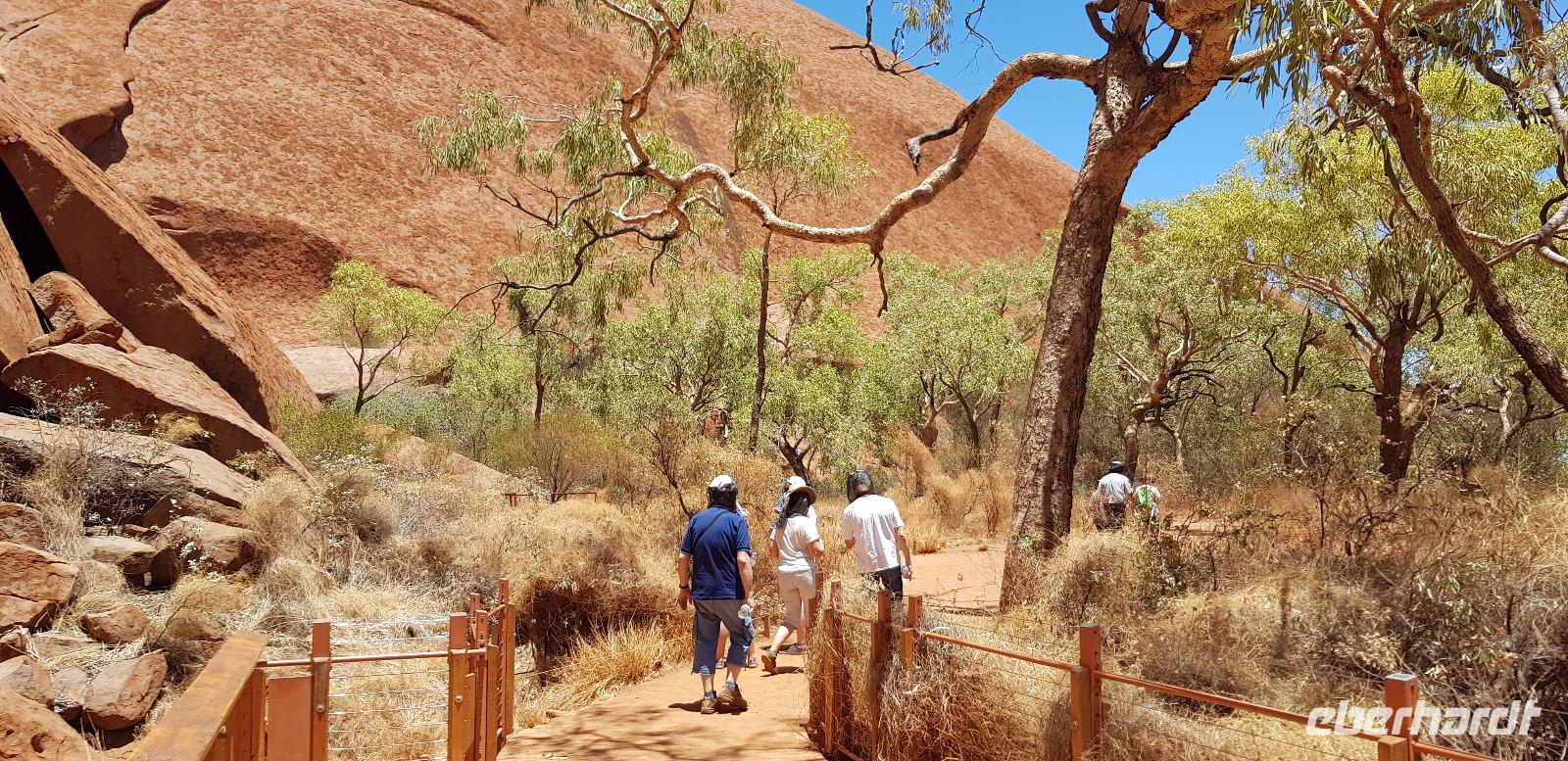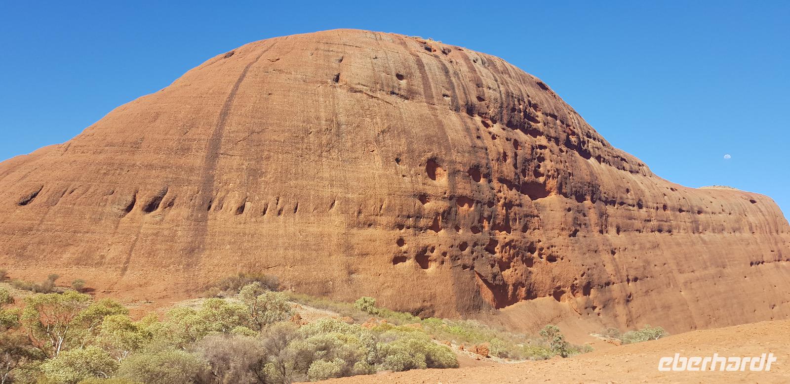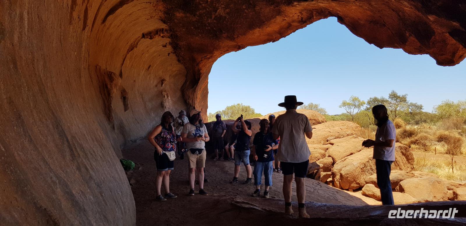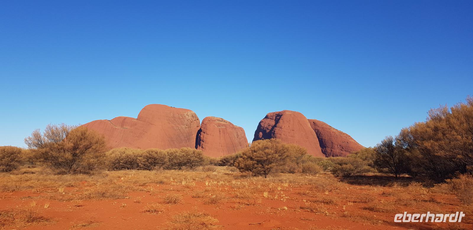 Zur Zeit ist es wieder sehr sehr trocken, weshalb kein Wasser drin ist. Eva erklärt... wir müssten nur tief genug graben, dann würden wir auf Wasser stoßen. So viel Zeit haben wir nun nicht und wir füllen unsere Flaschen einfach mit sauberem Trinkwasser vom Bus-Kanister wieder auf. Danach fahren wir ca. 10min weiter, um den Malawalk abzulaufen. Am Ende erreichen wir die ehemalige Aufstiegsstelle die den Berg hinauf führte. Doch seid ein paar Tagen ist der Aufstieg nun per Gesetz verboten. Besser so... es sind einfach zu viele Unfälle passiert. Nach dem schönen Spaziergang fahren wir in unser schickes „Sails in the Desert" 5 Sterne Resort, wo wir etwas Freizeit bis zum Nachmittag haben. Am Nachmittag stehen die Kata Tju?as / Olgas auf dem Programm, benannt nach Olga von Württemberg. Wir fahren ca. 30min durch das Outback und stoppen unterwegs an einem kleinen Aussichtspunkt. Danach spazieren wir zu den gigantischen Felsformationen, wo wir von lästigen Fliegen attackiert werden. Zum Glück haben die meisten von uns Ihr Fliegennetz über den Hut. Nach dem einstündigen Spaziergang bei über 35 Grad, fahren wir zurück zum Ayers Rock.