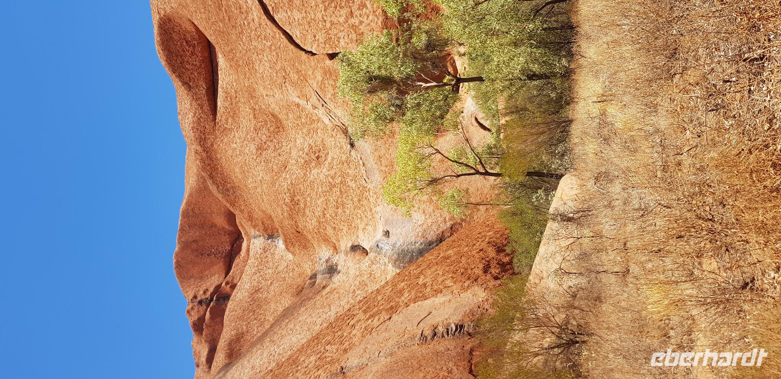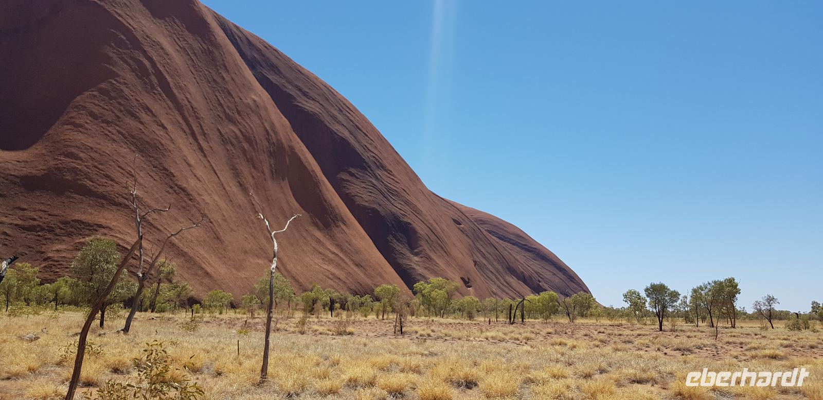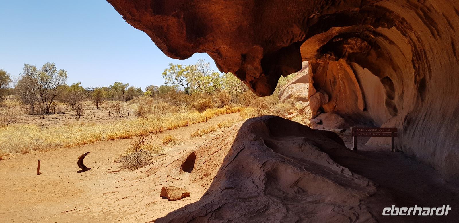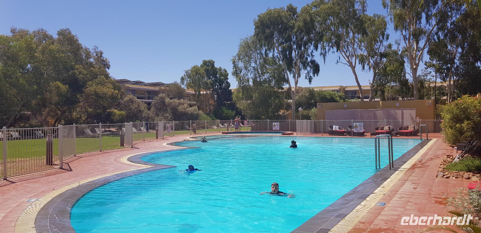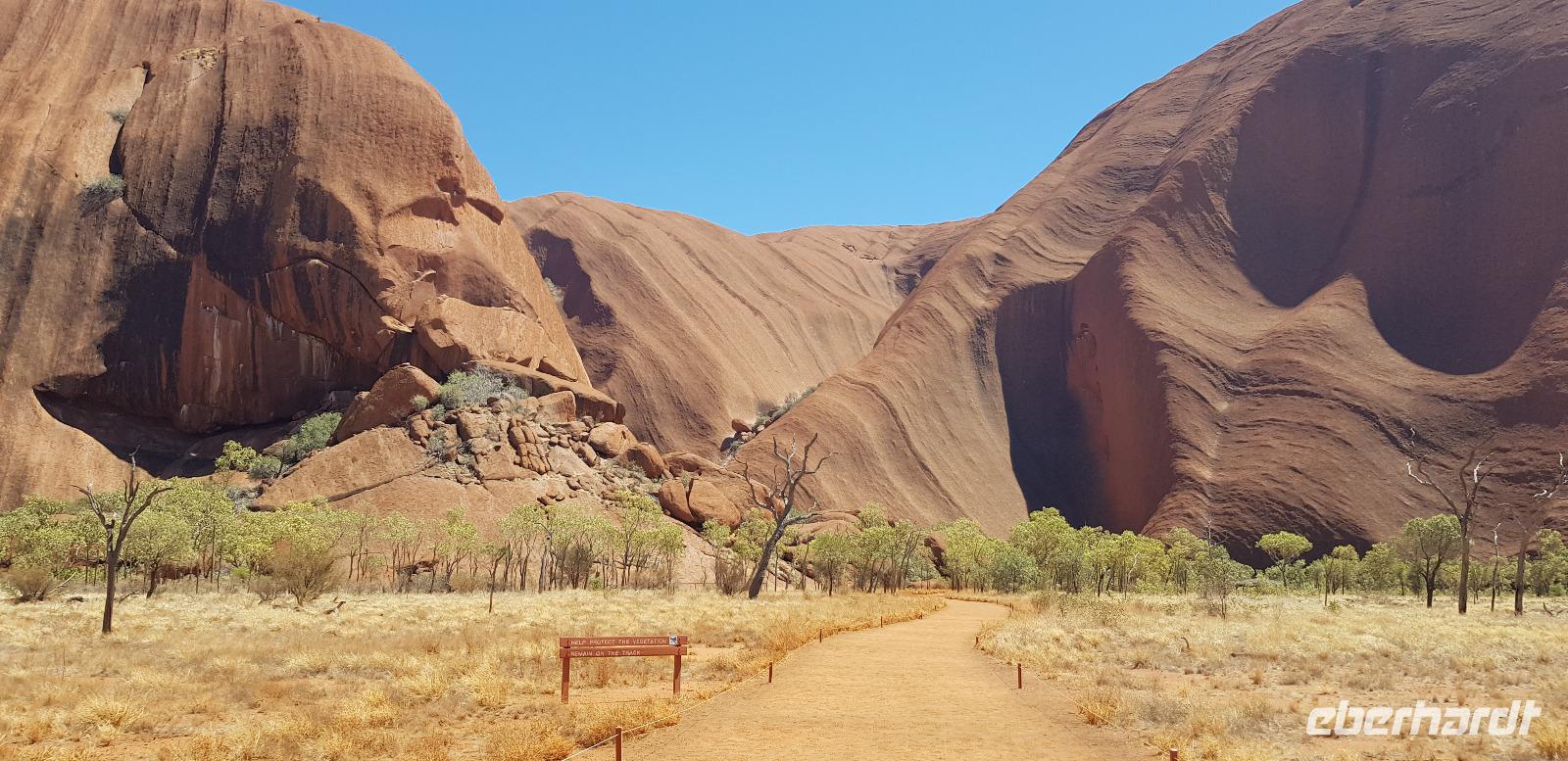 Zur Zeit ist es wieder sehr sehr trocken, weshalb kein Wasser drin ist. Eva erklärt... wir müssten nur tief genug graben, dann würden wir auf Wasser stoßen. So viel Zeit haben wir nun nicht und wir füllen unsere Flaschen einfach mit sauberem Trinkwasser vom Bus-Kanister wieder auf. Danach fahren wir ca. 10min weiter, um den Malawalk abzulaufen. Am Ende erreichen wir die ehemalige Aufstiegsstelle die den Berg hinauf führte. Doch seid ein paar Tagen ist der Aufstieg nun per Gesetz verboten. Besser so... es sind einfach zu viele Unfälle passiert. Nach dem schönen Spaziergang fahren wir in unser schickes „Sails in the Desert" 5 Sterne Resort, wo wir etwas Freizeit bis zum Nachmittag haben. Am Nachmittag stehen die Kata Tju?as / Olgas auf dem Programm, benannt nach Olga von Württemberg. Wir fahren ca. 30min durch das Outback und stoppen unterwegs an einem kleinen Aussichtspunkt. Danach spazieren wir zu den gigantischen Felsformationen, wo wir von lästigen Fliegen attackiert werden. Zum Glück haben die meisten von uns Ihr Fliegennetz über den Hut. Nach dem einstündigen Spaziergang bei über 35 Grad, fahren wir zurück zum Ayers Rock.