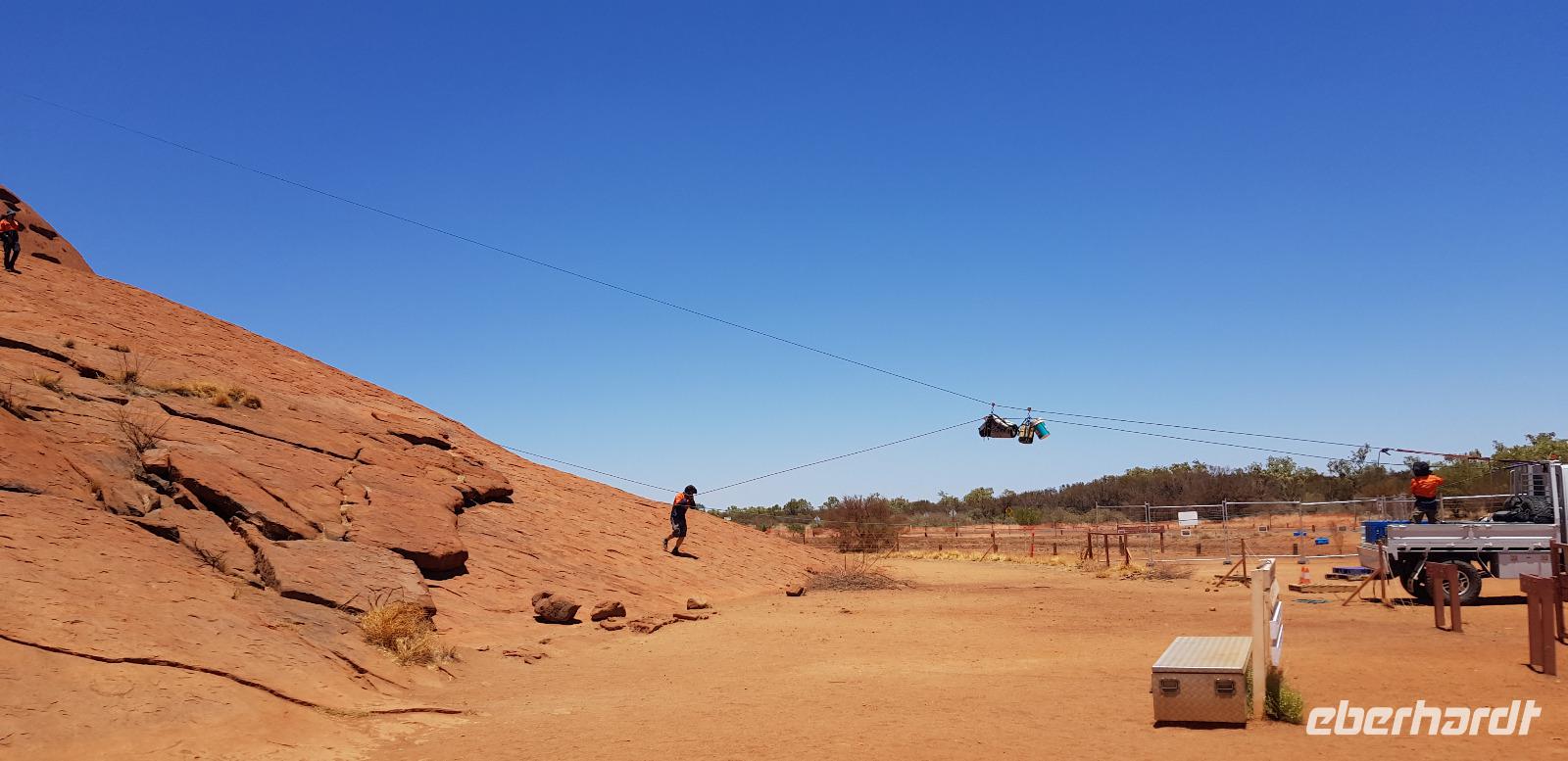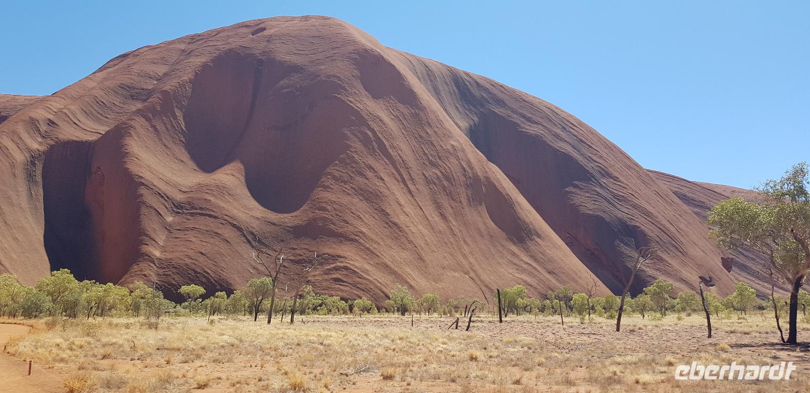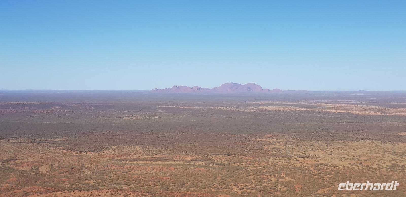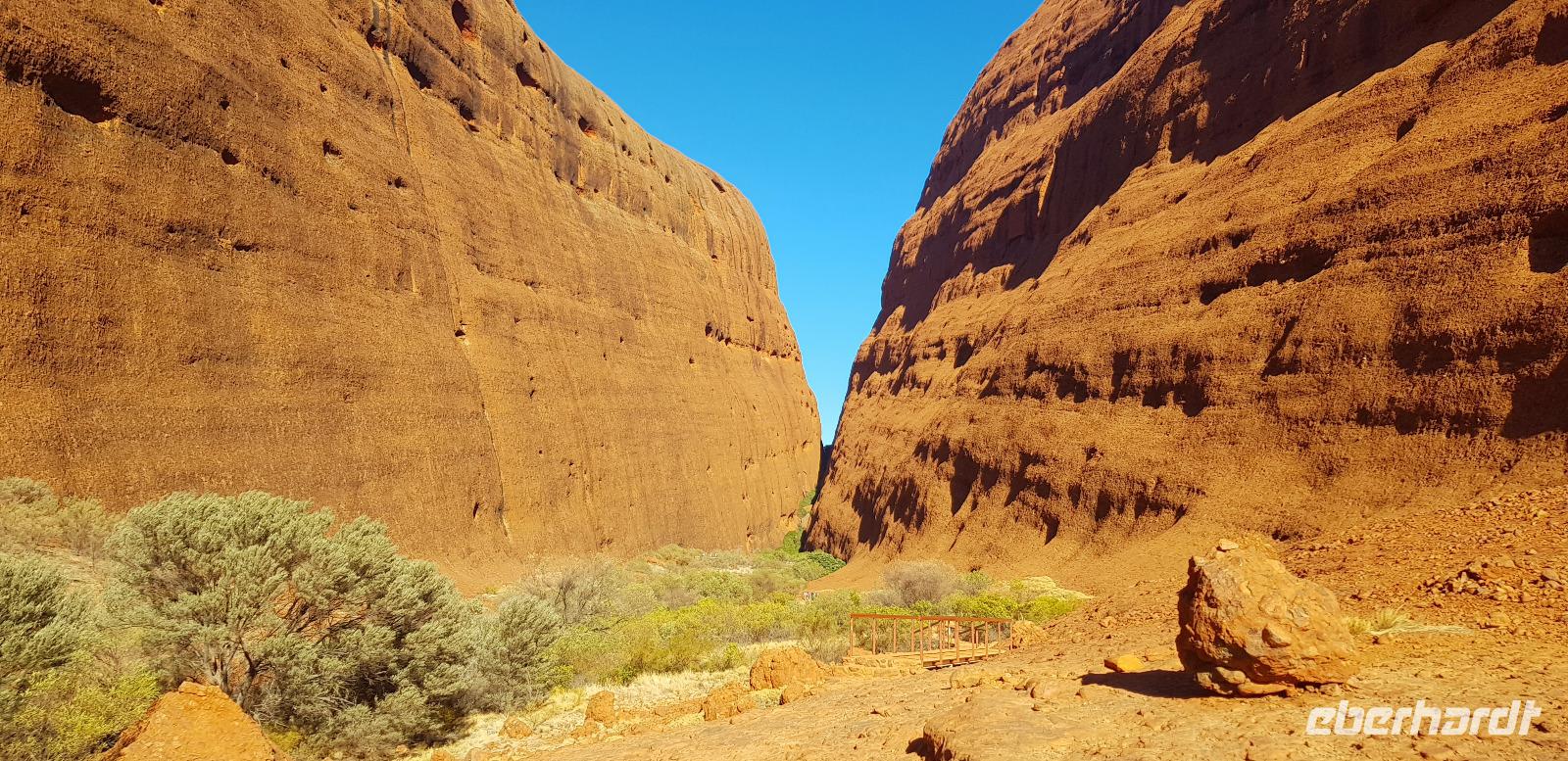 Zur Zeit ist es wieder sehr sehr trocken, weshalb kein Wasser drin ist. Eva erklärt... wir müssten nur tief genug graben, dann würden wir auf Wasser stoßen. So viel Zeit haben wir nun nicht und wir füllen unsere Flaschen einfach mit sauberem Trinkwasser vom Bus-Kanister wieder auf. Danach fahren wir ca. 10min weiter, um den Malawalk abzulaufen. Am Ende erreichen wir die ehemalige Aufstiegsstelle die den Berg hinauf führte. Doch seid ein paar Tagen ist der Aufstieg nun per Gesetz verboten. Besser so... es sind einfach zu viele Unfälle passiert. Nach dem schönen Spaziergang fahren wir in unser schickes „Sails in the Desert" 5 Sterne Resort, wo wir etwas Freizeit bis zum Nachmittag haben. Am Nachmittag stehen die Kata Tju?as / Olgas auf dem Programm, benannt nach Olga von Württemberg. Wir fahren ca. 30min durch das Outback und stoppen unterwegs an einem kleinen Aussichtspunkt. Danach spazieren wir zu den gigantischen Felsformationen, wo wir von lästigen Fliegen attackiert werden. Zum Glück haben die meisten von uns Ihr Fliegennetz über den Hut. Nach dem einstündigen Spaziergang bei über 35 Grad, fahren wir zurück zum Ayers Rock.