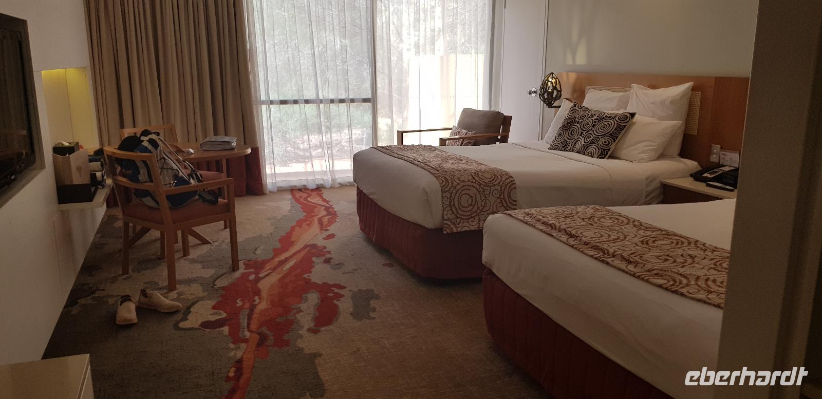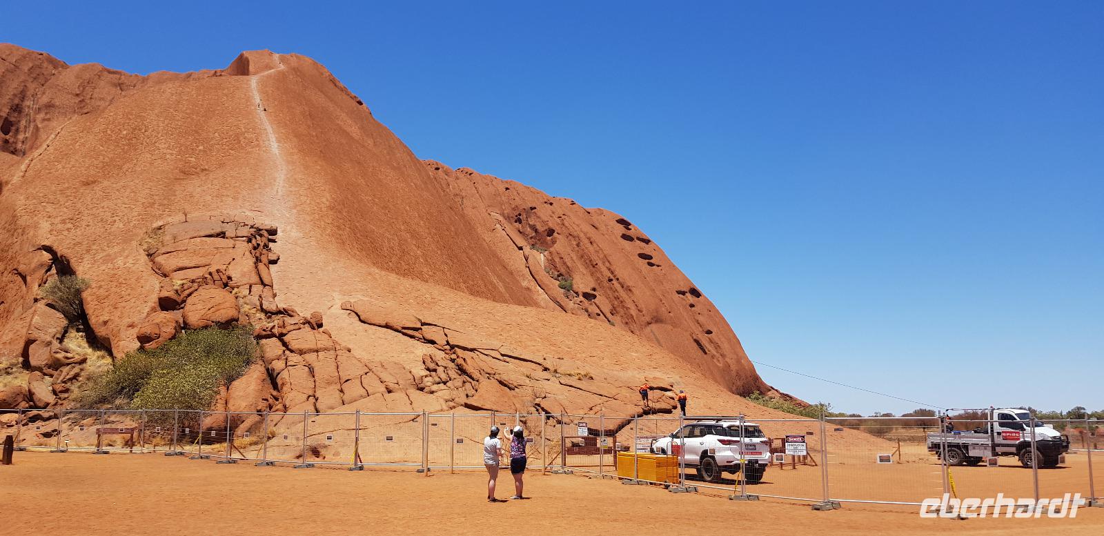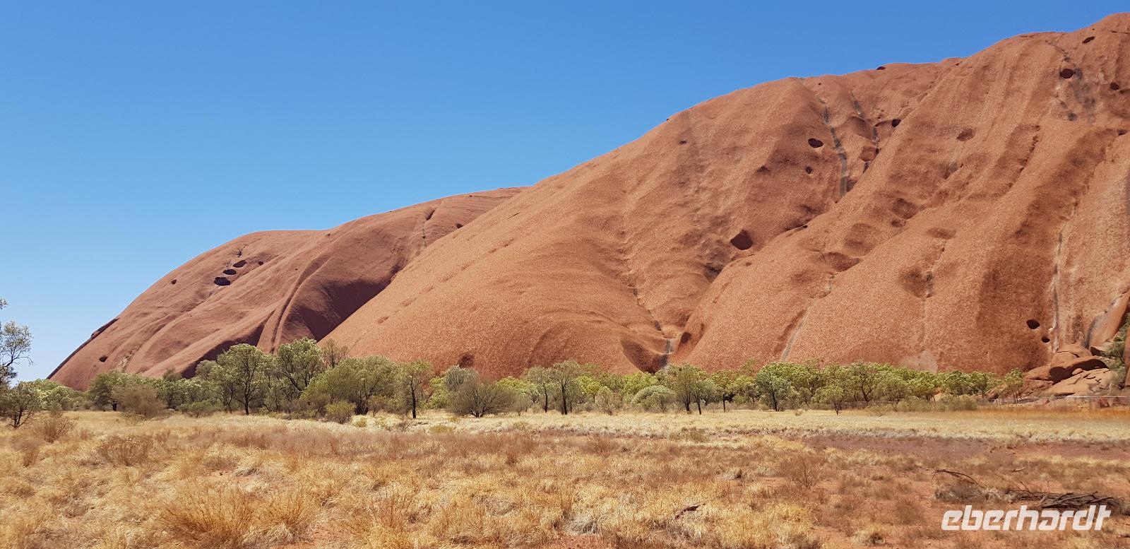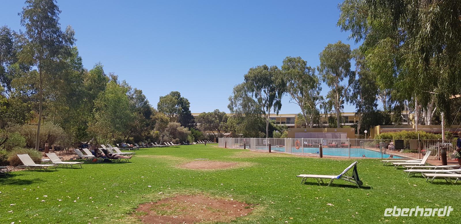 Zur Zeit ist es wieder sehr sehr trocken, weshalb kein Wasser drin ist. Eva erklärt... wir müssten nur tief genug graben, dann würden wir auf Wasser stoßen. So viel Zeit haben wir nun nicht und wir füllen unsere Flaschen einfach mit sauberem Trinkwasser vom Bus-Kanister wieder auf. Danach fahren wir ca. 10min weiter, um den Malawalk abzulaufen. Am Ende erreichen wir die ehemalige Aufstiegsstelle die den Berg hinauf führte. Doch seid ein paar Tagen ist der Aufstieg nun per Gesetz verboten. Besser so... es sind einfach zu viele Unfälle passiert. Nach dem schönen Spaziergang fahren wir in unser schickes „Sails in the Desert" 5 Sterne Resort, wo wir etwas Freizeit bis zum Nachmittag haben. Am Nachmittag stehen die Kata Tju?as / Olgas auf dem Programm, benannt nach Olga von Württemberg. Wir fahren ca. 30min durch das Outback und stoppen unterwegs an einem kleinen Aussichtspunkt. Danach spazieren wir zu den gigantischen Felsformationen, wo wir von lästigen Fliegen attackiert werden. Zum Glück haben die meisten von uns Ihr Fliegennetz über den Hut. Nach dem einstündigen Spaziergang bei über 35 Grad, fahren wir zurück zum Ayers Rock.