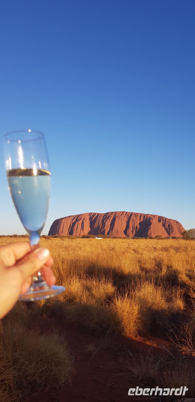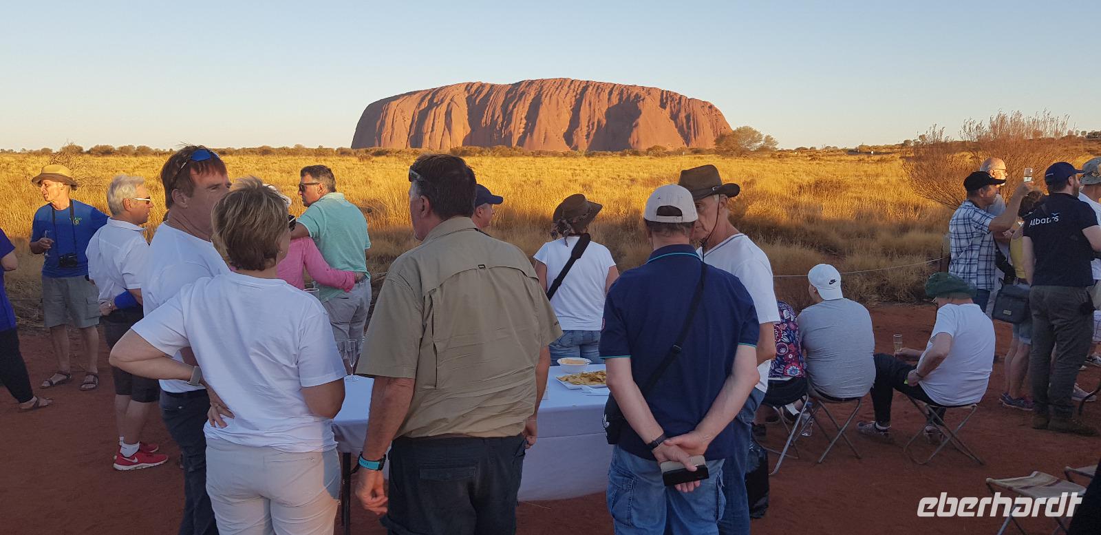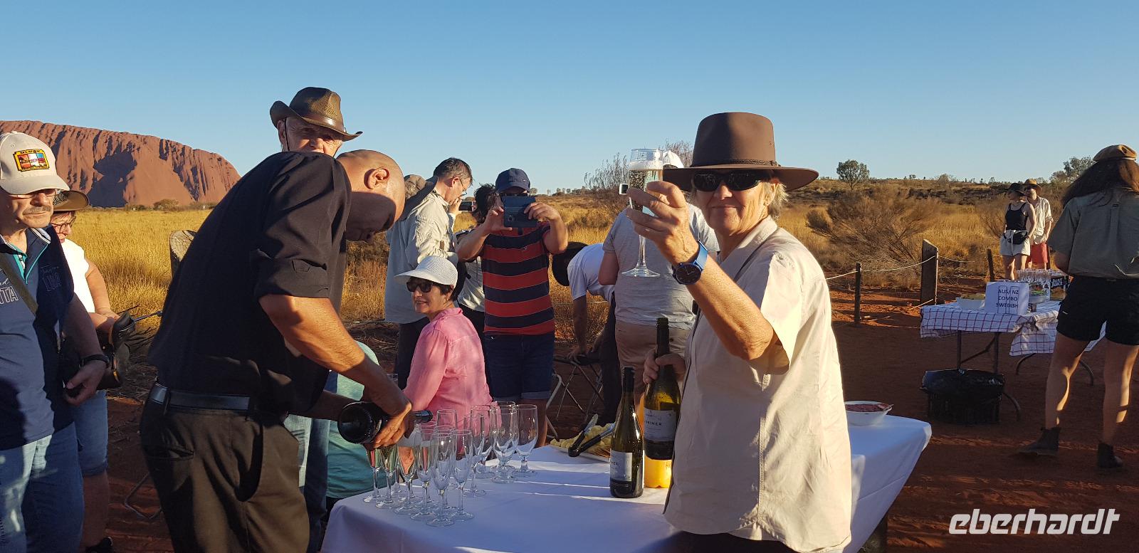Dort blicken wir pünktlich zum Sonnenuntergang mit einem Glas Sekt in der Hand auf den Uluru. Dazu gibt es ein paar Crackers mit Dips und natürlich die grandiose Aussicht mit einem tollen Farbspektakel. Was für ein toller Reisemoment. Zurück im Hotel erwartet uns ein hervorragendes 3-Gänge-Menü.