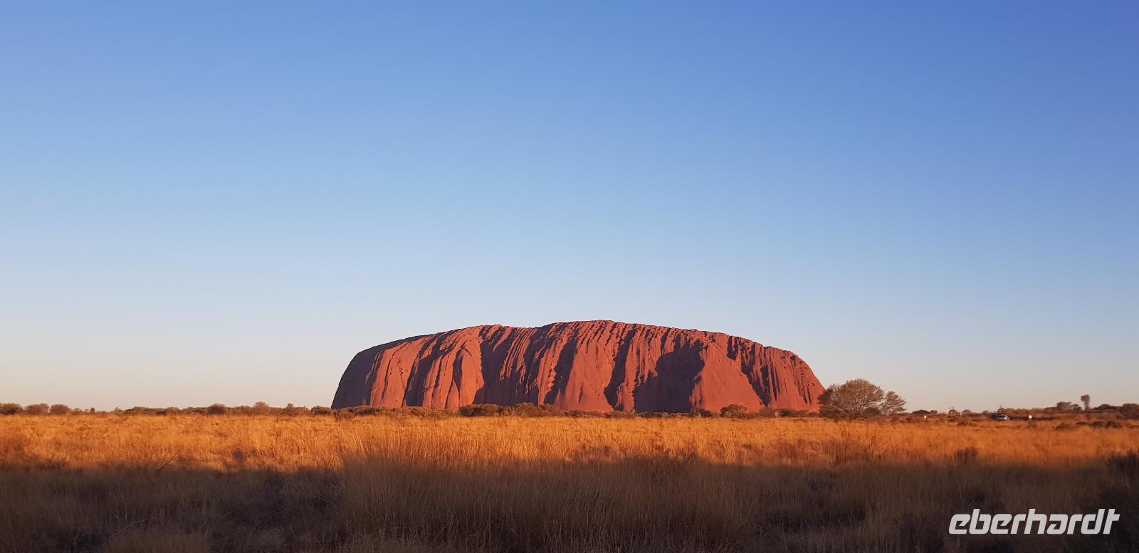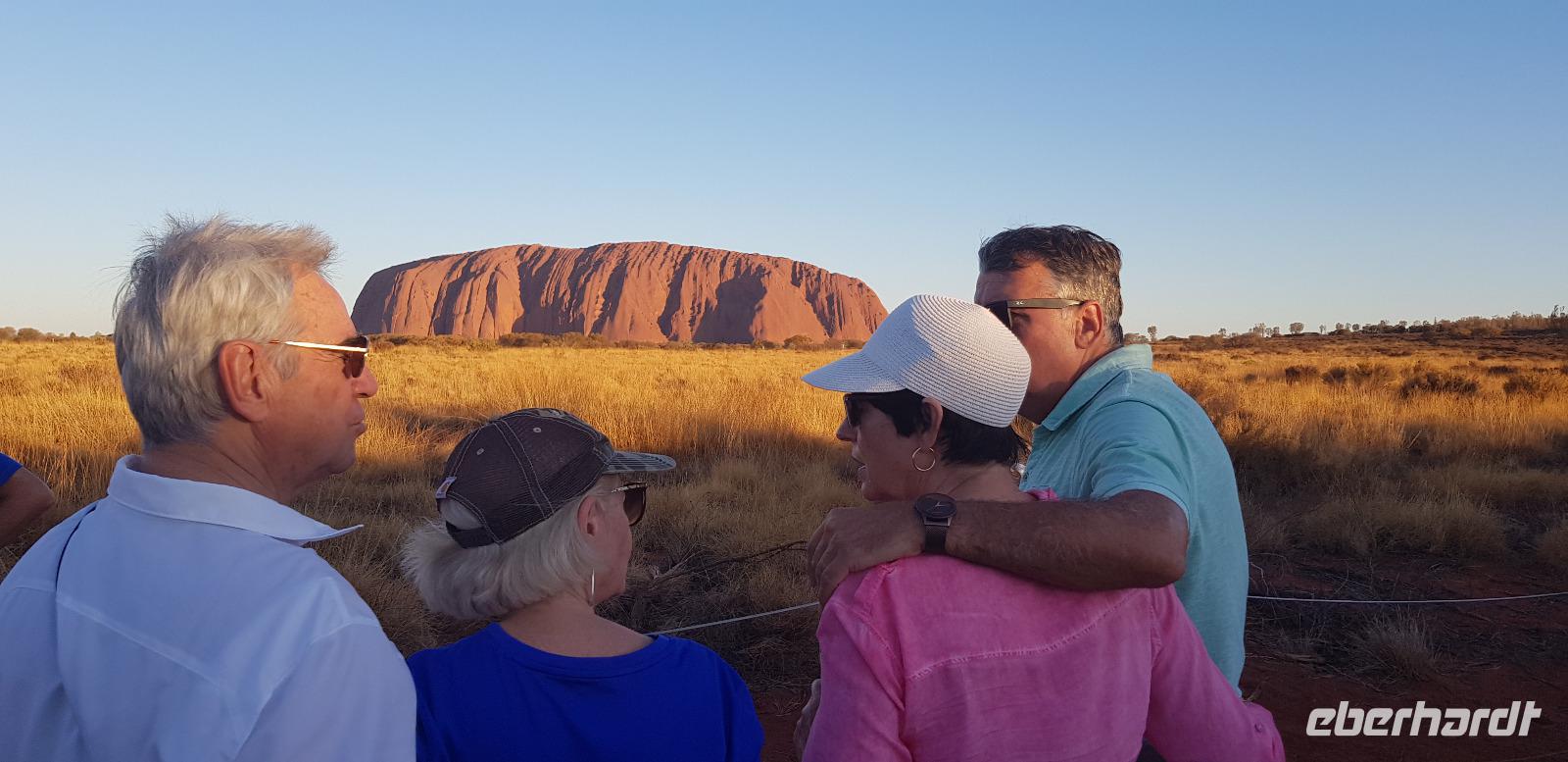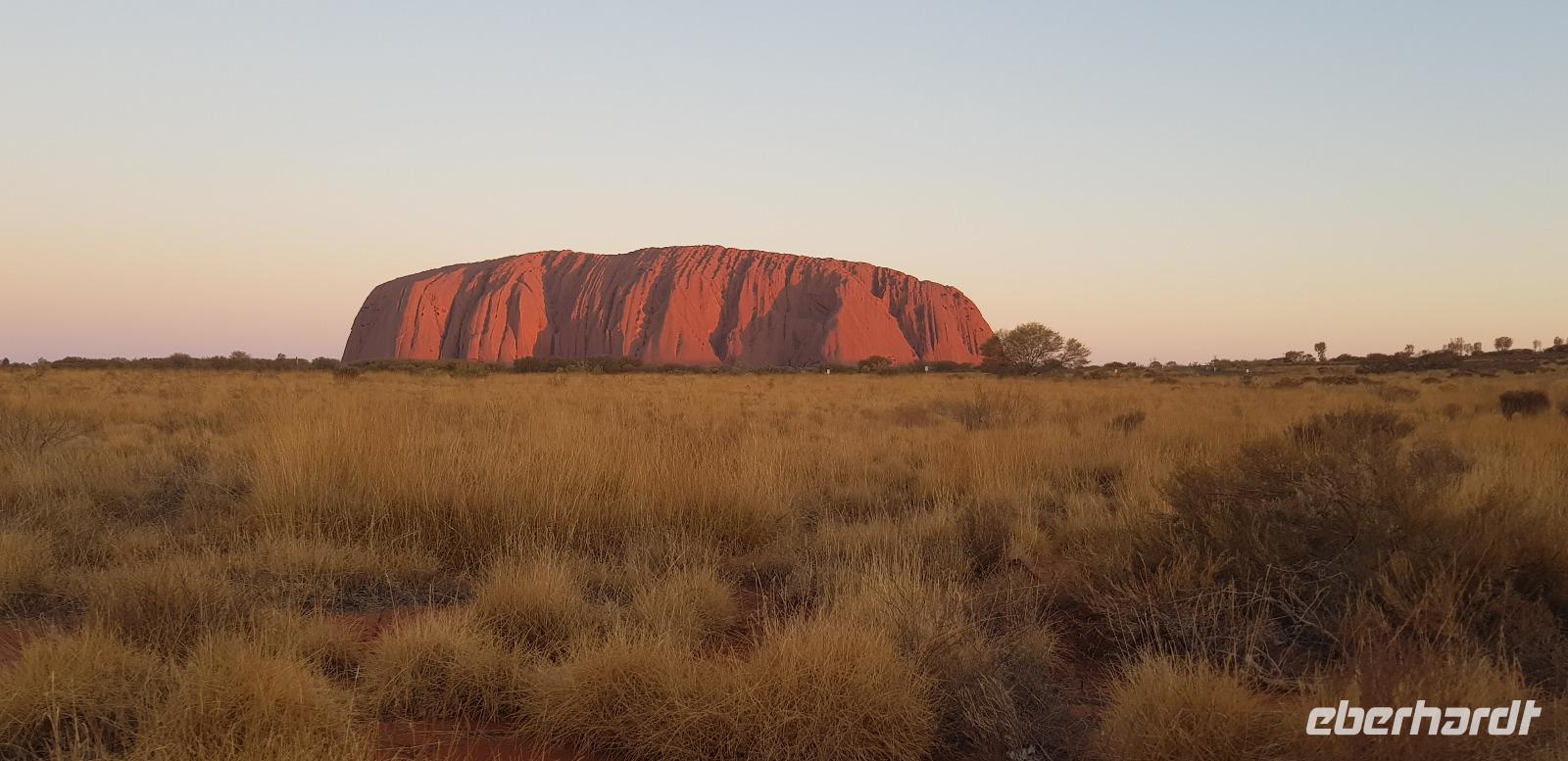 Dort blicken wir pünktlich zum Sonnenuntergang mit einem Glas Sekt in der Hand auf den Uluru. Dazu gibt es ein paar Crackers mit Dips und natürlich die grandiose Aussicht mit einem tollen Farbspektakel. Was für ein toller Reisemoment. Zurück im Hotel erwartet uns ein hervorragendes 3-Gänge-Menü.