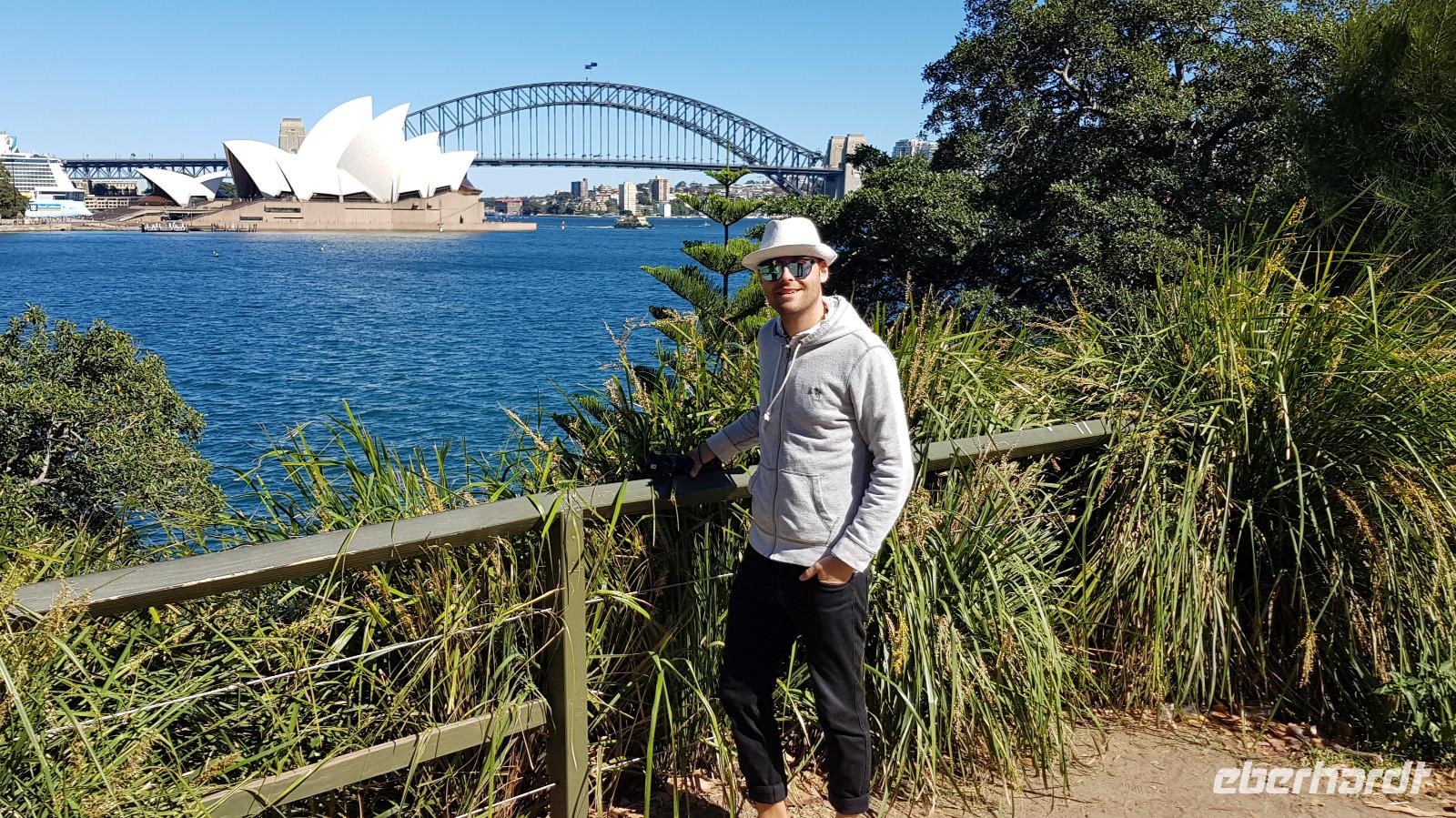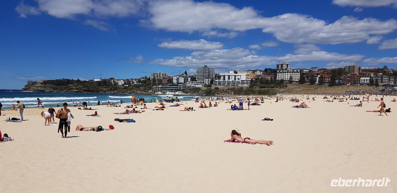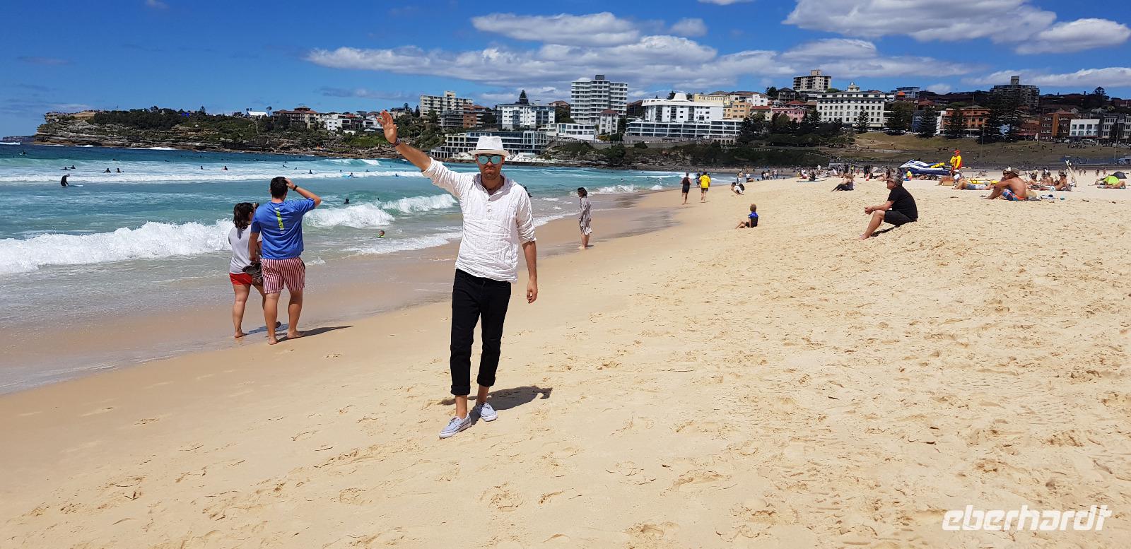 Die Sonne scheint und der Himmel ist wolkenfrei - also beste Voraussetzung für eine tolle Stadtrundfahrt. Mit Uli und unserem Reisebus fahren wir als erstes zur weltbekannten Harbour Bridge, von wo aus wir auf die Sydney Oper blicken. Was für ein toller Gänsehautmoment... für viele geht nun wieder ein Traum in Erfüllung. Weiter geht es durch die Innenstadt zum Botanischen Garten, wo wir die Oper von der anderen Seite aus fotografieren können. Anschließend fahren wir durch Woollomoolo zum Aussichtspunkt am „Jacob Ladders Point" und schließlich zum Bondi Beach. Dort haben wir Freizeit zum Kaffee trinken oder für einen kleinen Strandspaziergang. Wir haben Glück, denn heute ist Sonntag und der Strand ist lebhaft gefüllt. So erleben wir den richtigen Flair und entdecken die ein oder andere Strandschönheit. ;-)