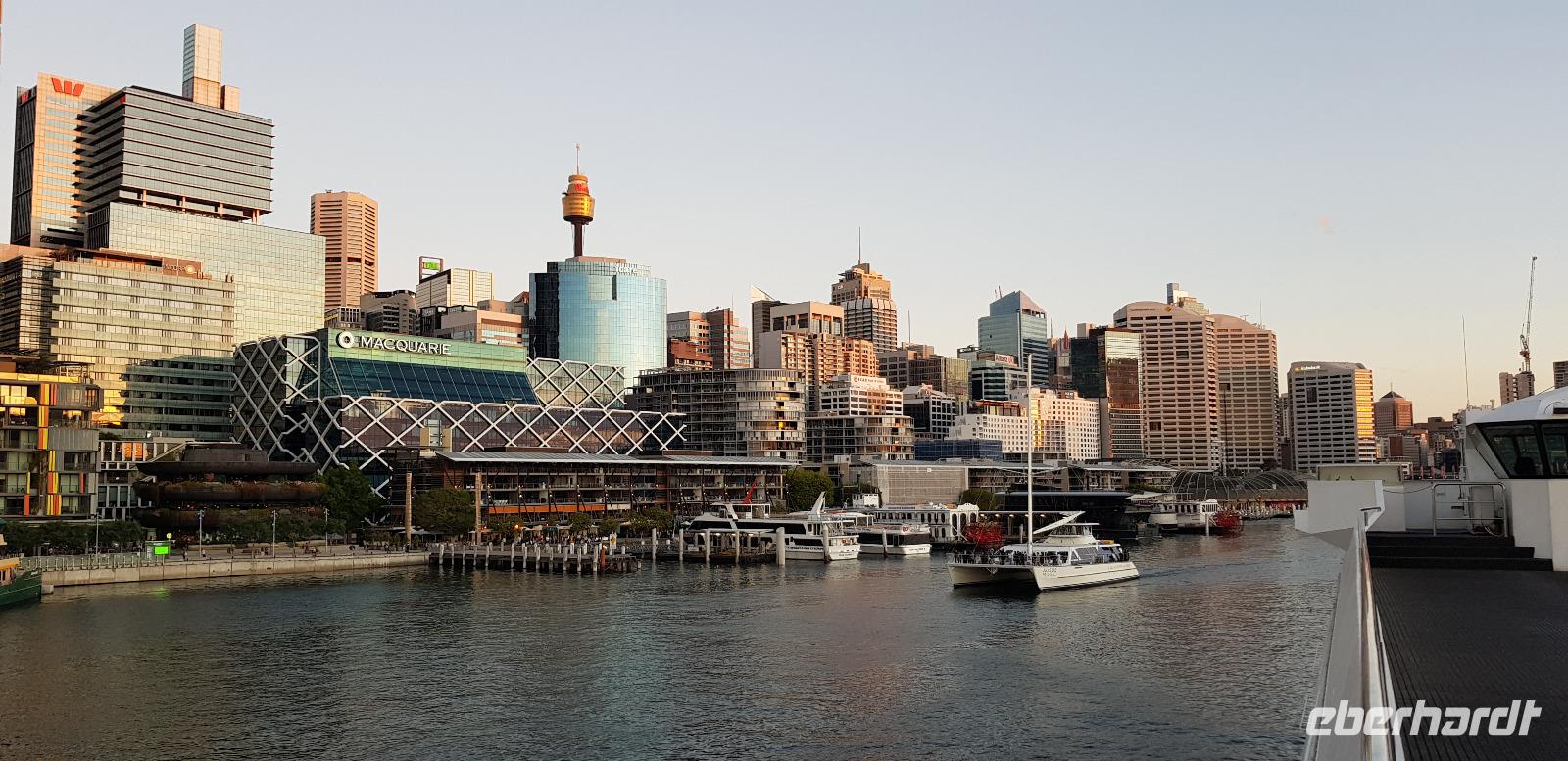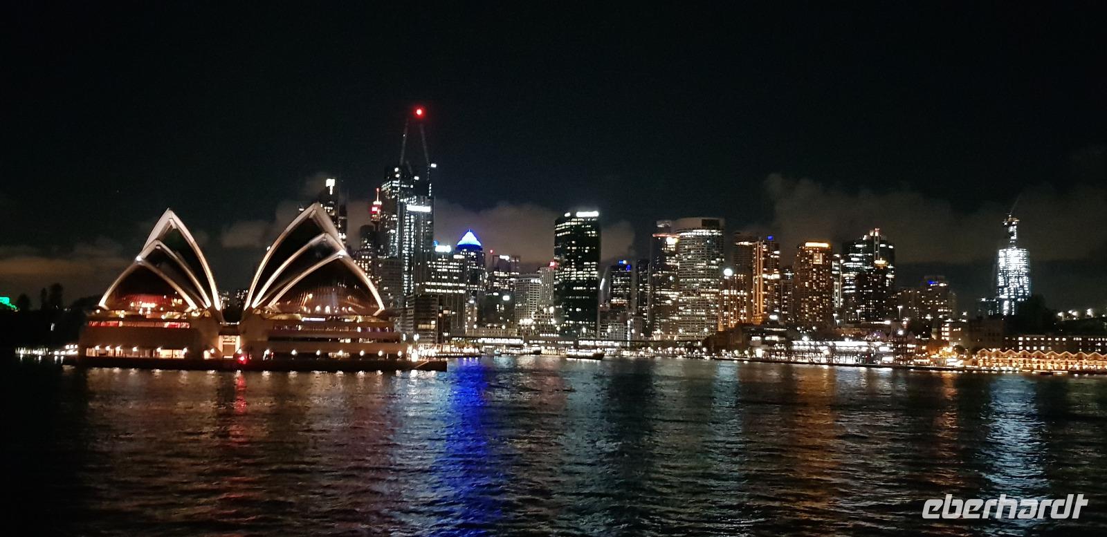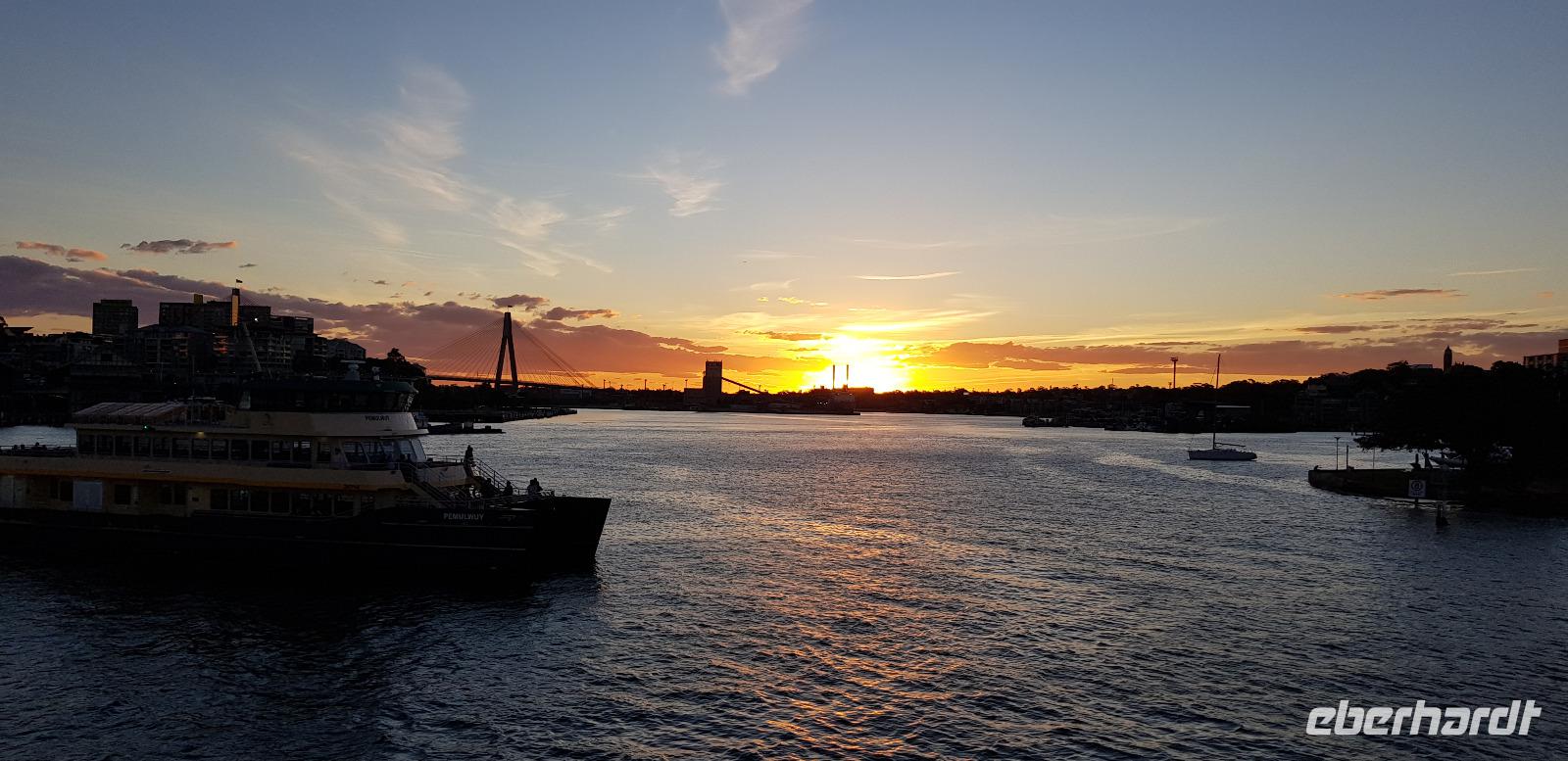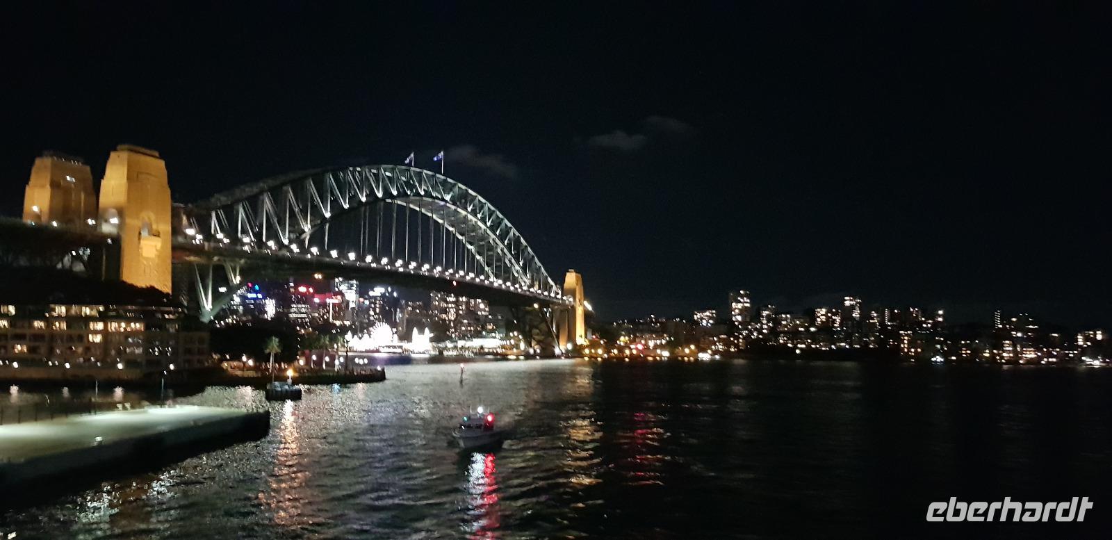 Einige spazieren mit mir durch den Botanischen Garten und zur Harbour Bridge, wo wir auf einen der vier Brücken-Pylonen hinauf fahren und die Aussicht genießen. Am späten Nachmittag sind wir zurück im Hotel, wo wir noch etwas Freizeit genießen... denn um 18:45 steht schon das nächste Highlight auf dem Programm. Wir gehen an Bord eines Ausflugsbootes von Captain Cook-Cruises. Hier erwartet uns bei einer 3 stündigen Hafen Rundfahrt ein schmackhaftes 3 Gänge Menü. Die meisten entscheiden sich für Filet Mignon und einen guten Rot- oder Weißwein. Wir erleben einen traumhaften Sonnenuntergang wie aus dem Bilderbuch und später sehen wir die hell erleuchtete Hochhaus-Skyline an uns vorbeiziehen. Ein toller Abend geht zu Ende und wir spazieren gemeinsam zu unserem Hotel zurück.