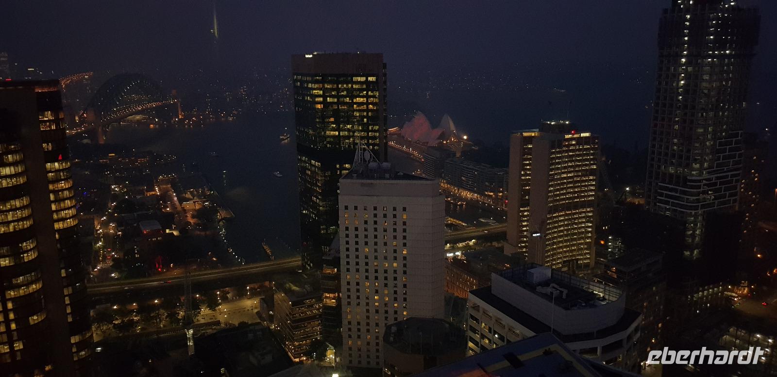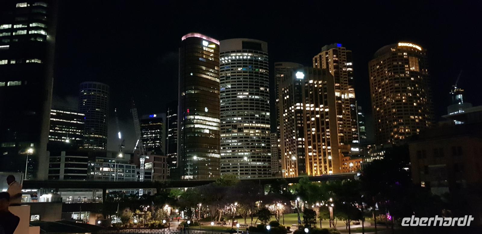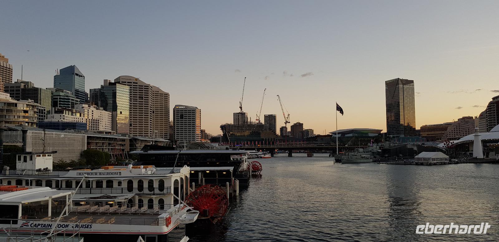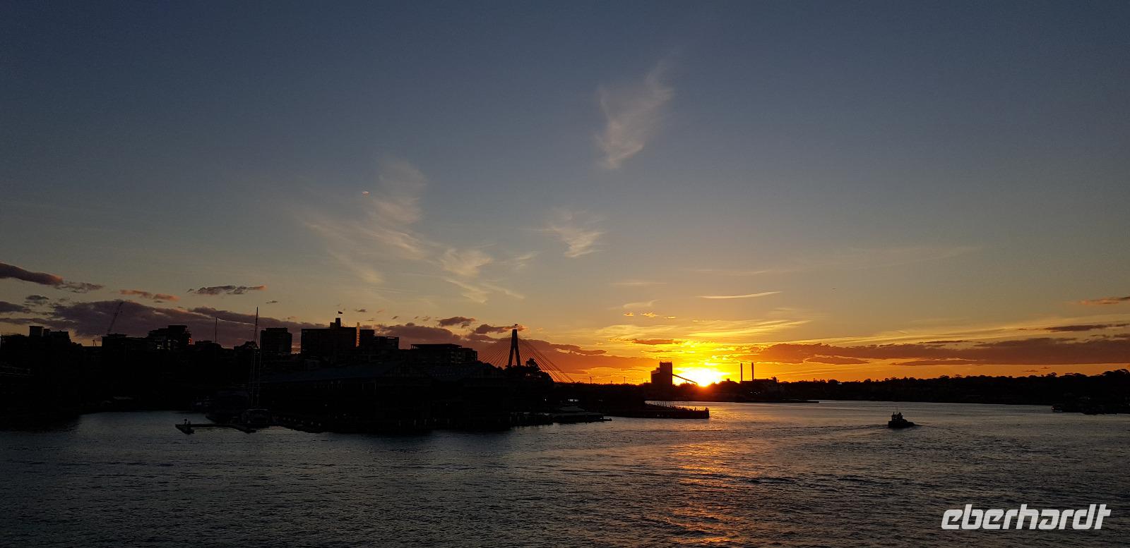 Einige spazieren mit mir durch den Botanischen Garten und zur Harbour Bridge, wo wir auf einen der vier Brücken-Pylonen hinauf fahren und die Aussicht genießen. Am späten Nachmittag sind wir zurück im Hotel, wo wir noch etwas Freizeit genießen... denn um 18:45 steht schon das nächste Highlight auf dem Programm. Wir gehen an Bord eines Ausflugsbootes von Captain Cook-Cruises. Hier erwartet uns bei einer 3 stündigen Hafen Rundfahrt ein schmackhaftes 3 Gänge Menü. Die meisten entscheiden sich für Filet Mignon und einen guten Rot- oder Weißwein. Wir erleben einen traumhaften Sonnenuntergang wie aus dem Bilderbuch und später sehen wir die hell erleuchtete Hochhaus-Skyline an uns vorbeiziehen. Ein toller Abend geht zu Ende und wir spazieren gemeinsam zu unserem Hotel zurück.