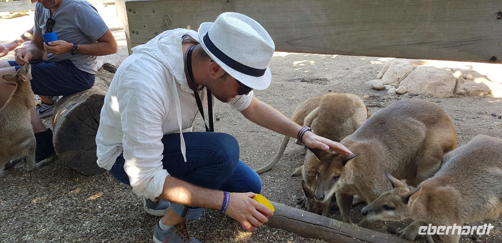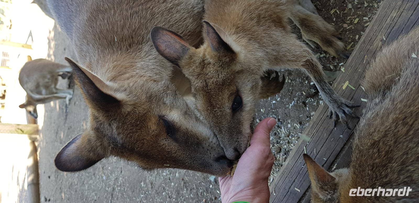 Dort können wir die Koalas und ganz viele Kängurus bzw. Wallabys begutachten. Am niedlichsten sind die kleinen Wallabys - eine Unterart der Kängurus, die wir sogar streicheln und füttern können.