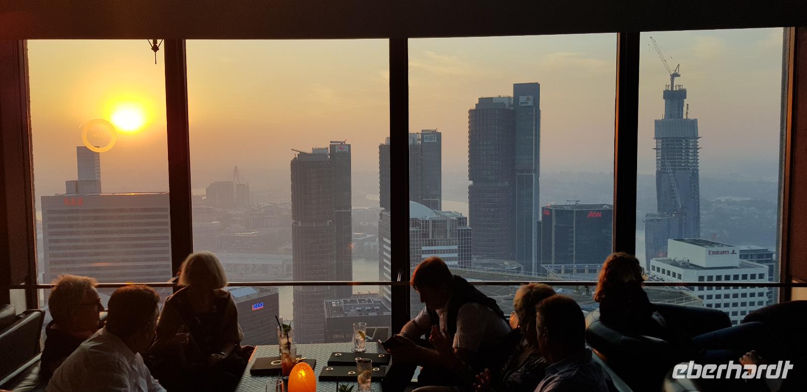 Wer möchte, der kann sich auch für 20$ mit einem Koala fotografieren lassen. Dabei stellt man sich neben einen Holzpfahl, wo ein Koala drauf sitzt. Man darf ihn nicht mehr auf den Arm nehmen, damit man dem Tier nicht mehr so viel Stress aussetzt. Verständlich. Aber es entstehen trotzdem viele tolle Erinnerungsfotos. Danach geht es leider schon wieder nach Sydney zurück. Abends steht allerdings noch ein Highlight auf dem Programm... wir besuchen die O´Bar...nicht die Oper sondern eine schicke Skybar mit grandioser Aussicht auf die Skyline von Sydney. Hier genießen wir 1-2 Cocktails und ein paar Abendbrot-Snacks. Die meisten von uns haben noch keinen Hunger, nach dem reichhaltigen Mittagessen. Die Bar ist eine 360* Drehbar, weshalb wir uns in einer 1 Stunde einmal komplett rings herum drehen und die Wolkenkratzer, die Sydney Oper und die Harbour Bridge von allen Blickwinkeln bestaunen können. Ein toller Abschluss von Sydney und Australien. :-)