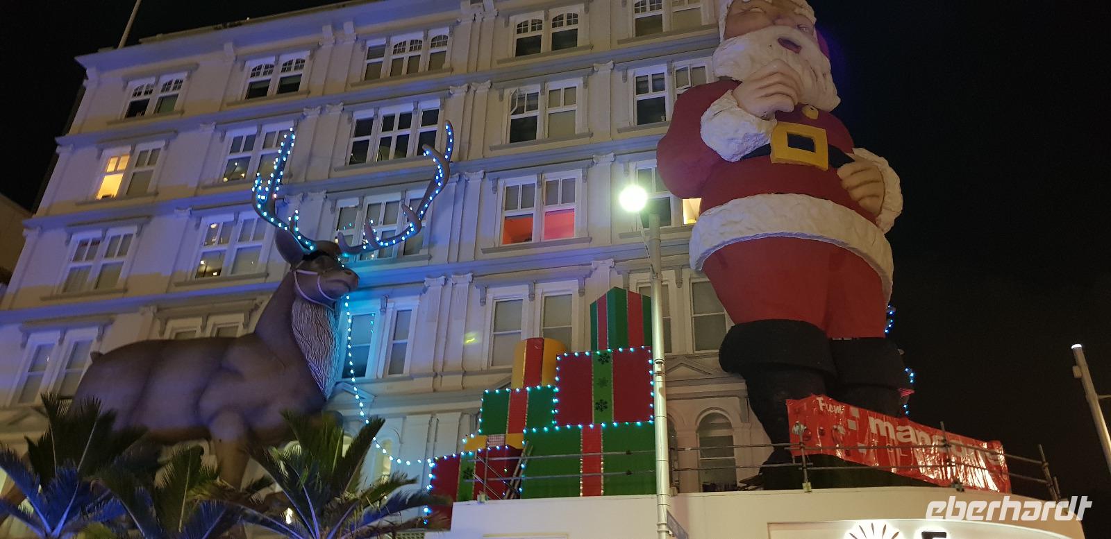Rechtzeitig verlassen wir die von Waldbränden bedrohte Region um Sydney und fliegen morgens ins Grüne Neuseeland. In Auckland angekommen werden wir von Reiseleiterin Doris abgeholt und zum Hotel gebracht. Die nächste 3 Nächte wohnen wir im zentral gelegenen „Sky City" Hotel, genau neben dem berühmten Skytower. Der Nachmittag steht uns zur freien Verfügung. Die meisten nutzen die Zeit zum Ausruhen, bis wir uns im Restaurant zum reichhaltigen Buffet- Abendessen wieder treffen. Anschließend unternehmen wir noch einen kleinen Spaziergang durch die Innenstadt und zur Waterfront. Besonders anschaulich sind einige weihnachtlich geschmückte Läden und Häuserfassaden.