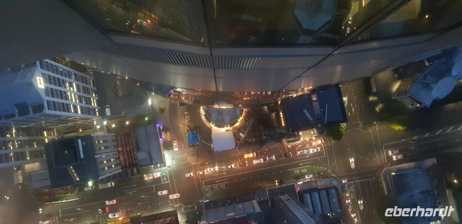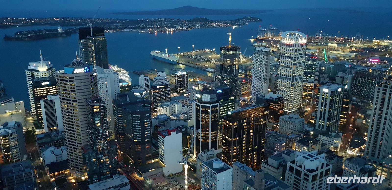 Am frühen Abend treffen wir uns wieder in der Hotellobby, um gemeinsam auf den Skytower hinauf zu fahren. Oben erwartet uns ein tolles 3 Gänge Menü bei grandioser Aussicht. Auch dieses Restaurant verfügt über ein Dreh-Restaurant, welches sich 1x in der Stunde komplett rings herum dreht. Nach dem Essen kommen einige noch eine Etage tiefer mit, um einen Absacker-Cocktail zu trinken. Nun sehen wir die Skyline auch bei Dunkelheit. Ein schöner Tag geht zu Ende.