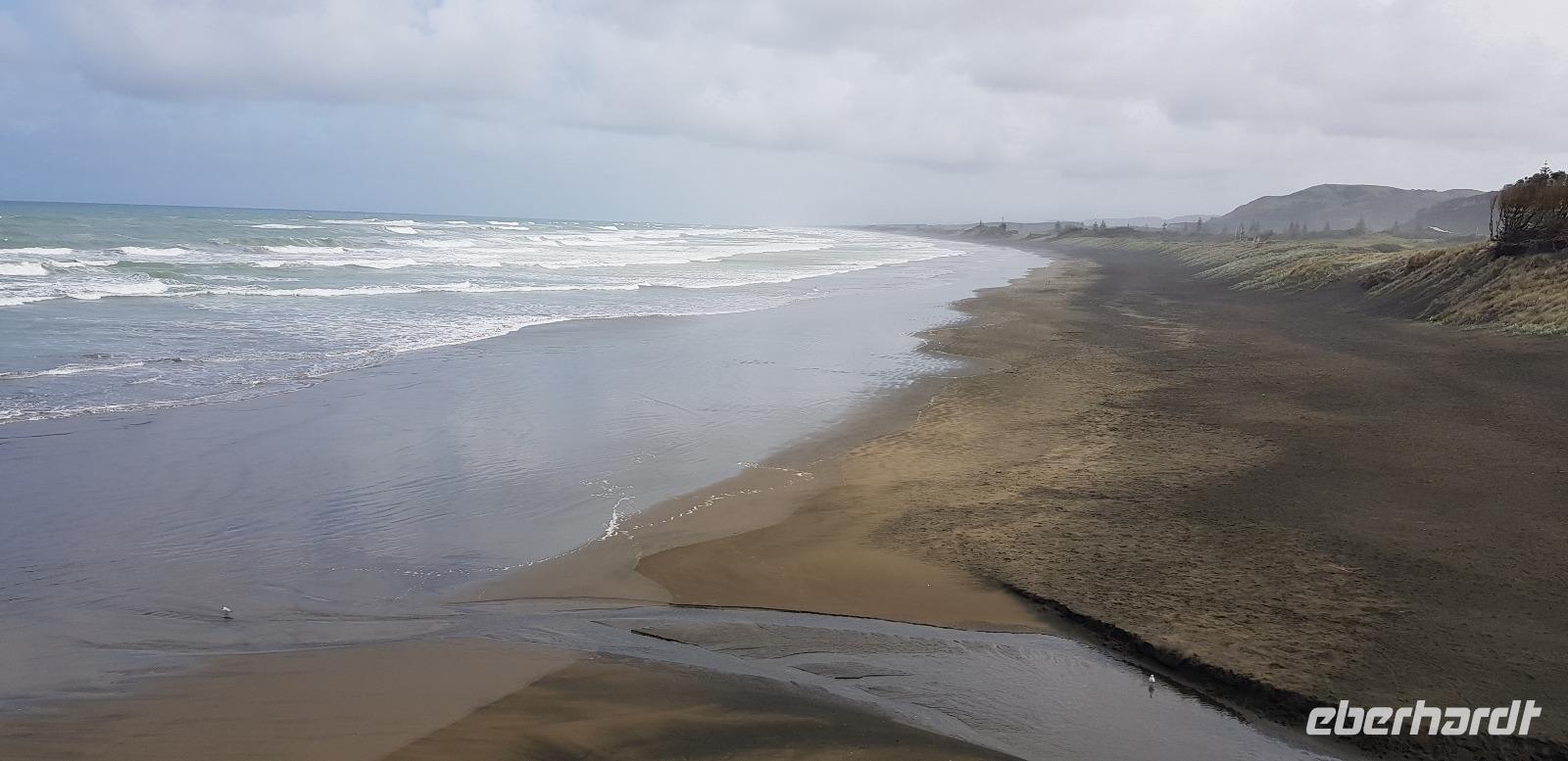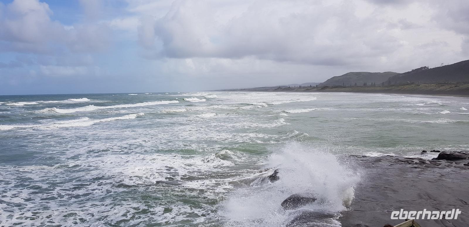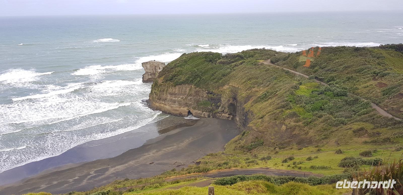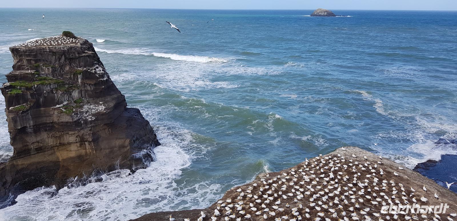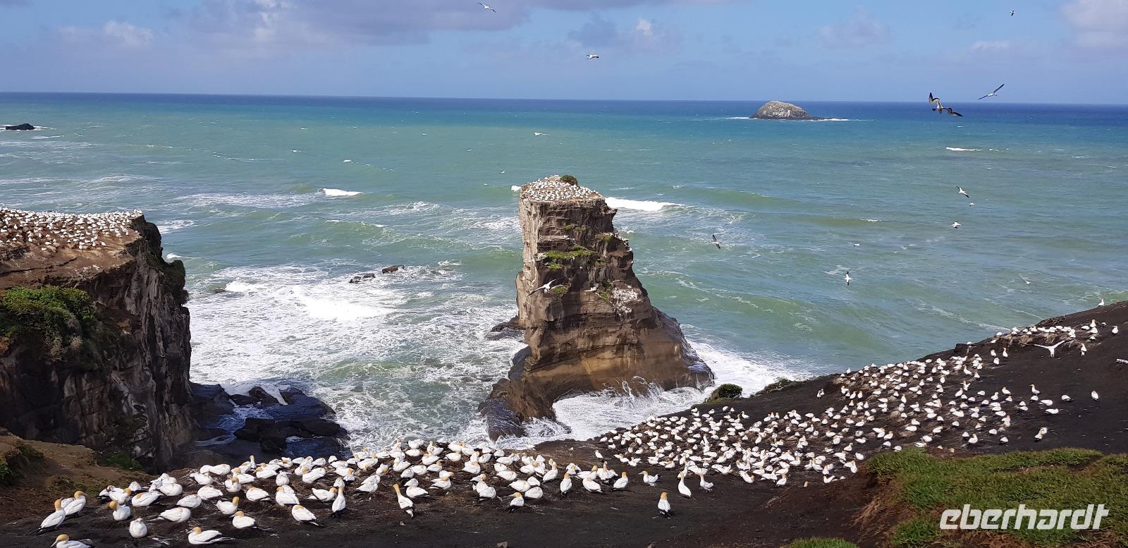 Gemeinsam fahren wir mit Reiseleiterin Doris in eine wunderschöne Weingegend, umgeben von grüner Hügellandschaft wie aus dem Bilderbuch. Bevor wir das Weingut erreichen, stoppen wir für einen kleinen Spaziergang an der Westküste am Muriwai Beach. Dort befindet sich die einzige Kolonie von Australischen Tölpeln in Neuseeland. Lautstark und nicht zu übersehen sitzen sie aufgereiht auf den Felsen und Klippen. Was für ein toller Anblick.