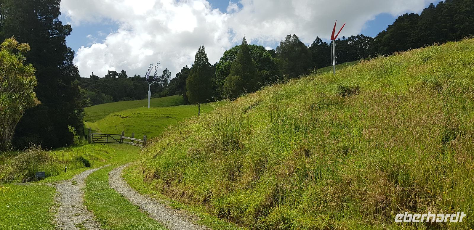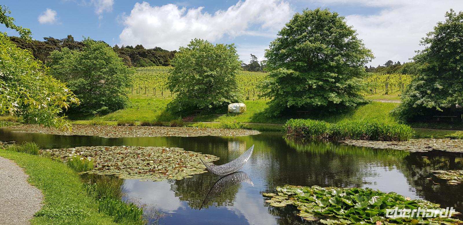 Weiter geht es schließlich ins BRICKSBAY Weingut. Inmitten grüner Natur gelegen befindet sich das wunderschöne Anwesen. Hier werden uns 3 Weine zum Verkosten angeboten... 1x Rosé, 1x Weiß und 1x Rot. Dazu gibt es kalte Käseplatten mit Wurst, Brot und Salat. Einfach lecker und das Ambiente passt! Nach Speis und Trank spazieren wir noch durch den anliegenden Märchenwald. Hier werden wir verzaubert von mystischen Klängen und bizarren Kunstobjekten. Wir könnten noch ewig bleiben, so gut gefällt es uns hier. Nach einem schönen Nachmittag fahren wir zurück nach Auckland.