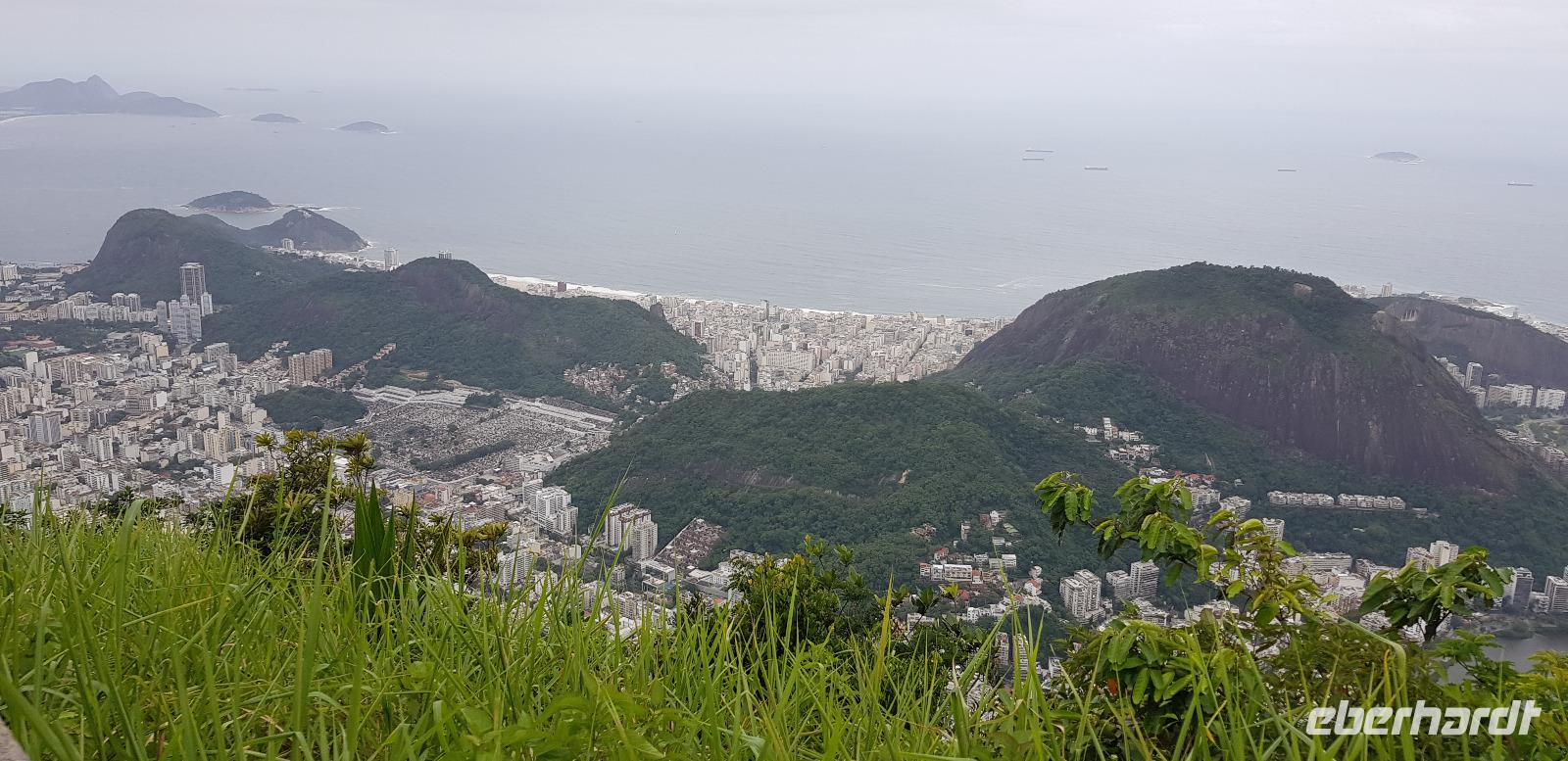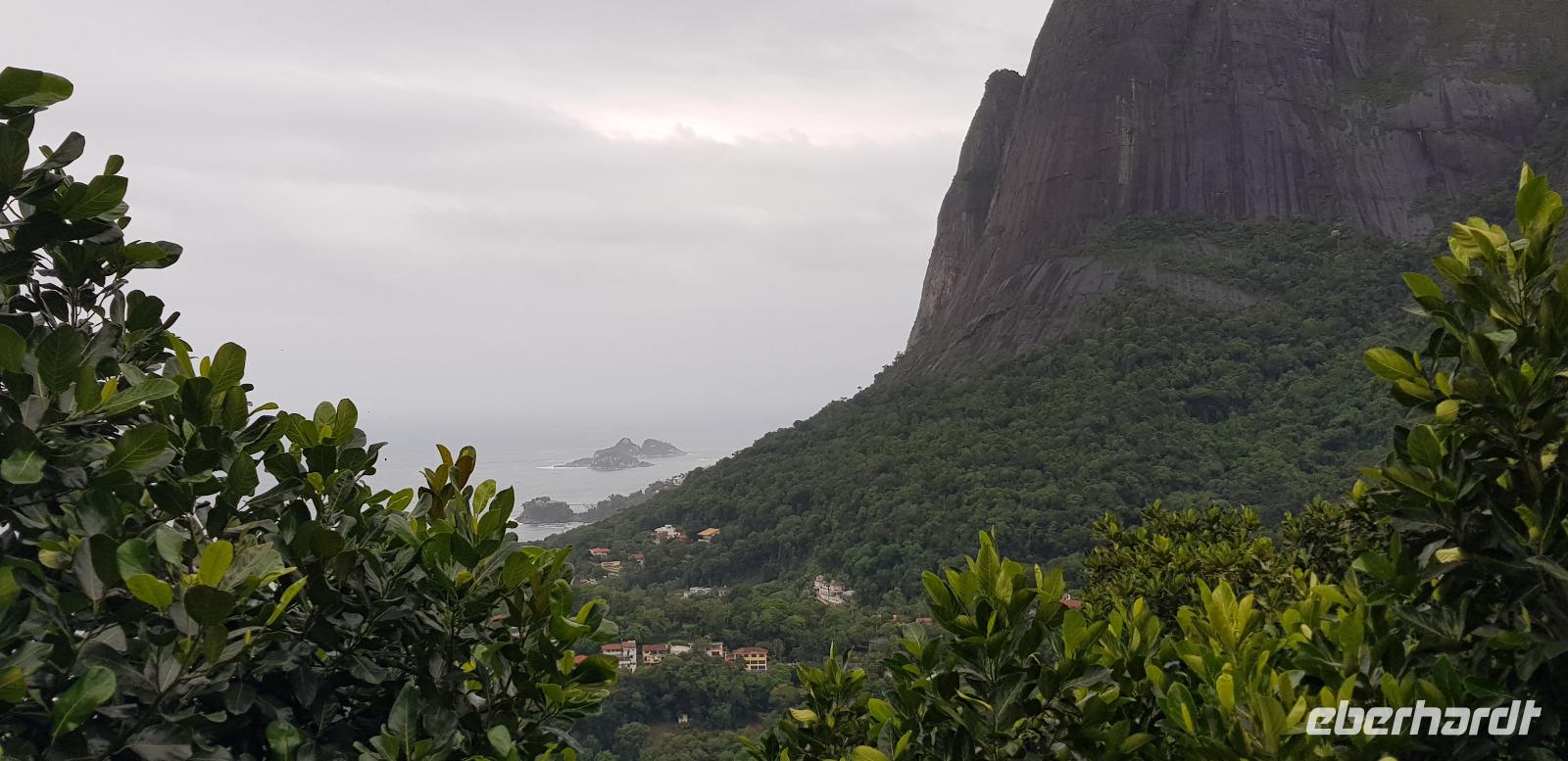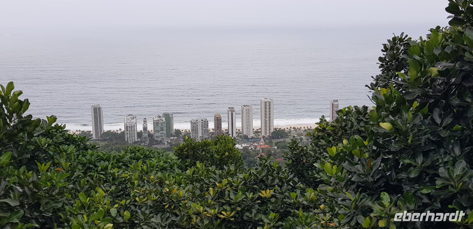 Wir fahren gemeinsam mit Reiseleiter Johannes, Jeep-Guide Marcelo und 2 weiteren Fahrern mit 3 Jeeps in die grüne Lunge von Rio. Marcelo spricht ebenfalls Deutsch und ist für jeden Spaß zu haben. Seine Witze machen diese Tour einmalig. Nach einer halben Stunde Fahrt erreichen wir den ersten Aussichtspunkt mit Blick auf den Regenwald und die Südküste von Rio. Danach geht es weiter die Berge hinauf, wo wir einen kleinen Dschungel-Spaziergang unternehmen. Auch hier sehen wir wieder die großen Jack-Früchte und Bananenblüten in ihrer schönsten Farbenpracht.