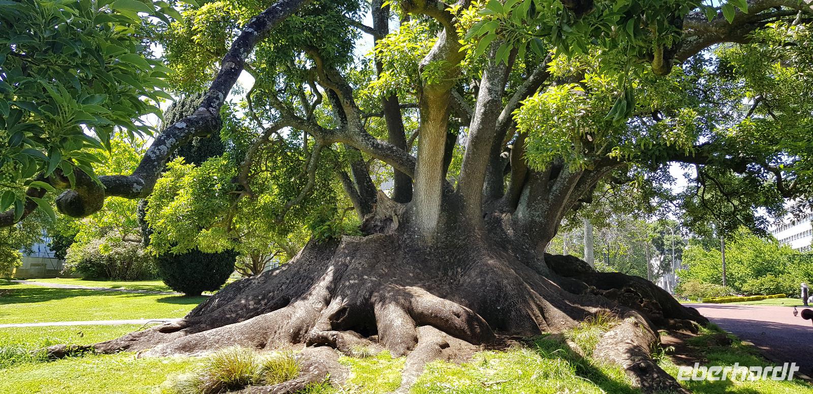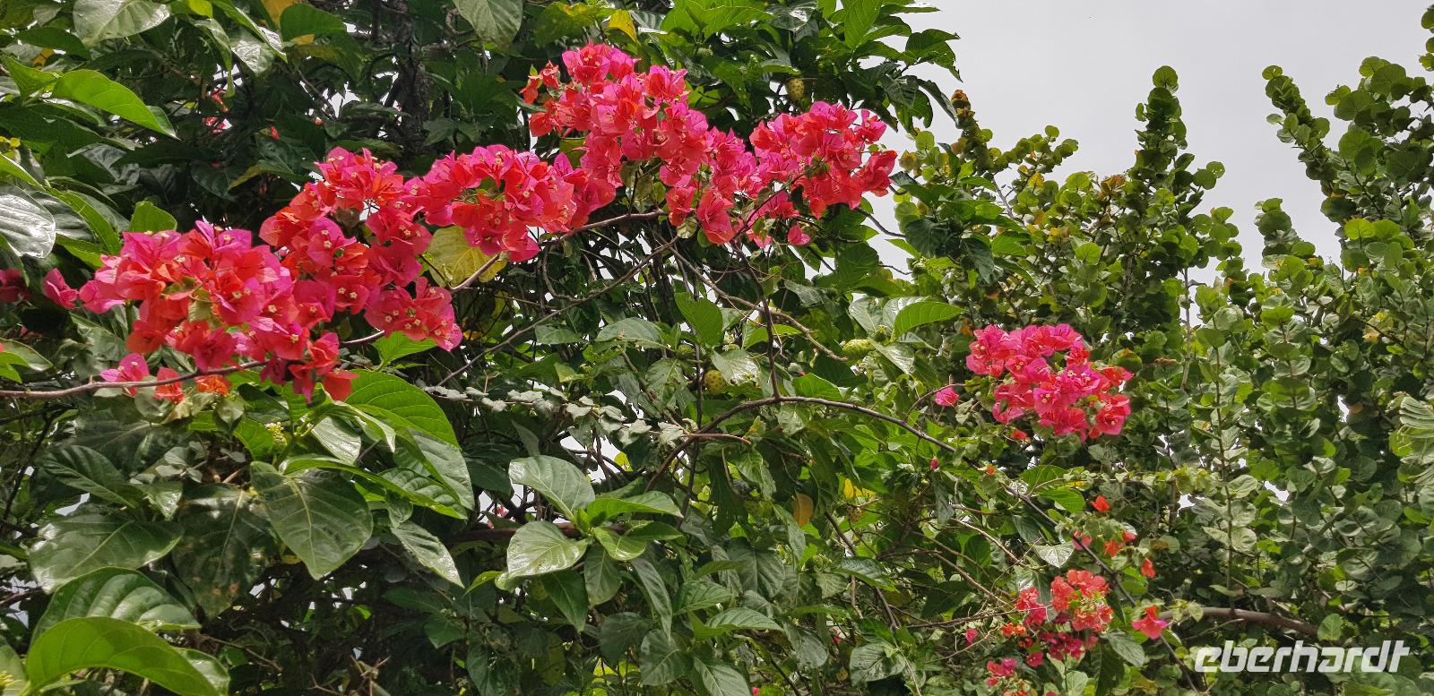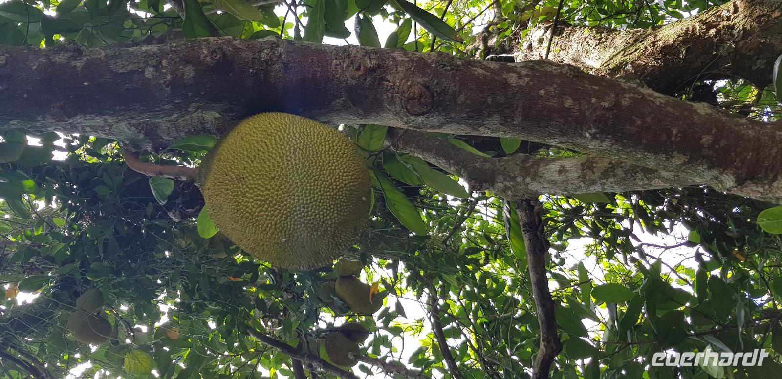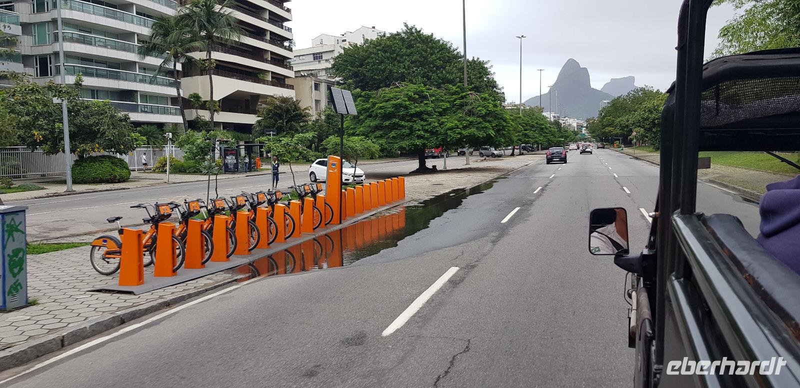 Wir fahren gemeinsam mit Reiseleiter Johannes, Jeep-Guide Marcelo und 2 weiteren Fahrern mit 3 Jeeps in die grüne Lunge von Rio. Marcelo spricht ebenfalls Deutsch und ist für jeden Spaß zu haben. Seine Witze machen diese Tour einmalig. Nach einer halben Stunde Fahrt erreichen wir den ersten Aussichtspunkt mit Blick auf den Regenwald und die Südküste von Rio. Danach geht es weiter die Berge hinauf, wo wir einen kleinen Dschungel-Spaziergang unternehmen. Auch hier sehen wir wieder die großen Jack-Früchte und Bananenblüten in ihrer schönsten Farbenpracht.