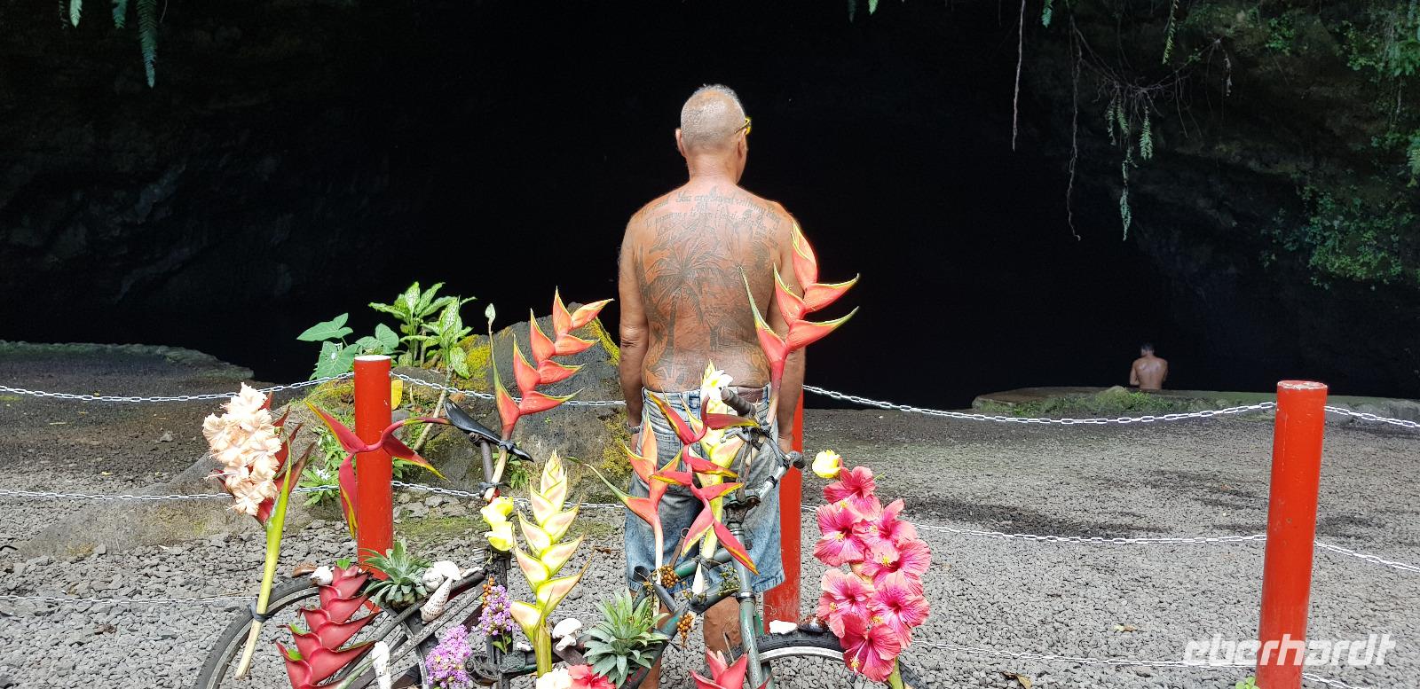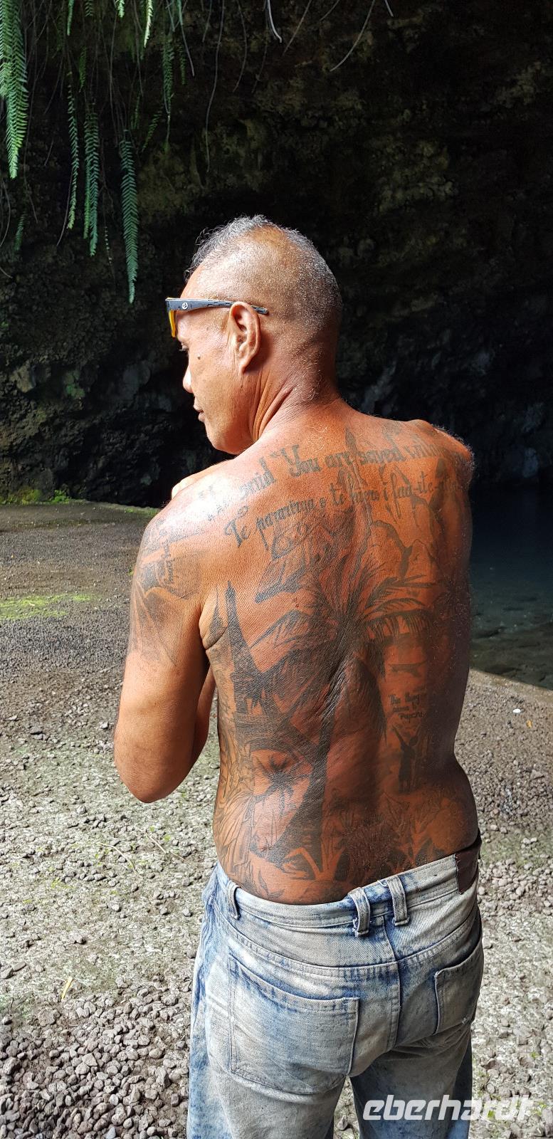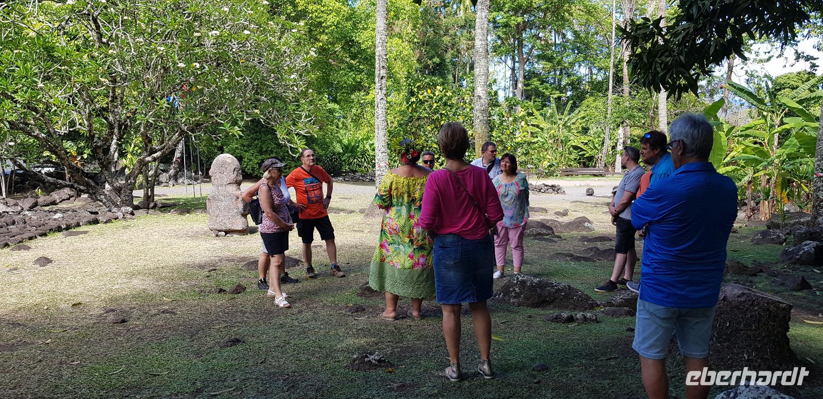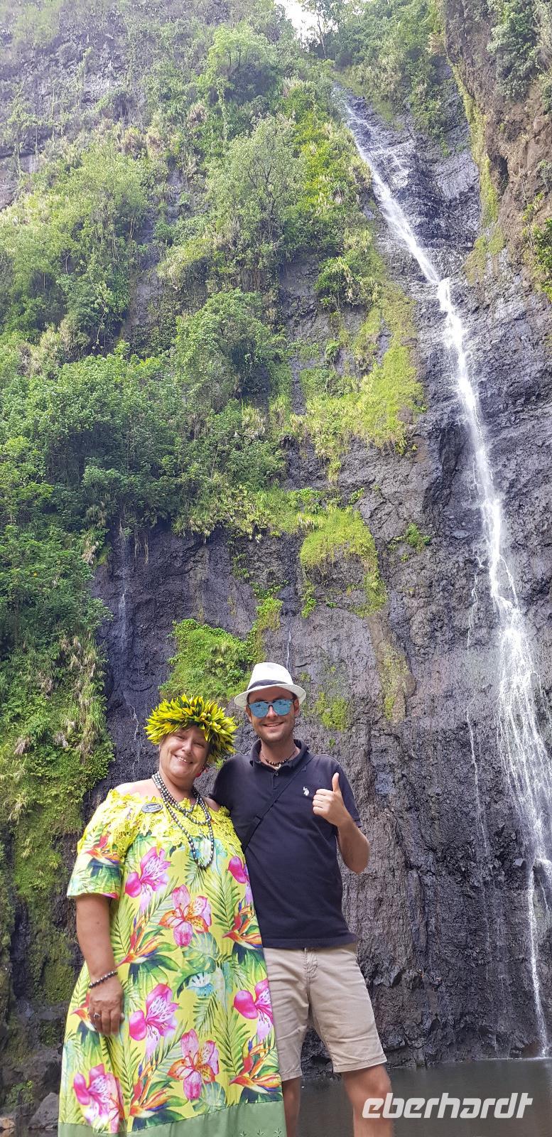Im Hotel werden wir von Reiseleiterin Margit begrüßt und schon geht es auf gemeinsame Inselrundfahrt. Unser erster Programmpunkt ist das Tahiti-Inselmuseum, wo wir einige historische Exponate über die Polynesischen Inseln bestaunen können. Wir sind die einzigen Besucher und das Museum hat nur wegen uns geöffnet. Margit erklärt die Geschichte und Besiedlung der Südsee, was sich anhand einer großen Pazifik Karte gut vorzustellen ist. Anschließend stoppen wir an den Ausgrabungen von Arahurahu Marae - einem Zeremonienplatz der Polynesier. Nach einem ausführlichen Rundgang bekommen wir einen neuen Reisebus, denn beim vorhergehende machte leider die Klimaanlage schlapp. Weiter geht es also um die Insel mit angenehmer Kühlung. Unser nächster Fotostopp führt uns zur „Maraa fern Grottes" eine Höhle mit kleinen Wasserfällen und einer Badestelle, umgeben von einer Parkanlage. Dort präsentiert uns ein einheimischer stolz seine Tattoos und sein klappriges Fahrrad, verziert mit bunten Blumen. Als nächstes erreichen wir das Paul Gauguin Restaurant, wo wir für eine Mittagspause einkehren. Es gibt frischen Frisch und als Nachspeise Eis oder frisches Obst. Gut gestärkt setzen wir unsere Inselrundfahrt fort und besuchen den Vaipahi Tropical Garden und den gleichnamigen Vaipah Wasserfall. Kurze Zeit später wartet schon der Faarumai Wasserfall auf uns und schließlich das „Blue Hole" - einer Bucht mit starker Wellenbrandung. Nun sind wir einmal fast um die Insel herum gefahren und erreichen unseren letzten Stopp, dem Venuspoint. Hier legte James Cook erstmalig am 10. April 1769 mit seinem Schiff Endeavour an. Eine tolle Inselrundfahrt geht zu Ende.