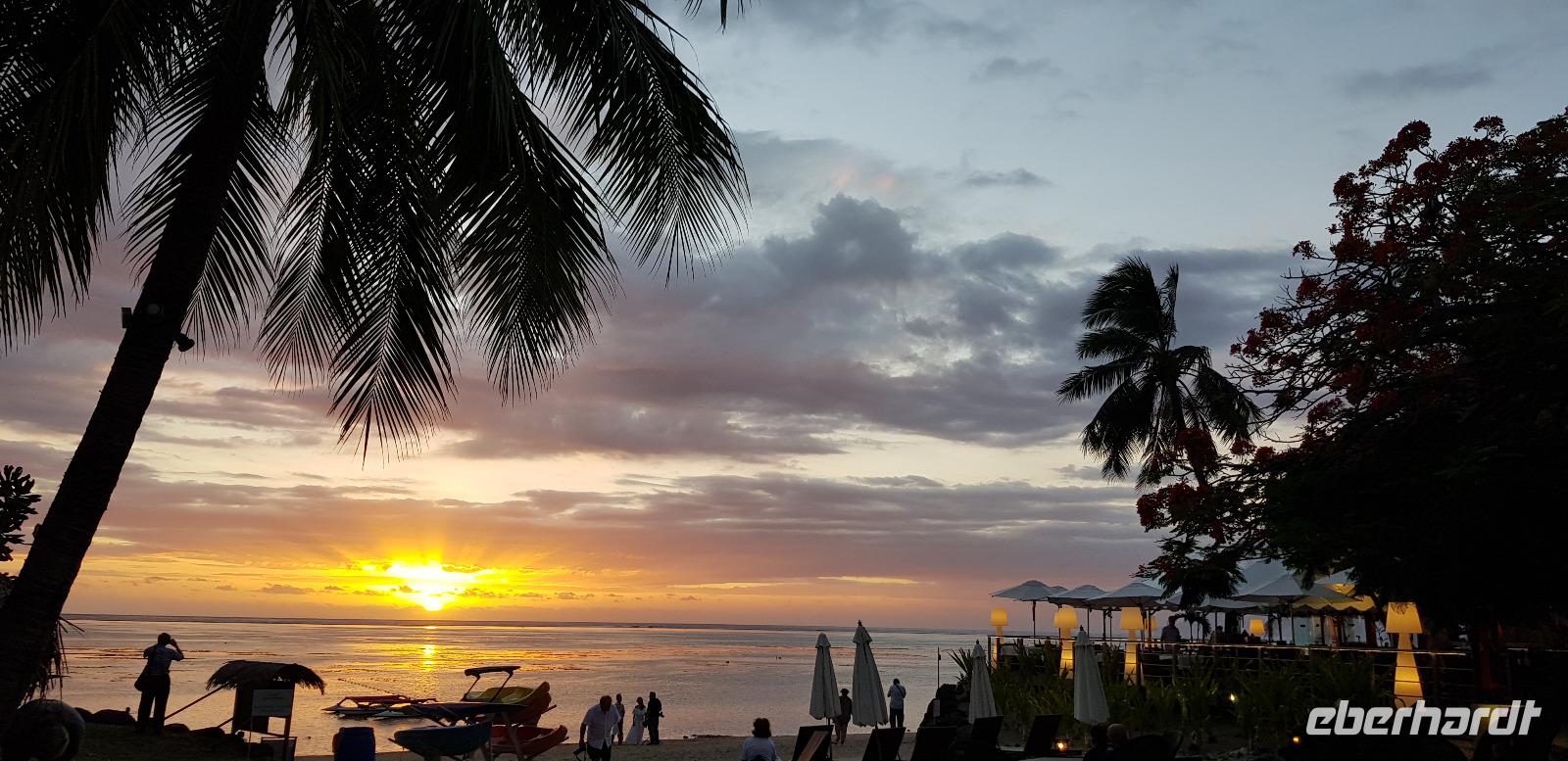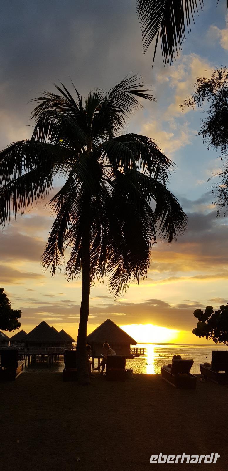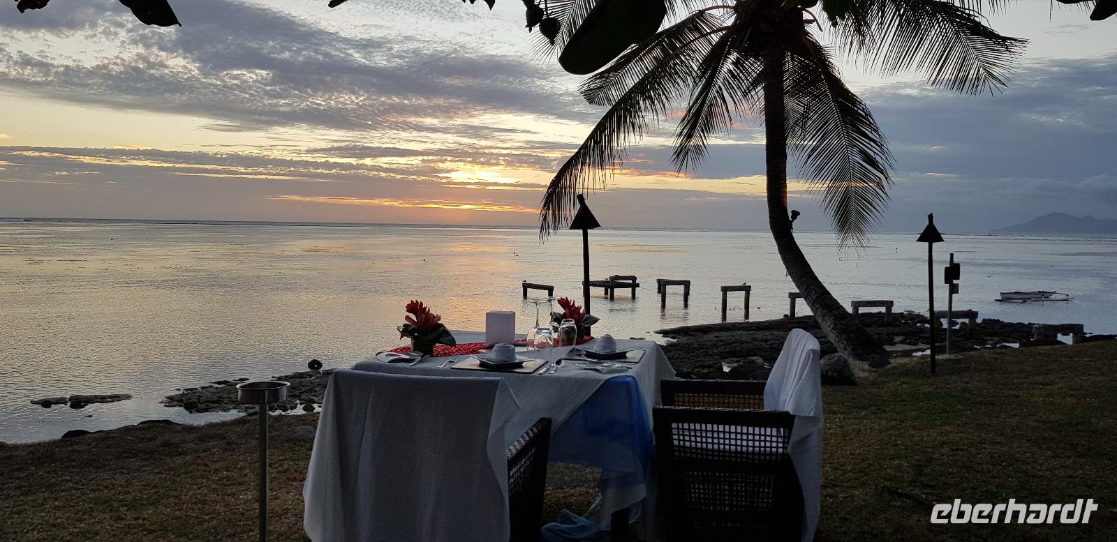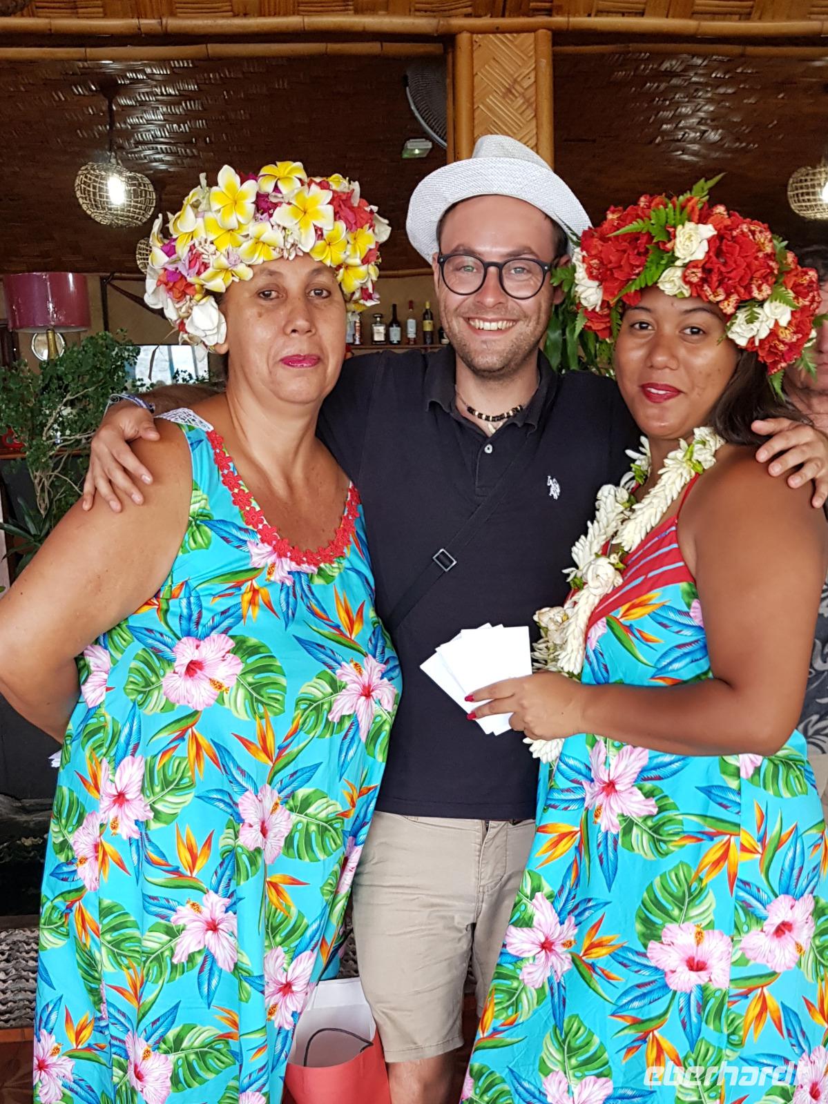 Im Hotel werden wir von Reiseleiterin Margit begrüßt und schon geht es auf gemeinsame Inselrundfahrt. Unser erster Programmpunkt ist das Tahiti-Inselmuseum, wo wir einige historische Exponate über die Polynesischen Inseln bestaunen können. Wir sind die einzigen Besucher und das Museum hat nur wegen uns geöffnet. Margit erklärt die Geschichte und Besiedlung der Südsee, was sich anhand einer großen Pazifik Karte gut vorzustellen ist. Anschließend stoppen wir an den Ausgrabungen von Arahurahu Marae - einem Zeremonienplatz der Polynesier. Nach einem ausführlichen Rundgang bekommen wir einen neuen Reisebus, denn beim vorhergehende machte leider die Klimaanlage schlapp. Weiter geht es also um die Insel mit angenehmer Kühlung. Unser nächster Fotostopp führt uns zur „Maraa fern Grottes" eine Höhle mit kleinen Wasserfällen und einer Badestelle, umgeben von einer Parkanlage. Dort präsentiert uns ein einheimischer stolz seine Tattoos und sein klappriges Fahrrad, verziert mit bunten Blumen. Als nächstes erreichen wir das Paul Gauguin Restaurant, wo wir für eine Mittagspause einkehren. Es gibt frischen Frisch und als Nachspeise Eis oder frisches Obst. Gut gestärkt setzen wir unsere Inselrundfahrt fort und besuchen den Vaipahi Tropical Garden und den gleichnamigen Vaipah Wasserfall. Kurze Zeit später wartet schon der Faarumai Wasserfall auf uns und schließlich das „Blue Hole" - einer Bucht mit starker Wellenbrandung. Nun sind wir einmal fast um die Insel herum gefahren und erreichen unseren letzten Stopp, dem Venuspoint. Hier legte James Cook erstmalig am 10. April 1769 mit seinem Schiff Endeavour an. Eine tolle Inselrundfahrt geht zu Ende.
