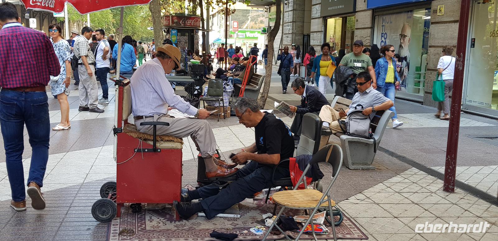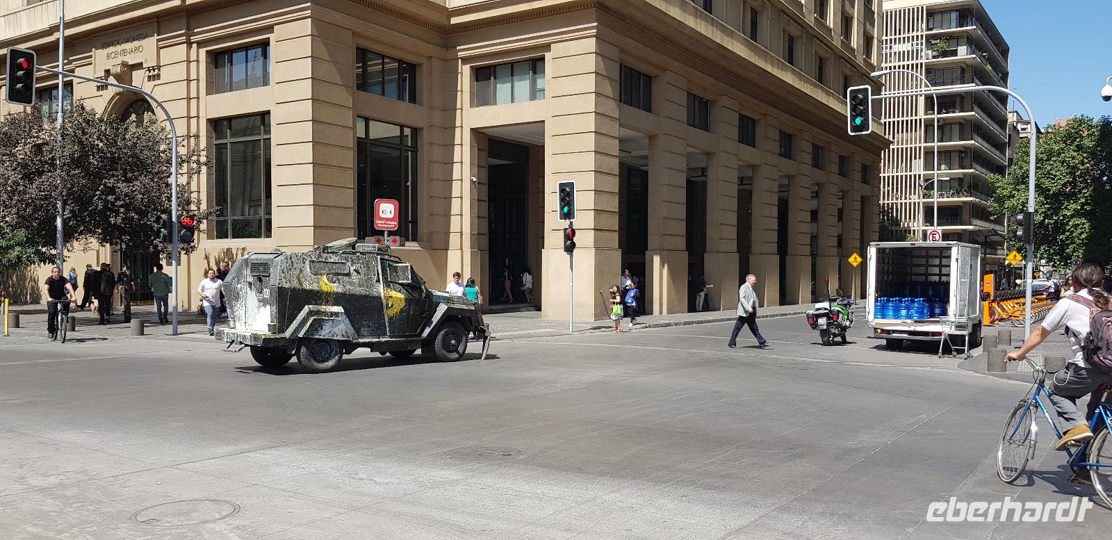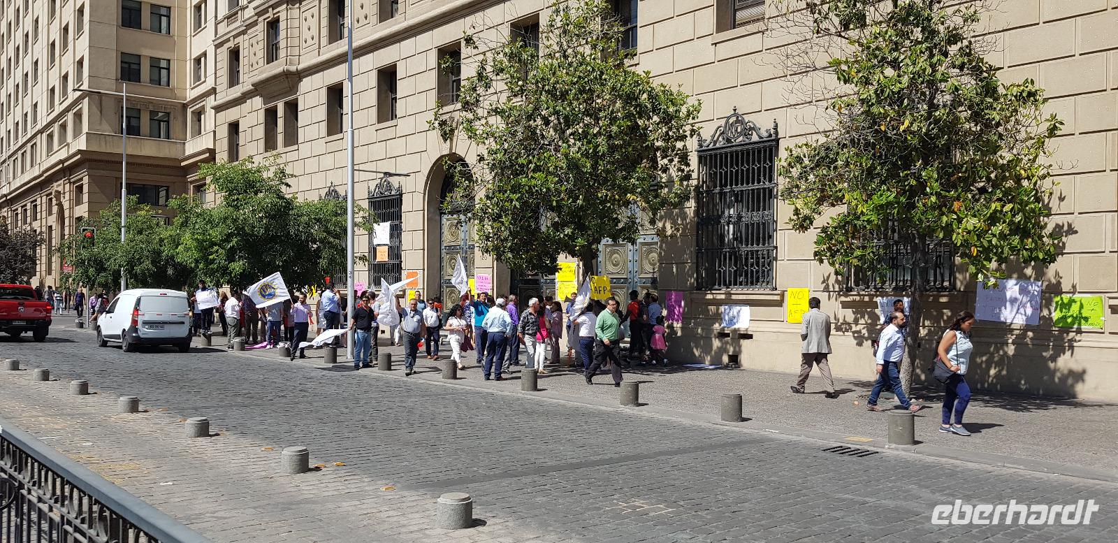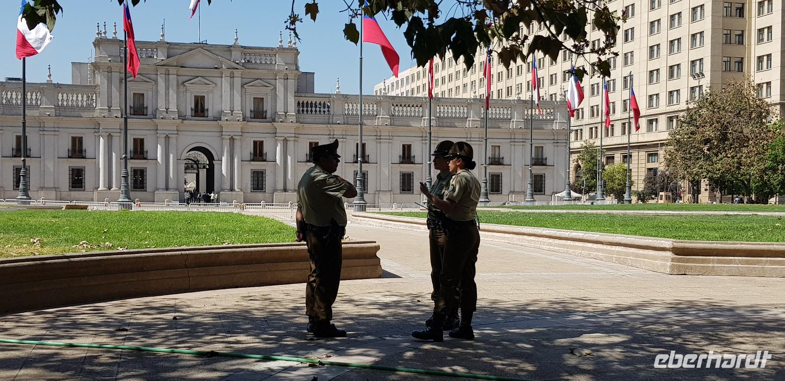 Nachdem wir gestern unser ruhiges Südseeparadies verlassen hatten, sind wir heute mit Reiseleiterin Jana in der quirligen Metropole Santiago de Chile unterwegs. Wir unternehmen einen kleinen und wegen Streiks eingeschränkten Stadtrundgang. Als erstes fahren wir ein kurzes Stück mit unserem örtlichen Reisebus zu den Fischmarkthallen. Dort spazieren wir einmal hindurch und als der Fischgeruch zu stark wird, geht es weiter zum Plaza de Armas. Hier bestaunen wir die historischen Kolonialbauten und besichtigen die Kathedrale „Metropolitan" von innen. Sie wurde im Jahr 1799 fertiggestellt und ist Sitz des Erzbischofs von Santiago. Weiter geht es zum Regierungspalast La Moneda, der im Jahr 1973 Schauplatz des Militärputsches war und von der Luftwaffe bombardiert wurde. Der damalige Präsiden Salvador Allende nahm sich im Zuge dessen das Leben.