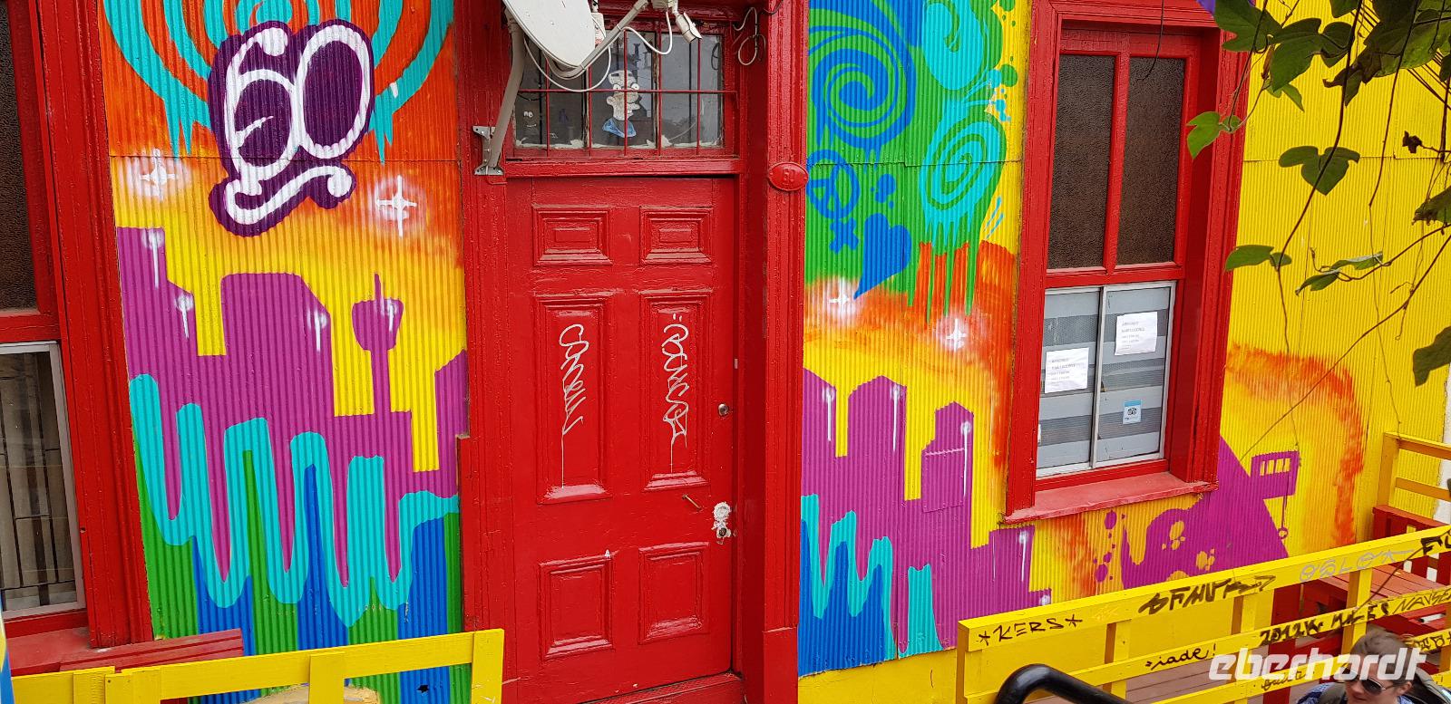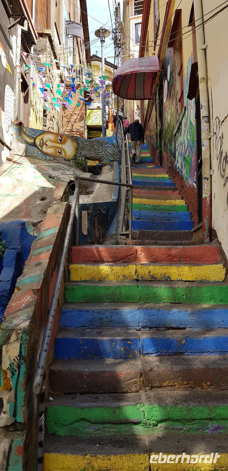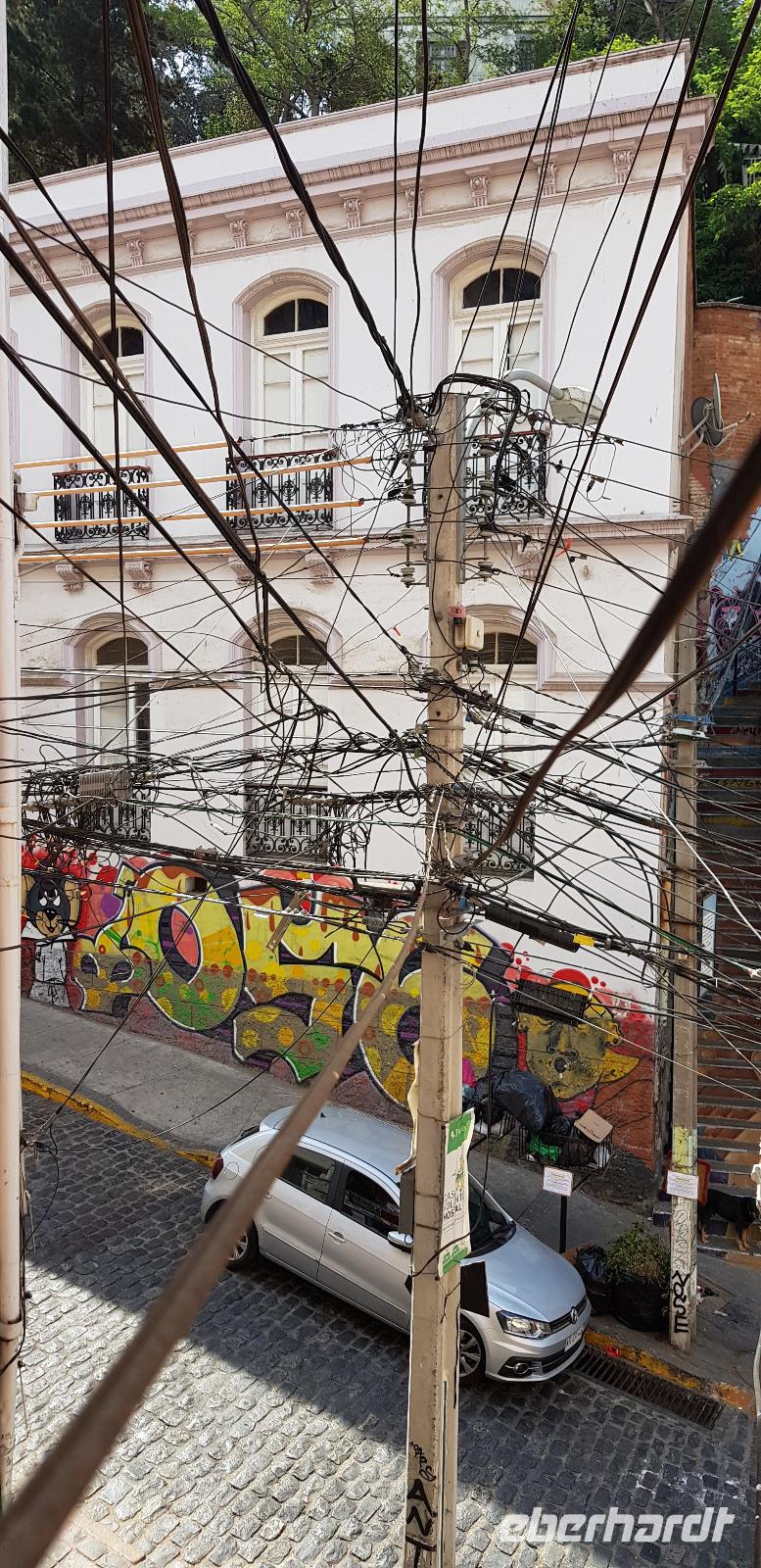 An jeder Ecke finden wir Street Art, Fachwerk und kunstvoll verzierte Häuserfassaden. Die Straßen sind wie ein lebendiges Museum. Nach unserem Rundgang fahren wir wieder nach Santiago. Auf dem Rückweg sehen wir in der Innenstadt noch einige Demonstranten und von weiten sogar brennende Straßen-Barrikaden. Nichts wie weg...! Auf diesen kleinen Schock gibt es erst einmal einen Pisco Schnaps - spendiert vom Herrn Eberhardt! ;-)