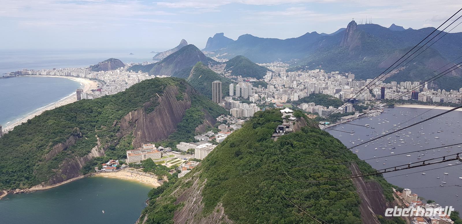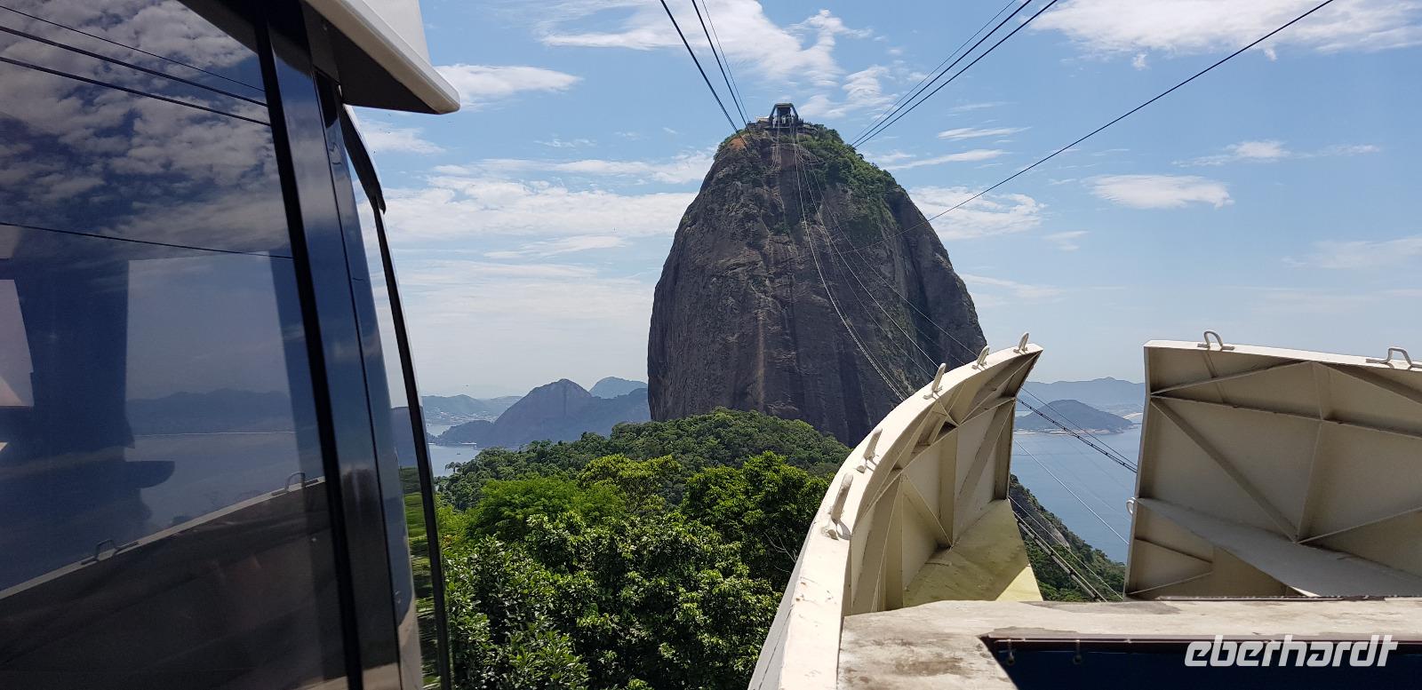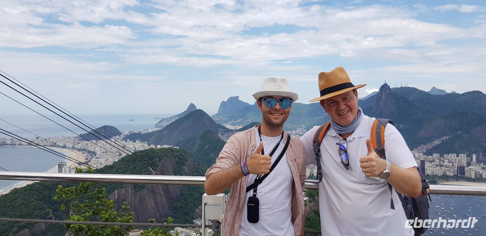 Die Sonne lacht und wir freuen uns auf den Zuckerhut - unserem ersten großen Highlight des heutigen Tages. Gemeinsam fahren wir mit Reiseleiter Johannes mit der Gondelbahn aus der Schweiz hinauf und blicken vom ersten Aussichtspunkt auf die vielen Buchten und Hügel der Stadt. Der Name „Zuckerhut" bedeutet im portugiesischen -> „Zuckerbrot". Diesen erhielt er im 17. Jahrhundert, weil es an die kegelförmigen Blöcke aus Rohzucker erinnert, die für den Versand von Brasilien nach Portugal vorbereitet worden. Vom ersten Aussichtspunkt geht es weiter mit der Seilbahn zur nächsten Etappe. Von 396m Höhe, blicken wir vom höchsten Punkt des Berges weit in die Ferne. Bei relativ guter Sicht sehen wir die Copacabana, die Bucht von Botafogo & Flamengo, die Christus Statue und den Innerstädtischen Flughafen. Danach geht es mit der Seilbahn wieder hinab... auch ein kurzer Stromausfall hält uns nicht auf! ;-)