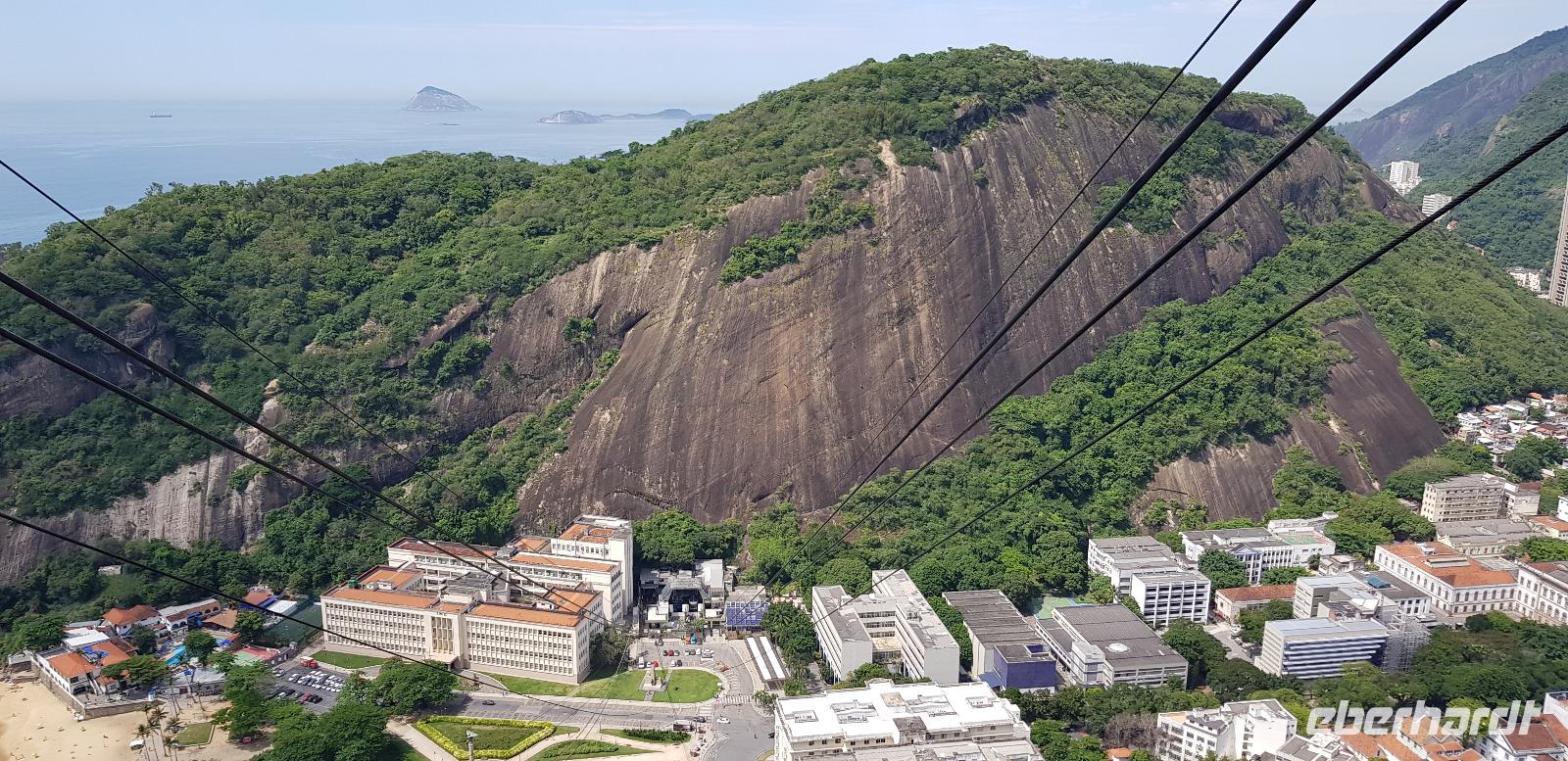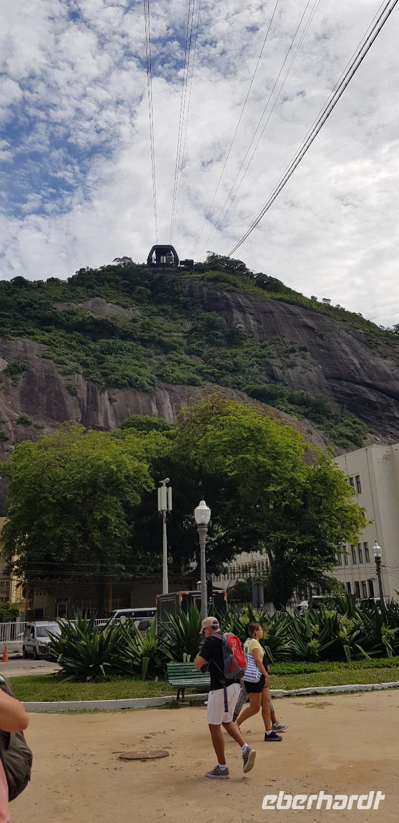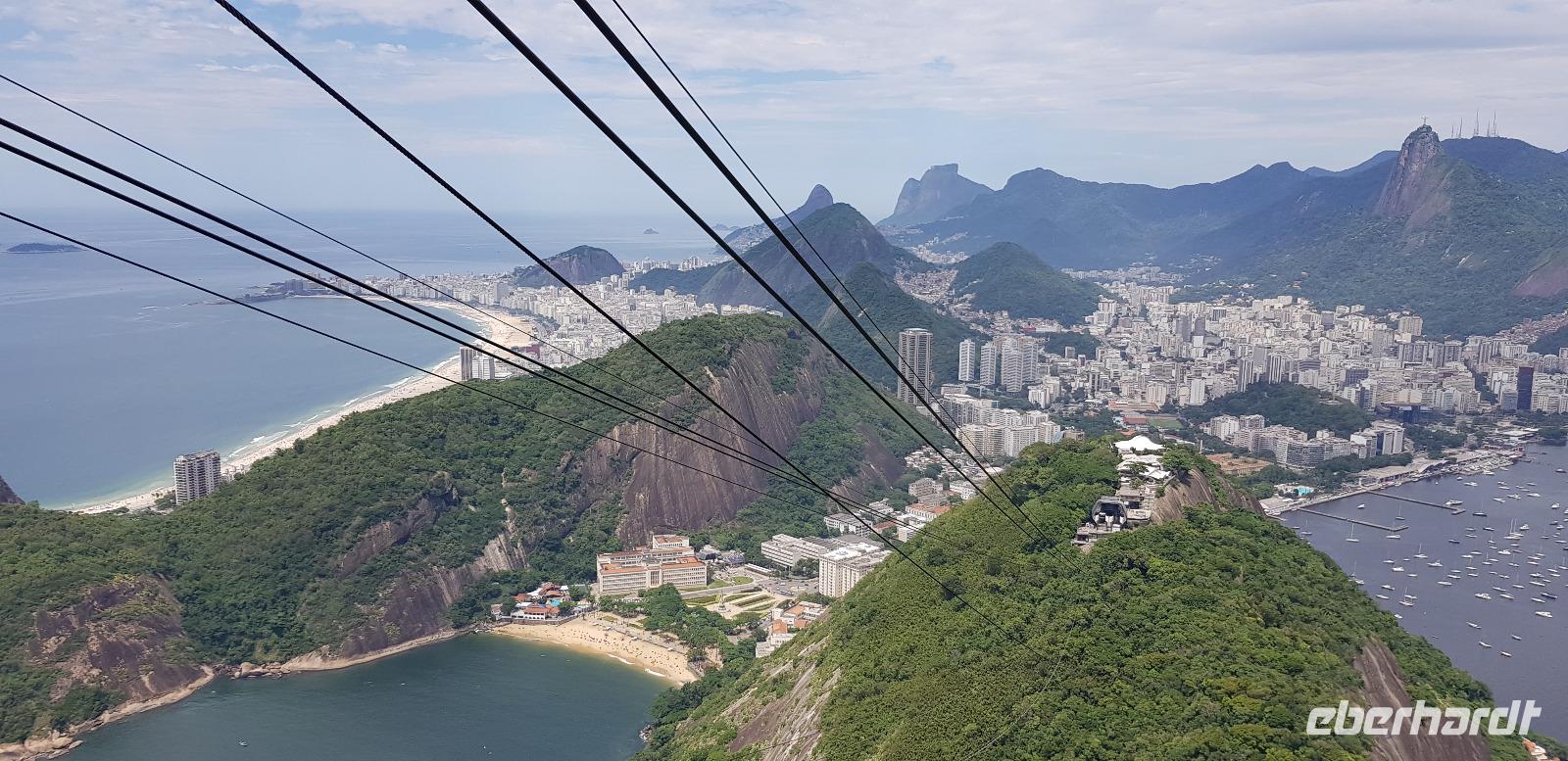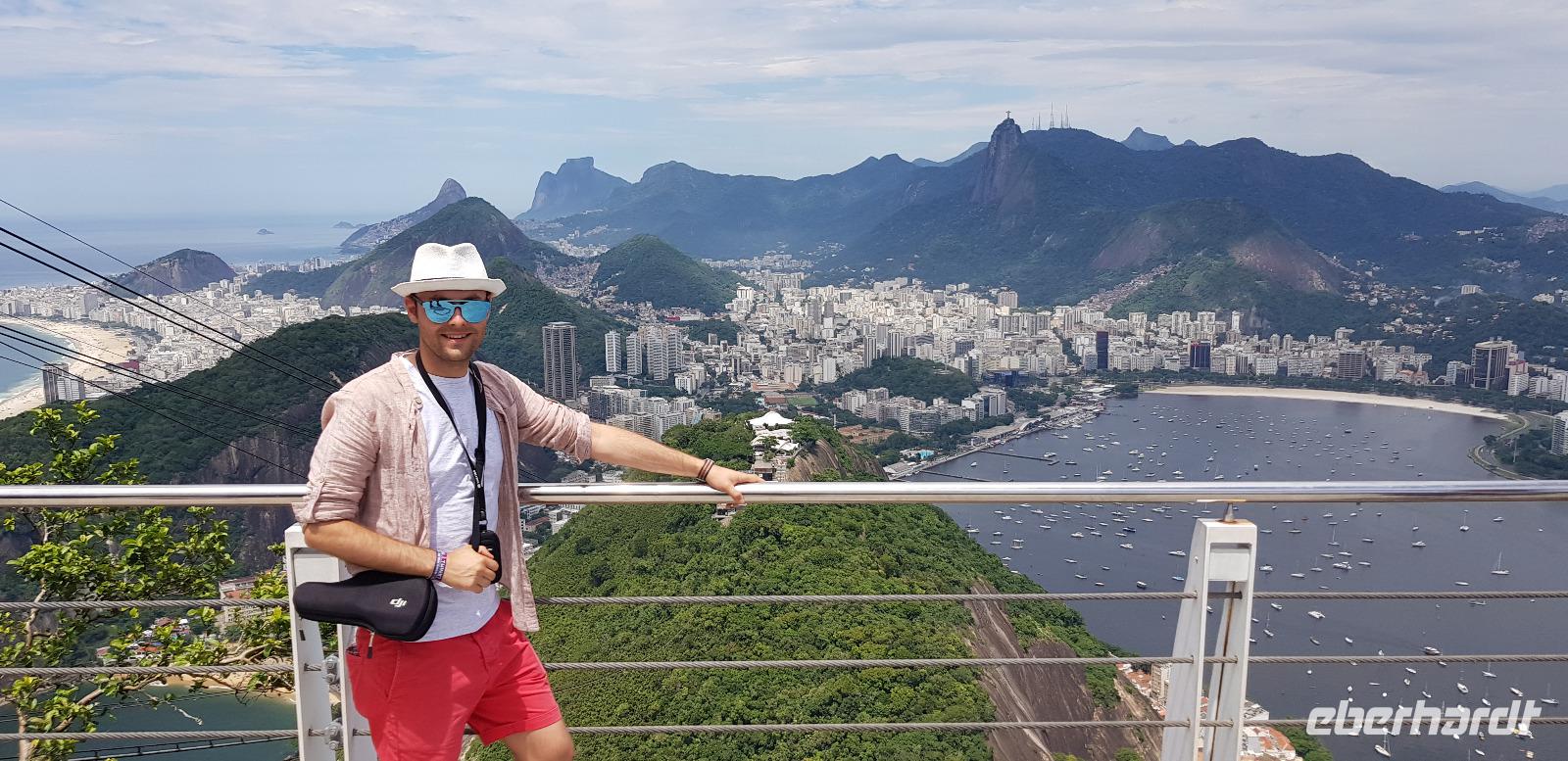 Die Sonne lacht und wir freuen uns auf den Zuckerhut - unserem ersten großen Highlight des heutigen Tages. Gemeinsam fahren wir mit Reiseleiter Johannes mit der Gondelbahn aus der Schweiz hinauf und blicken vom ersten Aussichtspunkt auf die vielen Buchten und Hügel der Stadt. Der Name „Zuckerhut" bedeutet im portugiesischen -> „Zuckerbrot". Diesen erhielt er im 17. Jahrhundert, weil es an die kegelförmigen Blöcke aus Rohzucker erinnert, die für den Versand von Brasilien nach Portugal vorbereitet worden. Vom ersten Aussichtspunkt geht es weiter mit der Seilbahn zur nächsten Etappe. Von 396m Höhe, blicken wir vom höchsten Punkt des Berges weit in die Ferne. Bei relativ guter Sicht sehen wir die Copacabana, die Bucht von Botafogo & Flamengo, die Christus Statue und den Innerstädtischen Flughafen. Danach geht es mit der Seilbahn wieder hinab... auch ein kurzer Stromausfall hält uns nicht auf! ;-)