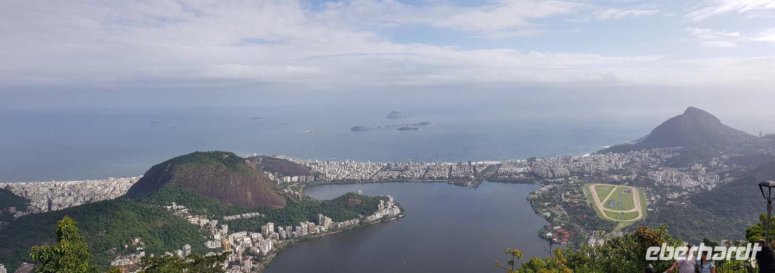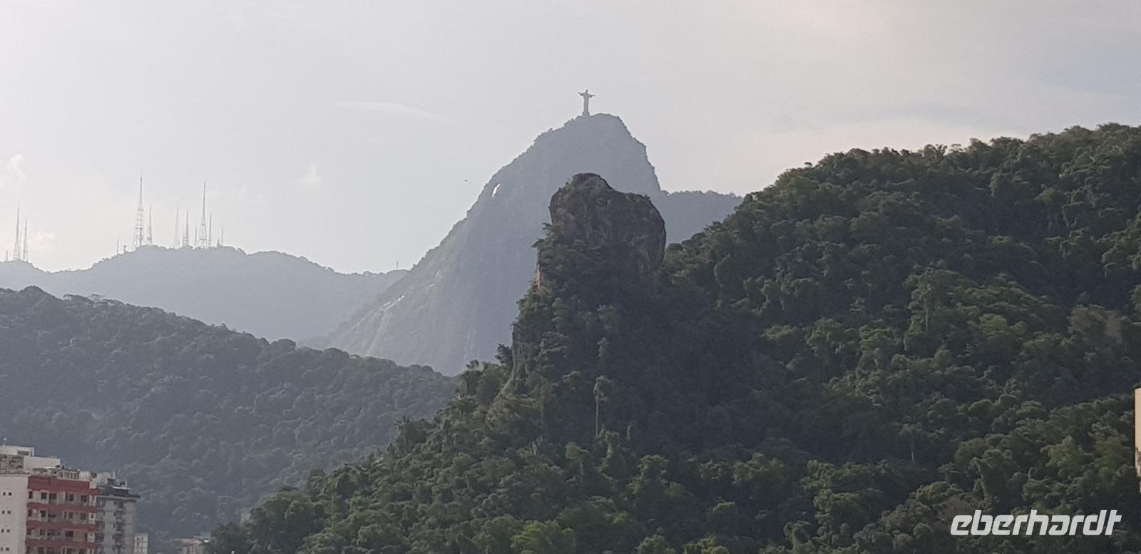 Zum Schluss erreichen wir einen kleinen Wasserfall, der im Sommer zum Baden einlädt. Auch ein Nasenbär läuft uns hier über den Weg. Nun neigt sich unsere Regenwald-Tour langsam dem Ende und wir fahren in die Stadt zurück. Dort verabschieden wir uns dann von Marcelo und seiner Crew und bedanken uns für den tollen Ausflug. Anschließend kehren wir zum Mittagessen in eine weitere Churrascaria ein, wo uns wieder die besten Fleisch¬-Spezialitäten serviert werden. Gut gesättigt geht es weiter zur Zahnradbahn, die zur Christus Statue hinauf führt. Nach einer halbstündigen Fahrt erreichen wir in 710 Metern Höhe den Corcovado Gipfel. Erst ist es etwas wolkenverhangen, doch kurze Zeit später haben wir eine grandiose Aussicht über Rio de Janeiro. Einfach klasse. Auch die Christus Statue zeigt sich von seiner schönsten Seite und wir können wieder tolle Fotos knipsen.