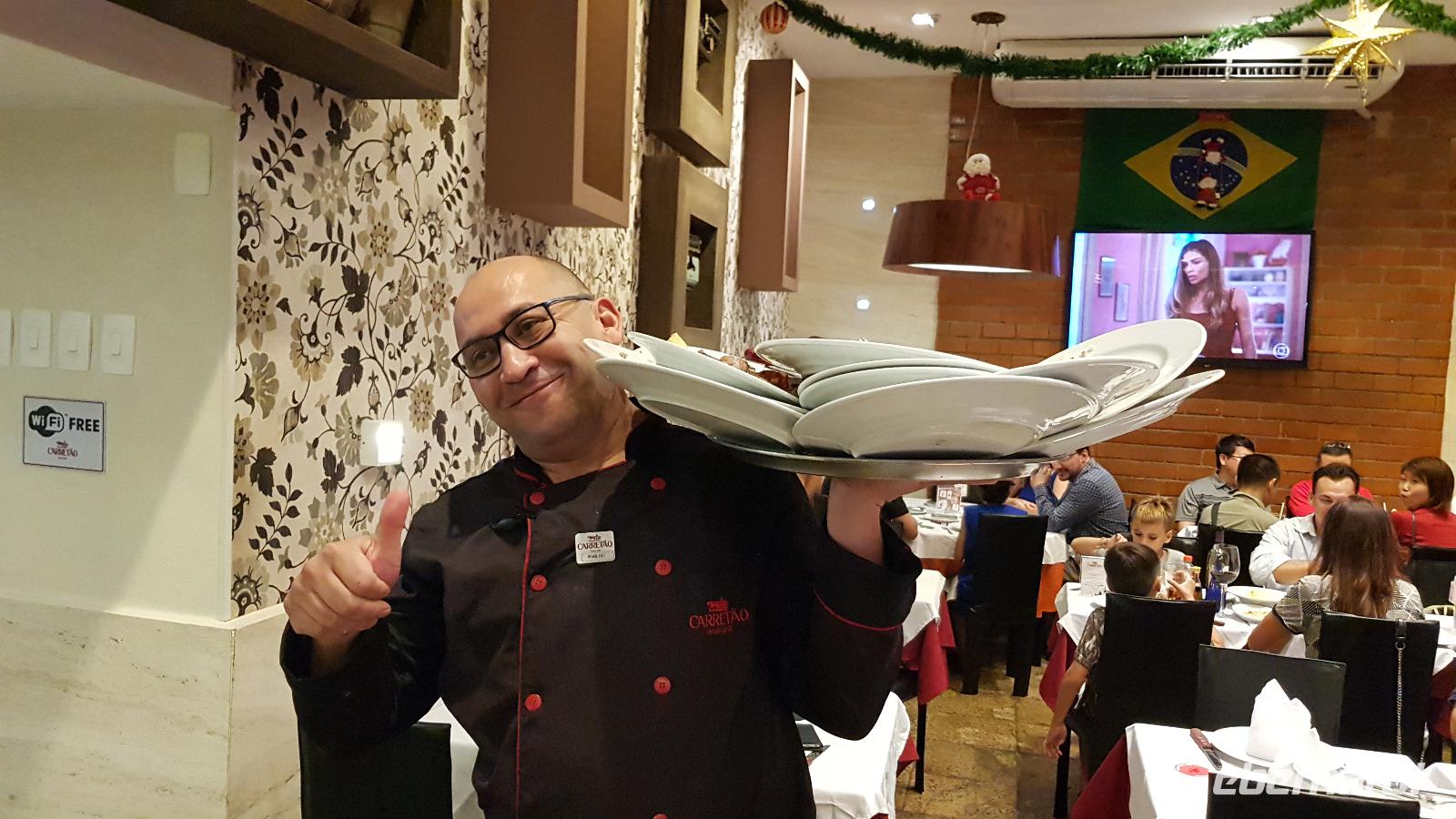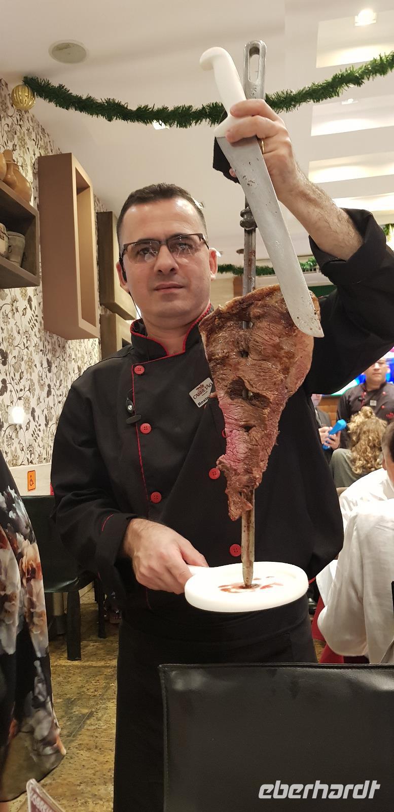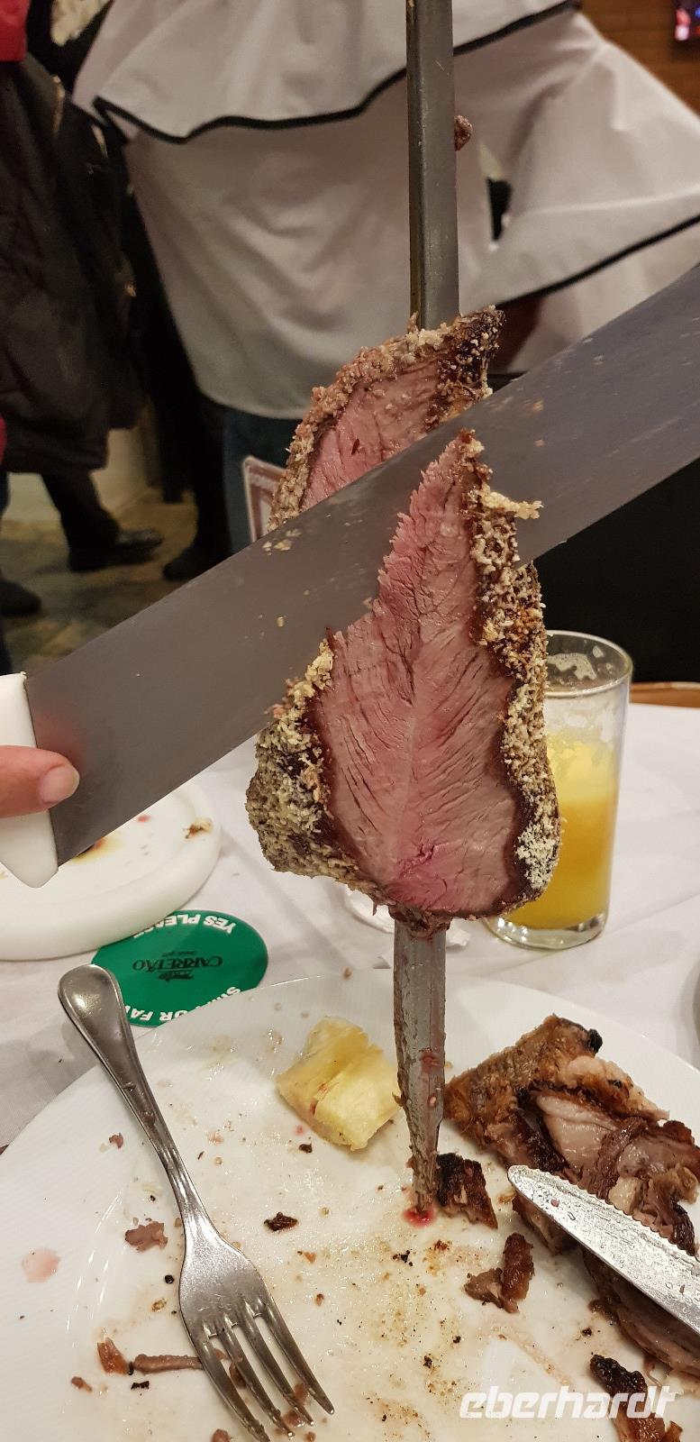 Den Nachmittag haben wir zur freien Verfügung, bevor wir uns abends wieder in der Hotellobby treffen. Von dort aus spazieren wir bei leichten Regen zu einer der besten Churrascaria-Restaurants in Rio. Dort zahlt jeder 22€ pro Person und kann sich so viel wie man möchte vom Fleischspieß abschneiden lassen. Das Beste kommt natürlich immer zum Schluss... feinstes Lammfleisch, Filet Mignon mit Parmesankruste oder schmackhafte Rippchen. Es ist ein Genuss - wir sind begeistert!