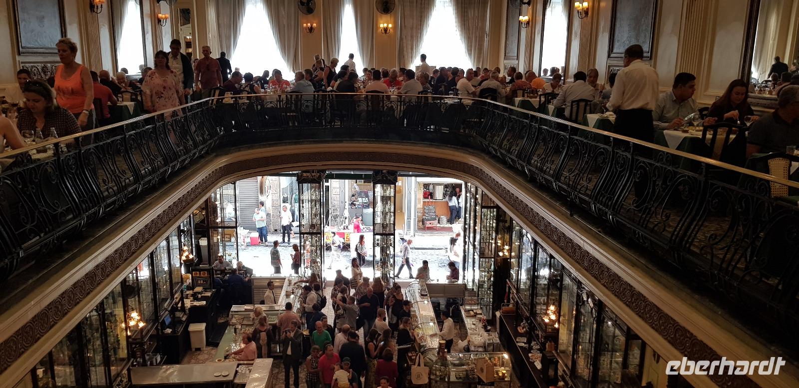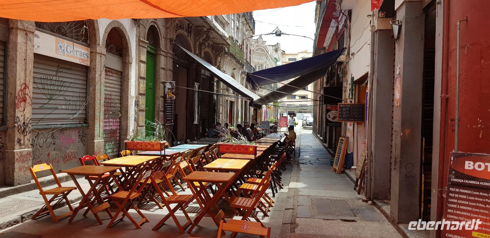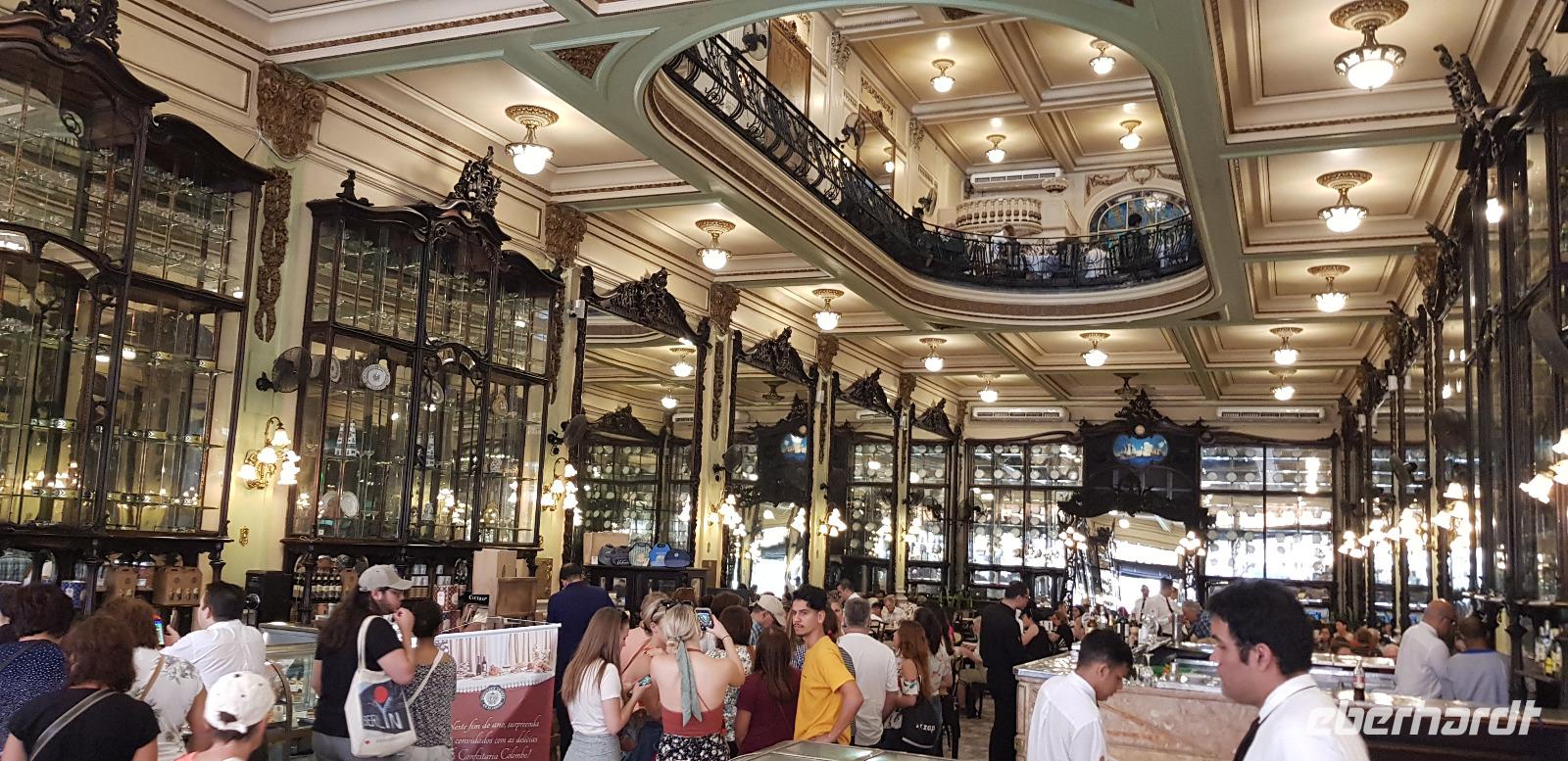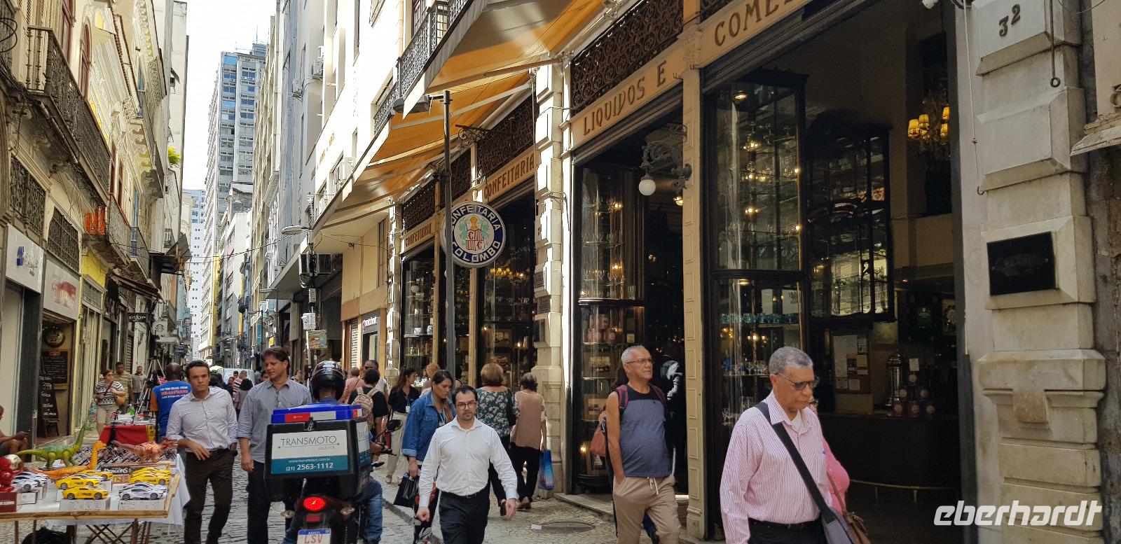 Wir besichtigen die prunkvolle Benediktinerabtei am Morro de São Bento in der Innenstadt und kommen sogar mit einigen Klosterschülern aus ganz Brasilien ins Gespräch. Sie sind offen für Fragen und auch neugierig wo wir herkommen. Nach einem interessanten Austausch bedanken wir uns und schon geht es weiter zum Mittagessen. Wir kehren ins berühmte Café Colombo ein, im Herzen der Altstadt. Zum Glück sind wir die erste Gruppe, weshalb wir nicht am Buffet anstehen müssen.