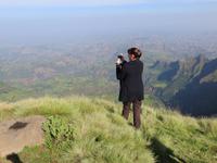Bei Sonne bestiegen wir unseren Toyota-Midibus und es ging weiter leicht aufwärts. Unser erster Stopp galt den Pavianen, die sich von uns Fotografen kaum beeindrucken ließen. Hunderte Paviane sitzen auf der Wiese und rupfen Gras und kleine Blättchen - scheinbar fressen sie den ganzen Tag. Die Alternativbeschäftigung ist oft ein gegenseitiges Flöhesuchen. Bei einem weiteren Stopp unternahmen wir einen kleinen Spaziergang - kaum eine Stunde - durch die Hochebene, teilweise direkt am eintausendfünfhundert Meter tieferen Erosionskessel entlang. Als wir nach einigen Fotostopps die 3600 Meter Höhenmarke überwunden hatten und nach Hailes Aussagen die Viertausend erreicht hätten, war Nebel aufgezogen. Auf den Wiesen im Umkreis konnten wir die riesigen Lobelien noch recht gut erkennen, ein Steinbock zeigte sich hier indes nicht. Mehrfach konnten wir in der Höhe jedoch riesige Lämmergeier und die deutlich kleineren Habichte beim Flug bewundern. Dann auf der Rückfahrt hatten wir noch Glück: ein Steinbock ruhte auf einer Klippe; unser Guide schreckte ihn moderat auf, so dass wir den Steinbock wenigstens aus etwa zweihundert Meter Entfernung sehen konnten. Etwas später zeigte uns sich dann noch ein Schakal. Gegen 16 Uhr trafen wir an der Lodge ein - Kühle und feuchte Wolken luden indes nicht dazu ein, vor der Lodge zu sitzen oder auf den Sonnenuntergang zu warten.