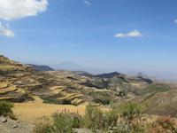 Bis in die Mittagsstunden fuhren wir zunächst noch im Banne des Simiengebirges, über Pässe, hinein in Schluchten auf Straßen, die die Italiener während des Besatzung erbauten. Ab Mittag änderte sich die Landschaftsform in Hügelland und weite Flächen, die sich dennoch in einer Höhe von etwa zweitausend Meter befanden. Wir erreichten Tigray, die nördliche Provinz Äthiopiens an der Grenze zu Eritrea. Die Landschaft ist karger, steiniger; landwirtschaftliche Flächen werden weniger, die Dörfer eher noch ärmlicher. Am Wegesrand Baobabs und Weihrauchbäume. I n Tigray mehren sich die Flüchtlingscamps für Flüchtlinge aus Eritrea. In dieser Gegend finden wir kein halbwegs sauber anmutendes „Wirtshaus" zum Mittagessen oder wenigstens einen Kaffee trinken. Was uns blieb, sind Bananen von Straßenhändler. Nach über acht Stunden Busfahrt erreichen wir Axum. Als Tageseindruck bleiben leider insbesondere die Schlagworte der Gegenwart: Flüchtlinge, Armut, Hunger, Bevölkerungsexplosion, Überweidung, Bodenerosion, Abholzung ....