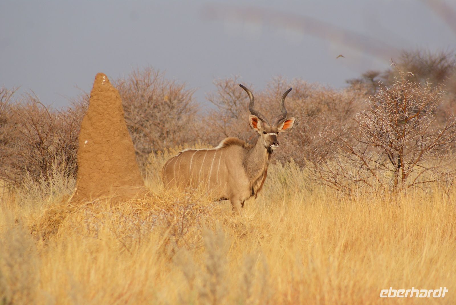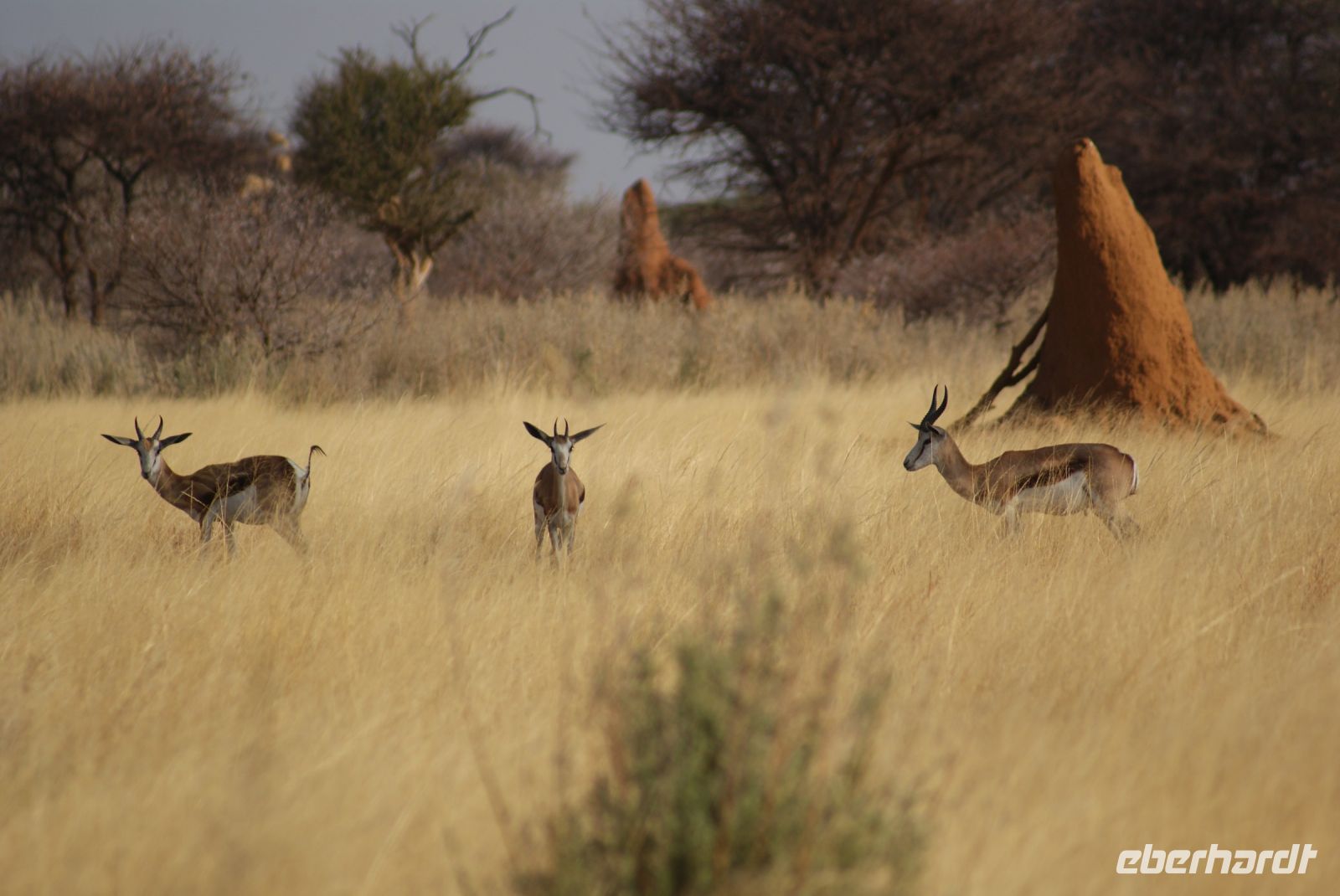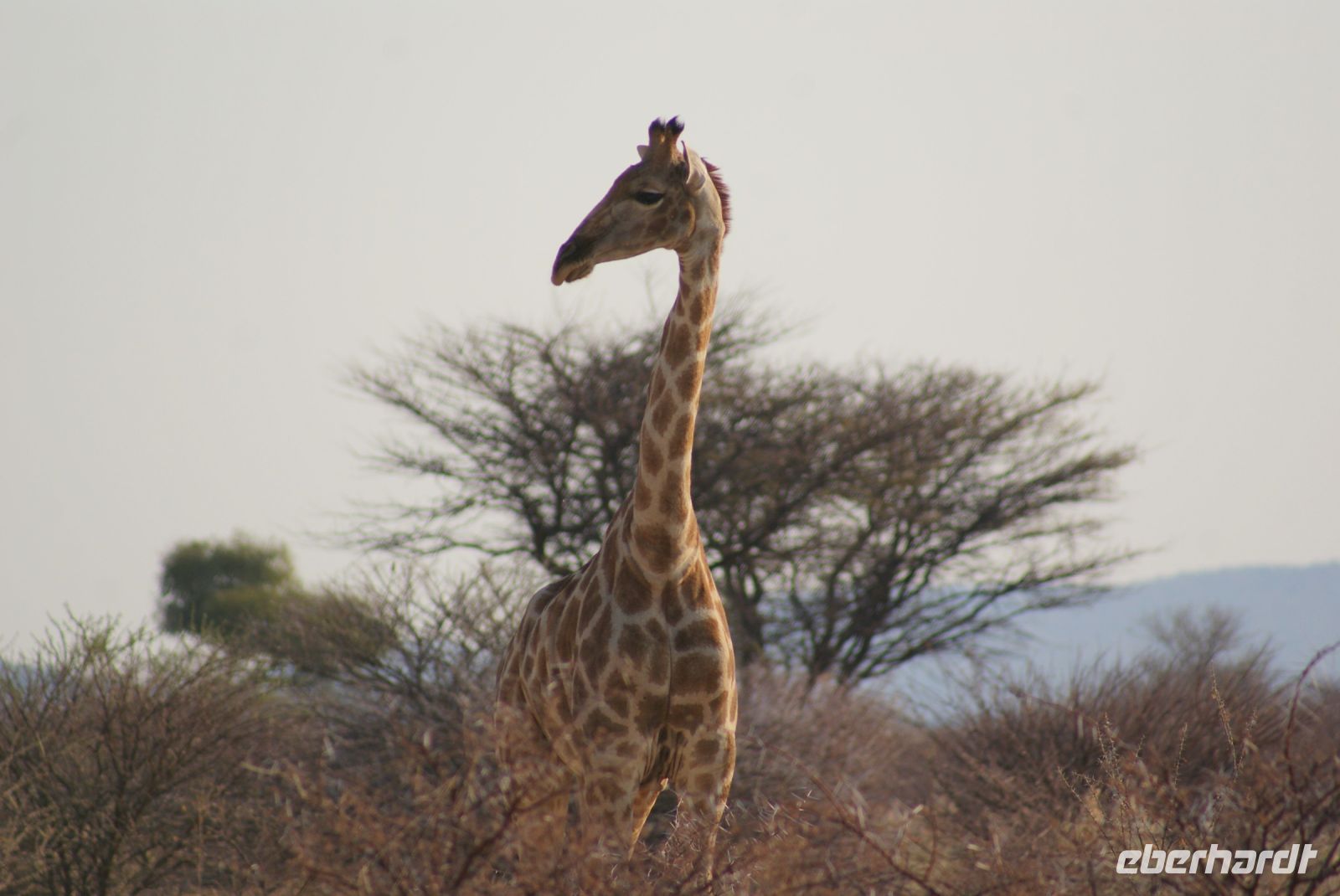 Nach einem ruhigen Flug haben wir es am frühen Morgen endlich geschafft. Noch schnell das Einreiseprocedere hinter uns bringen und schon nimmt uns unser Driverguide Gian-Paolo Tommasi herzlich in Empfang. Wir starten zunächst mit dem Sparmarkt in Windhoek, um uns mit einheimischen Produkten wie Adapter, Mückenpräparaten und einem kleinen Mittagssnack zu versorgen. Danach geht es auf City Tour. Wir parken an der wunderschönen alten Christuskirche und spazieren von dort aus zu Fuß zum Unabhängigkeitsmuseum (auch Kaffeemaschine genannt), weiter zur Alten Feste bis hin zum Tintenpalast. Alles Bauten aus vergangenen Zeiten, die noch erstaunlich gut erhalten sind. Wir setzen die Reise fort, halten in Okahandja (bedeutet: „wo zwei Flüsse zu einem werden“), genießen ein kühles Getränk oder leckeren Kaffee, kosten das erste Biltong/Trockenfleisch, bevor es dann zu unserem Tagesziel der Otjiwa Lodge geht. Hier angekommen, machen wir uns kurz frisch und schon steht unsere erste Pirschfahrt zum Sundowner bevor. Guide Moses fährt und führt uns und wir staunen nicht schlecht, was wir am ersten Nachmittag bereits zu sehen bekommen. So kreuzen Impalas, Springböcke, Steinböcke, Giraffen, Perlhühner, Riesentrappen, Bienenfresser sowie Waffenkibitze und weitere unseren Weg und wir genießen die herrliche Stimmung. Kurz vor Sonnenuntergang finden wir uns auf einem Hügel ein, wo schon einige Köstlichkeiten und kalte Getränke auf uns warten. Wir genießen den Ausblick und Augenblick in vollen Zügen. Zurück im Hotel erfolgt ein sehr schmackhaftes Abendessen, wo wir zwischen Wild, Hecht und Vegetarisch entscheiden können.