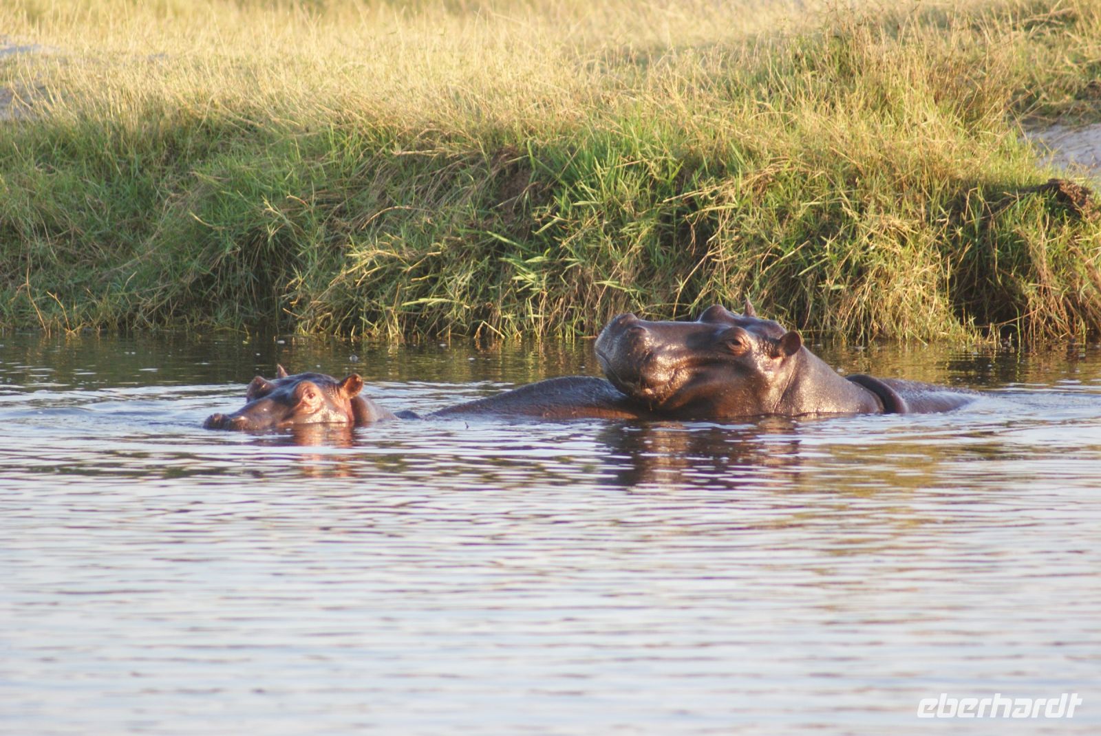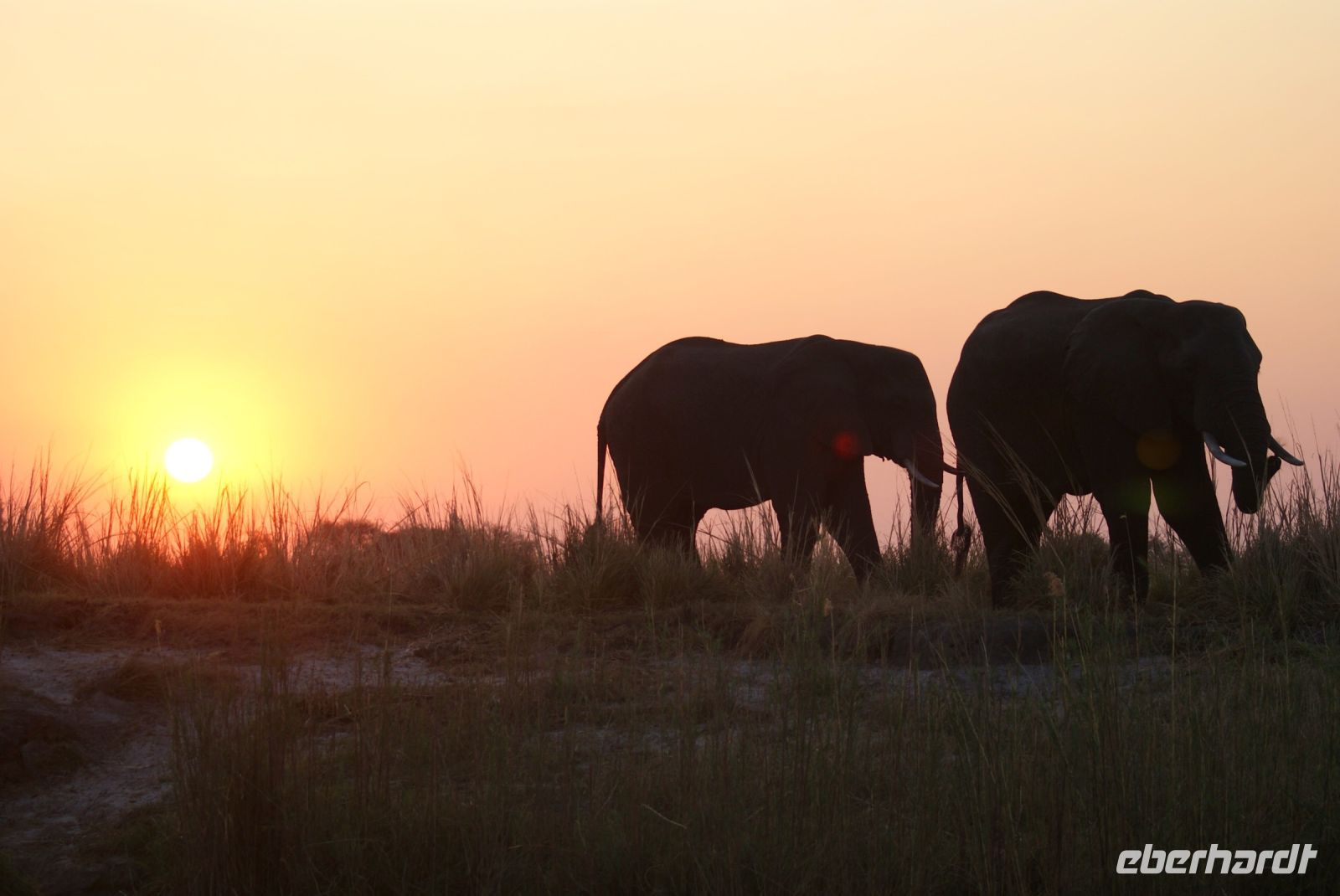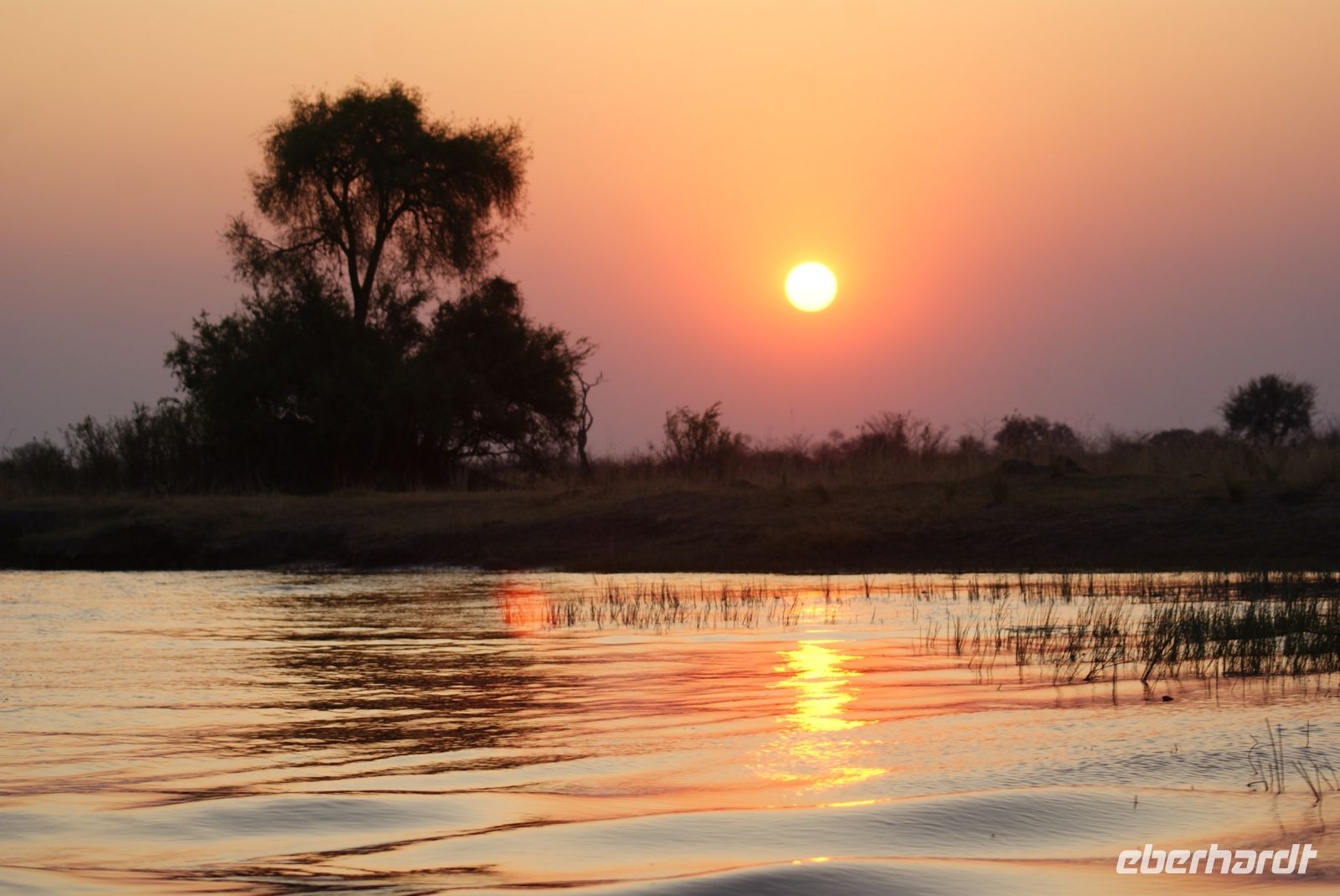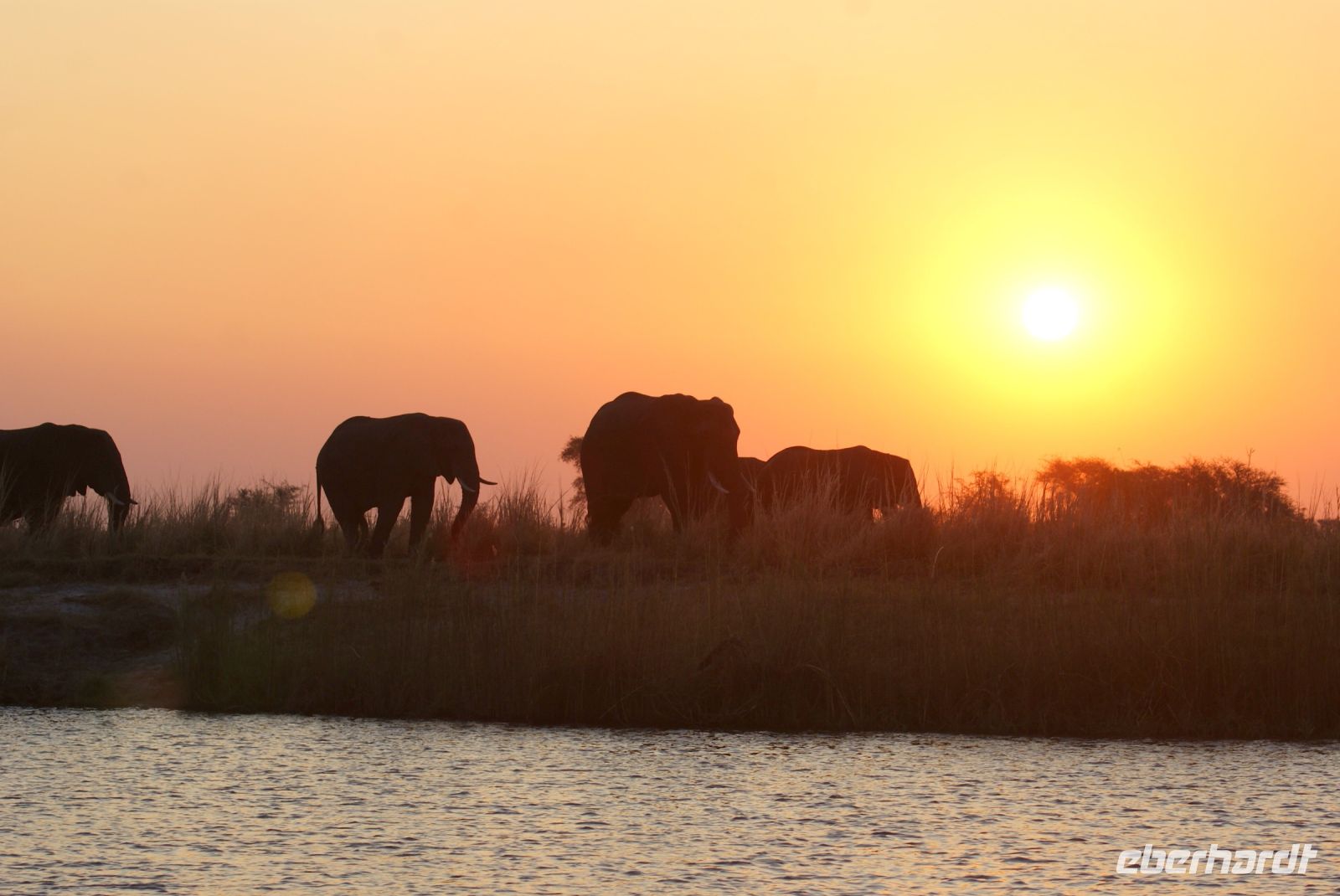 Mit den Geräuschen der namibianischen Natur, begleitet von Klicklauten der Frösche und Grunzen der Flusspferde haben wir eine herrliche Nacht verbracht. So treffen wir uns gut gelaunt zum reichhaltigen Frühstück und verlassen im Anschluss die Lodge, um via Bootstransfer zu unseren Safarijeeps zu gelangen. Es erfolgt eine 3-stündige Pirschfahrt, wo wir so manch seltene Tiere zu Gesicht bekommen. Hierzu zählt die vom Aussterben bedrohte Rappenantilope sowie die Lechwe (Sumpf)-Antilopen, die es hauptsächlich hier in den Sumpfgebieten gibt. Vorbei am Leberwurstbaum mit seinen bis zu 6 Kg schweren Früchten, weist uns Guide Aldrin darauf hin, dass es nicht ratsam ist, unter einem solchen zu zelten… Gut, dass wir noch eine weitere Nacht gebucht haben, zum ersten Mal auf unserer Reise durch Namibia sehen wir nun zahlreiche Büffel, die als das bekanntlich gefährlichste Tier der „Big Five“ gelten und die im Etosha Nationalpark nicht mehr vorhanden sind. Auch Elefanten geben sich die Ehre, mit einer großen Herde mit ca. 20 Tieren am Wasser, wo diese genüsslich trinken und wir sie in aller Ruhe beobachten können. Guide Aldrin erkennt, dass etwas im Busch ist. Kudu Antilopen und Gnus starren in eine Richtung-da muss Gefahr lauern. So fahren wir dort hin und entdecken eine Hyäne im Busch, die von uns reiß aus nimmt. Ein tolles Erlebnis, dieses mächtige Tier so nah zu sehen. Abschließend sehen wir neben Weißrückengeiern, Gabelracken, Bienenfressern noch die sehr seltene Tsosebe Antilope, die die schnellste unter den Antilopen Afrikas ist und bis zu 100 Km/h laufen kann. Zurück zur Lodge fahren wir wieder per Boot und freuen uns über den tollen Vormittag mit besonderen Erlebnissen. Die Mittagszeit verbringen wir nach Lust und Laune und genießen die Ruhe in unserer Anlage. Am späten Nachmittag starten wir per Boot zur Sundowner-Tour auf dem Kwando. Erneut genießen wir auf dem Wasser die herrliche Landschaft, die Bienenfresser und Eisvögel, die um uns herum ihre Flugakrobatik zum Besten geben, bestaunen den afrikanischen Jacana, der auch „Jesusvogel“ genannt wird („kann auf den Blättern im Wasser laufen“). So manche Antilopen sehen wir am Ufer und das unvergessliche Highlight sollte folgen. Zum Sonnenuntergang stoppen wir unser Boot, um mit einem kühlen Getränk auf den Tag anzustoßen. Plötzlich kommen mehrere Elefantenherden in unmittelbarer Nähe zum Fluss, um hier zu trinken. Was für ein unglaublicher Moment-wir sind sprachlos. Schöner kann es nicht sein. Dazu die untergehende Sonne, die friedlichen Tiere und wir mittendrin. Die anschließende Rückfahrt lässt uns still die Ereignisse Revue passieren und wir sind dankbar all dies hier erlebt zu haben. Ein letztes Abendessen unter dem namibianischen Sternenhimmel erfolgt hier am Kwando bevor wir morgen weiter nach Botswana ziehen.