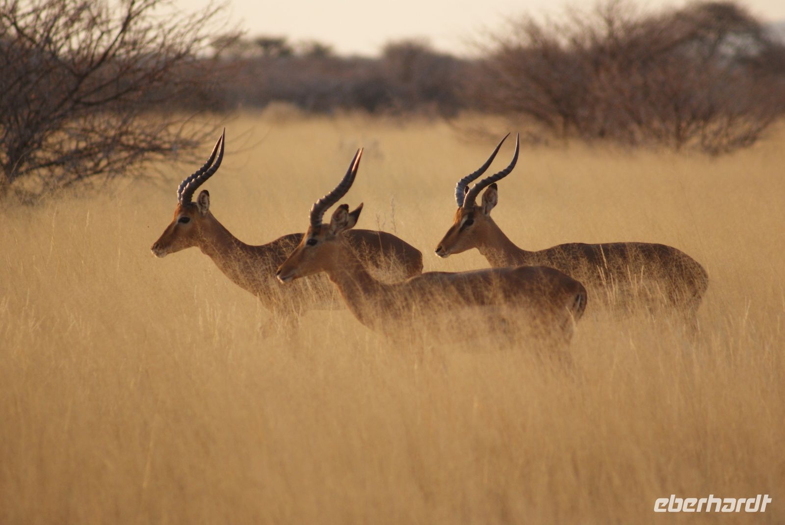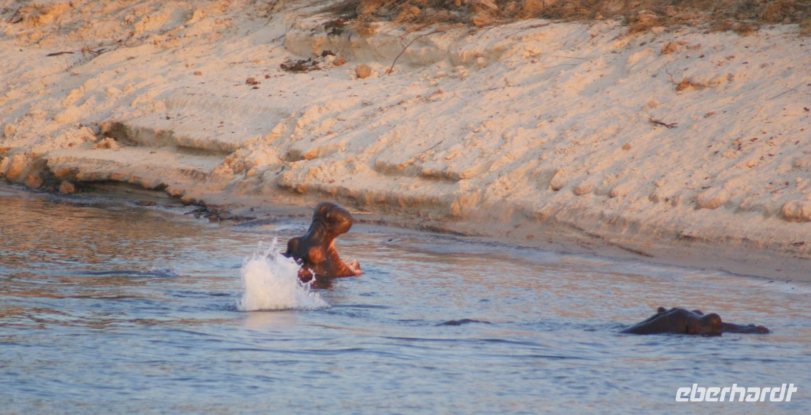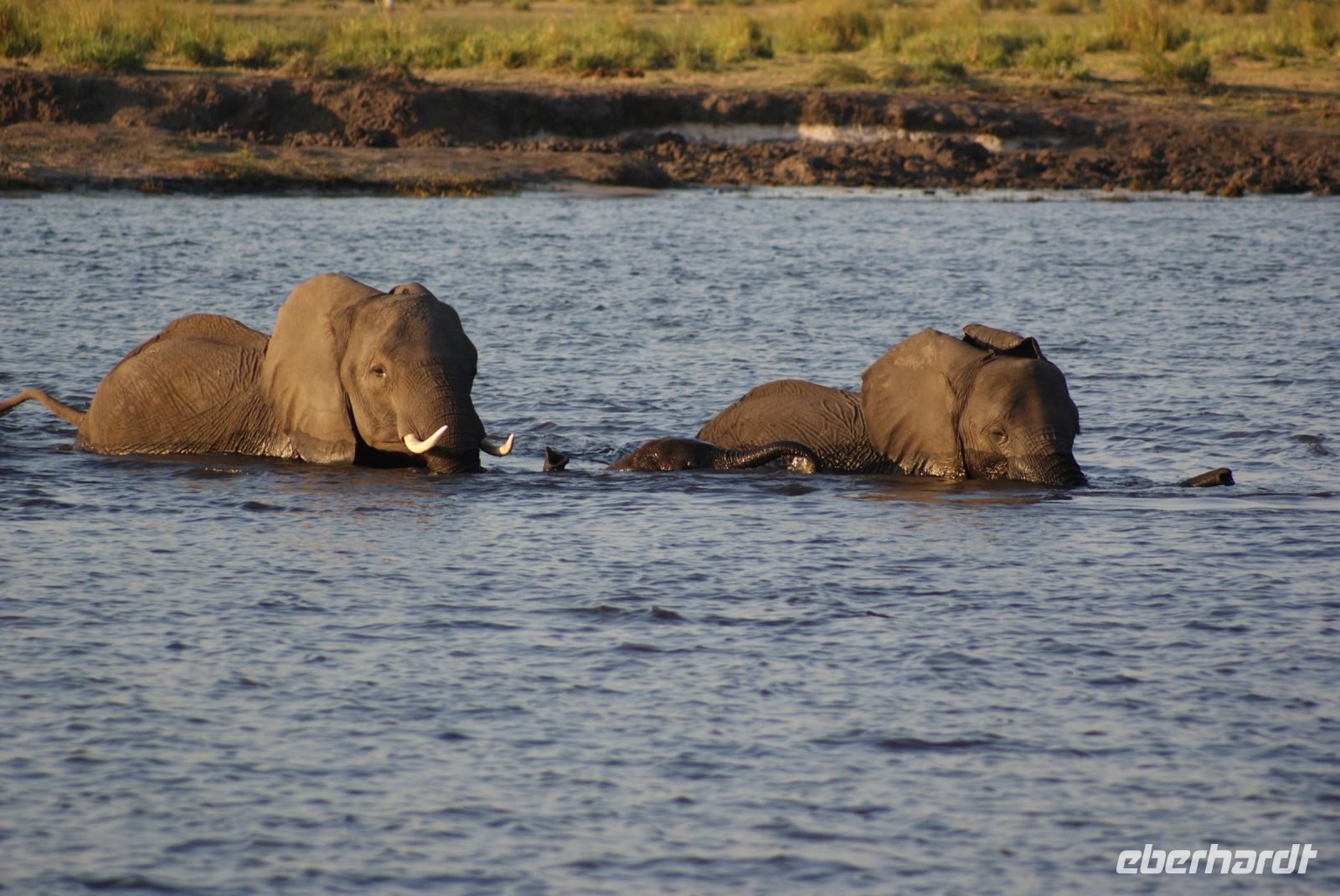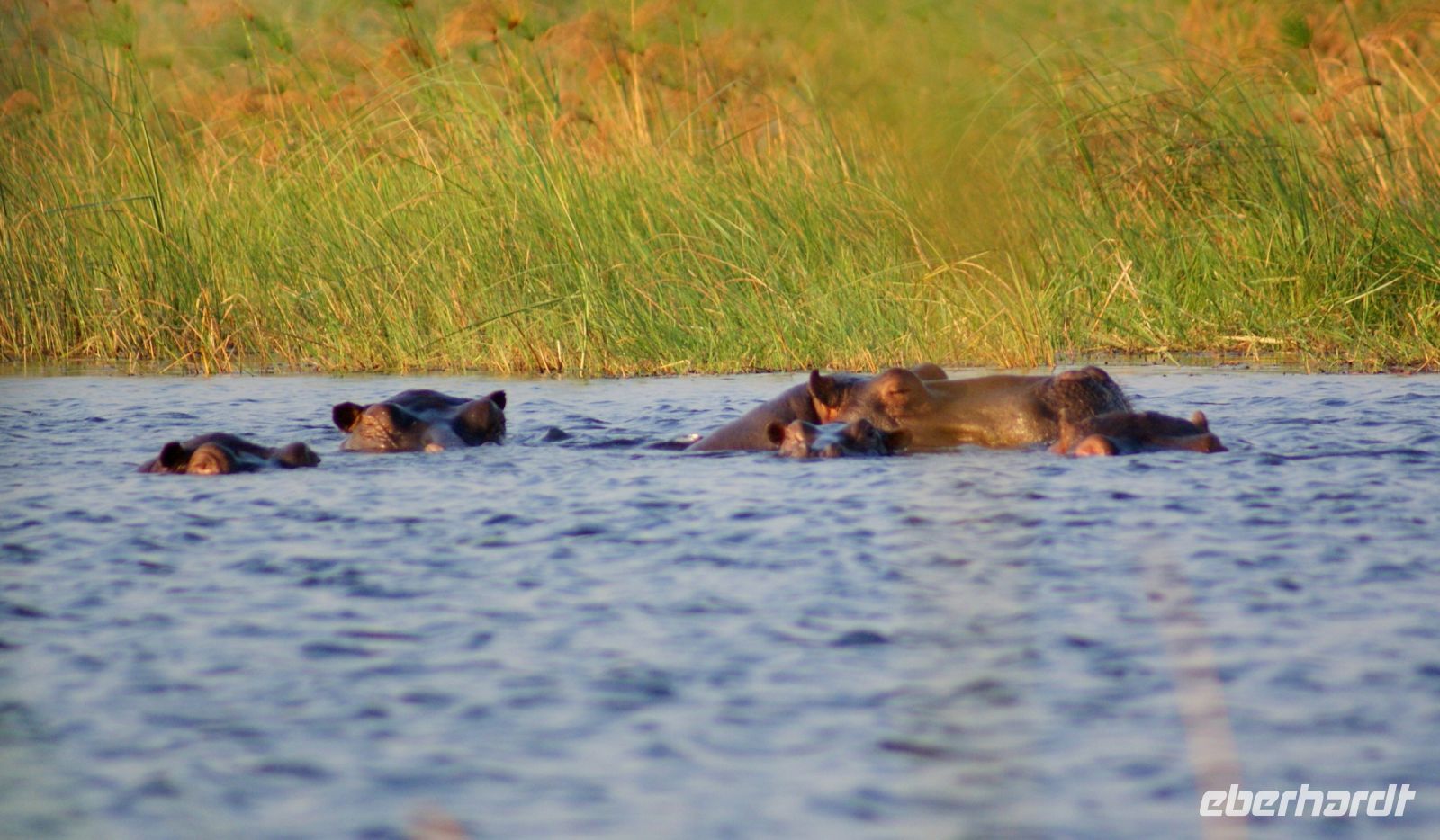 Mit den Geräuschen der namibianischen Natur, begleitet von Klicklauten der Frösche und Grunzen der Flusspferde haben wir eine herrliche Nacht verbracht. So treffen wir uns gut gelaunt zum reichhaltigen Frühstück und verlassen im Anschluss die Lodge, um via Bootstransfer zu unseren Safarijeeps zu gelangen. Es erfolgt eine 3-stündige Pirschfahrt, wo wir so manch seltene Tiere zu Gesicht bekommen. Hierzu zählt die vom Aussterben bedrohte Rappenantilope sowie die Lechwe (Sumpf)-Antilopen, die es hauptsächlich hier in den Sumpfgebieten gibt. Vorbei am Leberwurstbaum mit seinen bis zu 6 Kg schweren Früchten, weist uns Guide Aldrin darauf hin, dass es nicht ratsam ist, unter einem solchen zu zelten… Gut, dass wir noch eine weitere Nacht gebucht haben, zum ersten Mal auf unserer Reise durch Namibia sehen wir nun zahlreiche Büffel, die als das bekanntlich gefährlichste Tier der „Big Five“ gelten und die im Etosha Nationalpark nicht mehr vorhanden sind. Auch Elefanten geben sich die Ehre, mit einer großen Herde mit ca. 20 Tieren am Wasser, wo diese genüsslich trinken und wir sie in aller Ruhe beobachten können. Guide Aldrin erkennt, dass etwas im Busch ist. Kudu Antilopen und Gnus starren in eine Richtung-da muss Gefahr lauern. So fahren wir dort hin und entdecken eine Hyäne im Busch, die von uns reiß aus nimmt. Ein tolles Erlebnis, dieses mächtige Tier so nah zu sehen. Abschließend sehen wir neben Weißrückengeiern, Gabelracken, Bienenfressern noch die sehr seltene Tsosebe Antilope, die die schnellste unter den Antilopen Afrikas ist und bis zu 100 Km/h laufen kann. Zurück zur Lodge fahren wir wieder per Boot und freuen uns über den tollen Vormittag mit besonderen Erlebnissen. Die Mittagszeit verbringen wir nach Lust und Laune und genießen die Ruhe in unserer Anlage. Am späten Nachmittag starten wir per Boot zur Sundowner-Tour auf dem Kwando. Erneut genießen wir auf dem Wasser die herrliche Landschaft, die Bienenfresser und Eisvögel, die um uns herum ihre Flugakrobatik zum Besten geben, bestaunen den afrikanischen Jacana, der auch „Jesusvogel“ genannt wird („kann auf den Blättern im Wasser laufen“). So manche Antilopen sehen wir am Ufer und das unvergessliche Highlight sollte folgen. Zum Sonnenuntergang stoppen wir unser Boot, um mit einem kühlen Getränk auf den Tag anzustoßen. Plötzlich kommen mehrere Elefantenherden in unmittelbarer Nähe zum Fluss, um hier zu trinken. Was für ein unglaublicher Moment-wir sind sprachlos. Schöner kann es nicht sein. Dazu die untergehende Sonne, die friedlichen Tiere und wir mittendrin. Die anschließende Rückfahrt lässt uns still die Ereignisse Revue passieren und wir sind dankbar all dies hier erlebt zu haben. Ein letztes Abendessen unter dem namibianischen Sternenhimmel erfolgt hier am Kwando bevor wir morgen weiter nach Botswana ziehen.