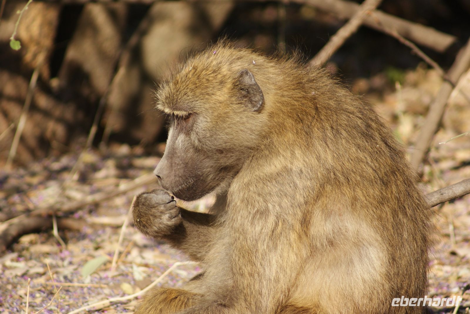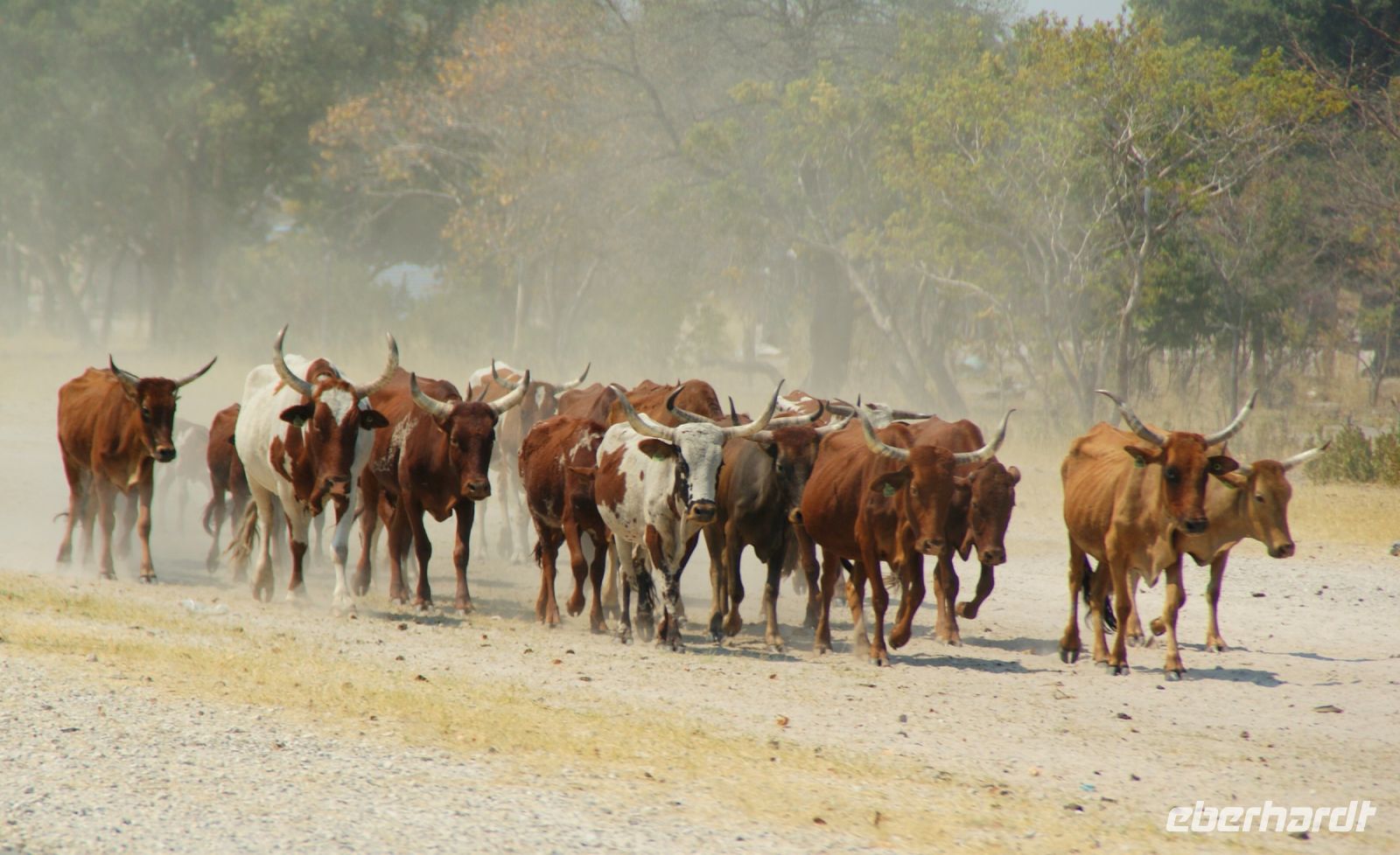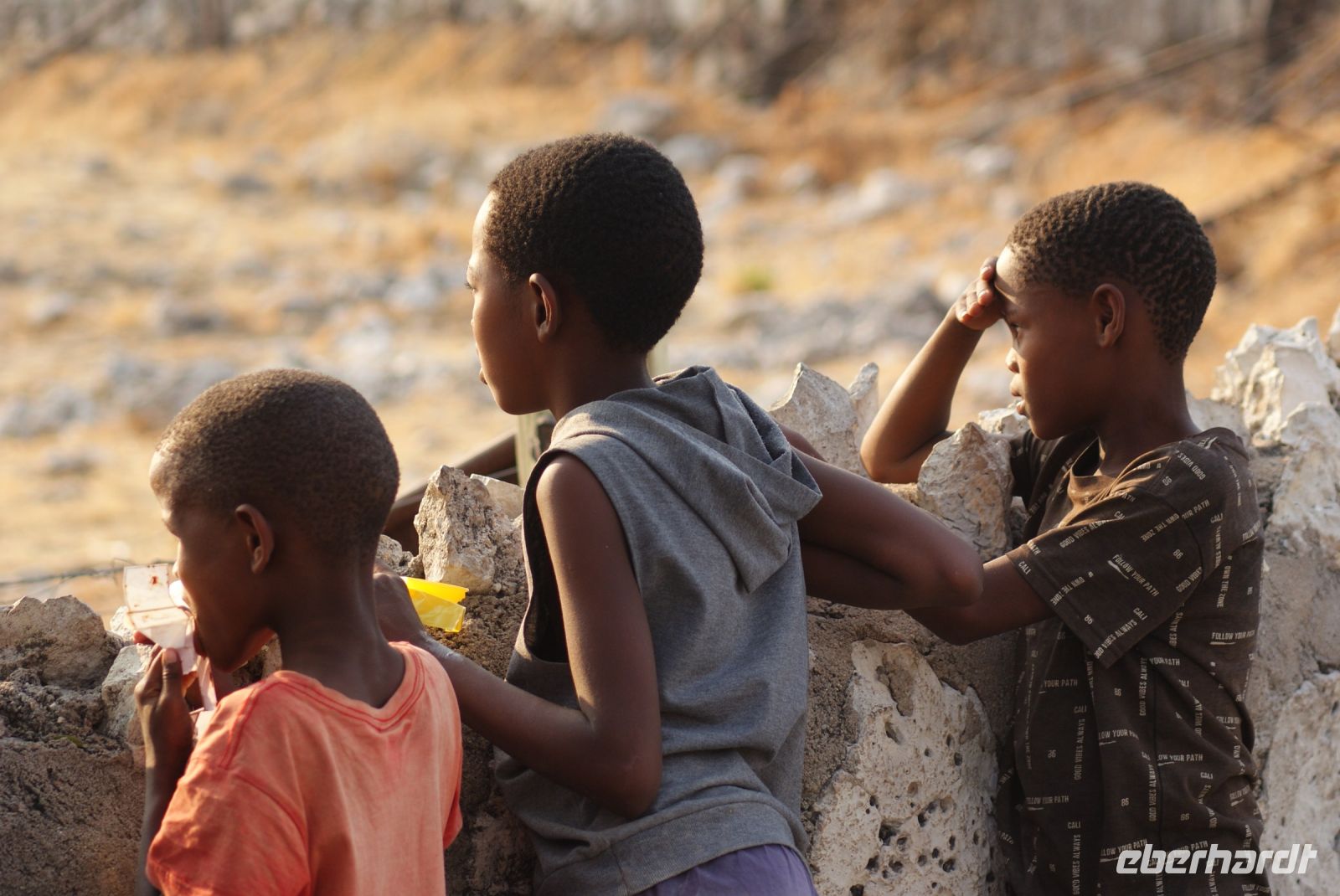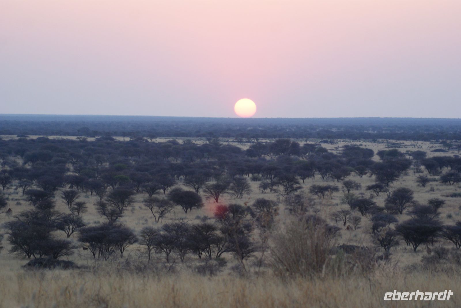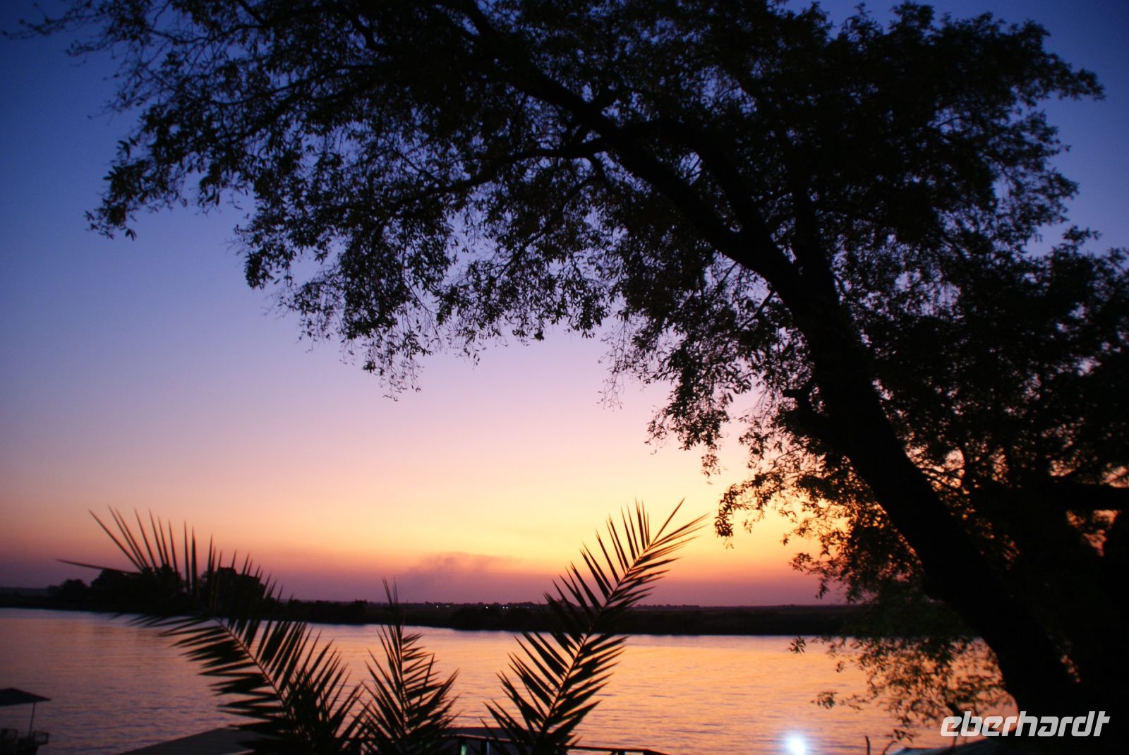 Nach einem recht deutschen Frühstück verlassen wir die Minenstadt Tsumeb, nicht jedoch ohne noch eine kleine Stadtrundfahrt zu unternehmen. Eine wunderschöne Kulisse bieten hierbei die bereits lila blühenden Jacaranda Bäume, die vielen Bougainvilleas und die gepflegten Anlagen. Schöne Gebäude und Kirchen aus vergangener, deutscher Zeit halten für uns schöne Eindrücke und Fotomotive bereit. Tsumeb wird uns als eine sehr gemütliche und schöne Stadt in Erinnerung bleiben. Weiter geht die Reise, wir haben heute eine lange Strecke vor uns. 500 Km gilt es zu bewältigen, über Grootfontein (Große Quelle) geht es nach Rundu und von dort aus nach Divundu, wo in der Nähe gut versteckt unsere nächste, herrliche Unterkunft liegen wird. Hier im Norden Namibias wird es nun für uns so richtig afrikanisch. Wir sehen viele Grundstücke, wo die Menschen noch in Rundhütten leben, sich das Leben auf der Straße abspielt, das Vieh in Eigenregie unseren Weg kreuzt. Als Überraschung für unsere Gäste gibt es heute ein von Eberhardt TRAVEL organisiertes Mittagspicknick. Hierzu nutzen wir den Mururani Campingplatz, wo wir einen sehr idyllischen Ort vorfinden, bei dem wir ein schönes Buffet anbieten können. So genießen wir die Köstlichkeiten in netter Runde und die Auszeit unserer heutigen Fahrstrecke. Bei den lokalen Holzschnitzern erfolgt ein Zwischenstopp und so manch kleiner Elefant wechselt heute den Besitzer. Am späten Nachmittag erreichen wir die am Okavango sehr idyllisch gelegene Mahangu Safari Lodge und werden von Deutsch-Namibianer Felix herzlich in unserer Landessprache willkommen geheißen! Dieser weist uns in die Besonderheiten der Anlage ein und wir freuen uns bereits auf unser heutiges, afrikanisches Abendessen: Roulade mit Spätzle…. Dieses genießen wir auf der Terrasse direkt am Okavango Fluss, untermalt vom Rufen so manches Flusspferdes und des bald blutrot aufgehenden Mondes.