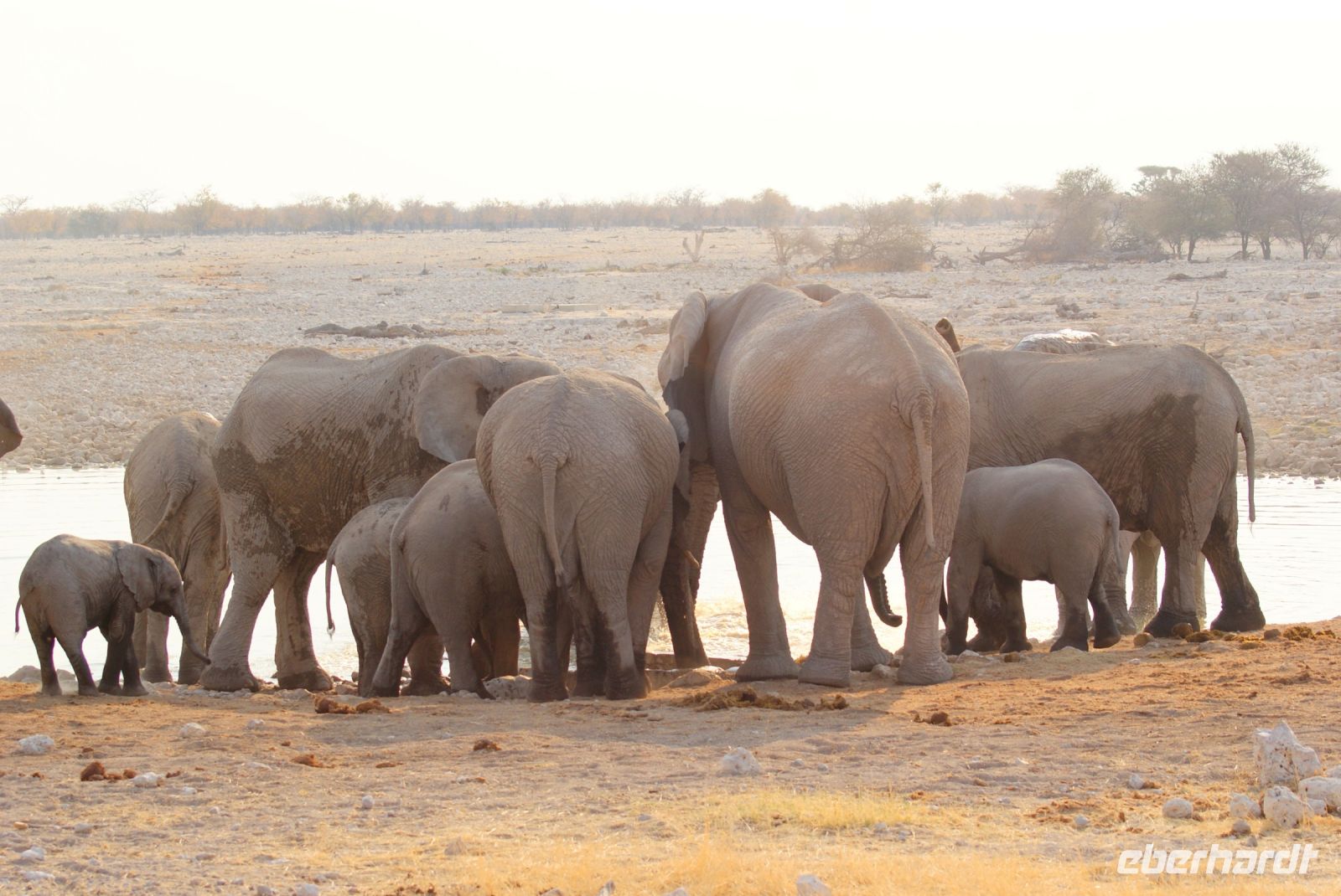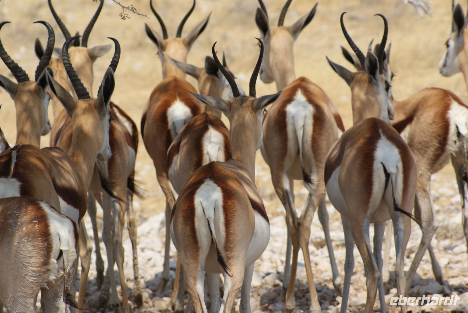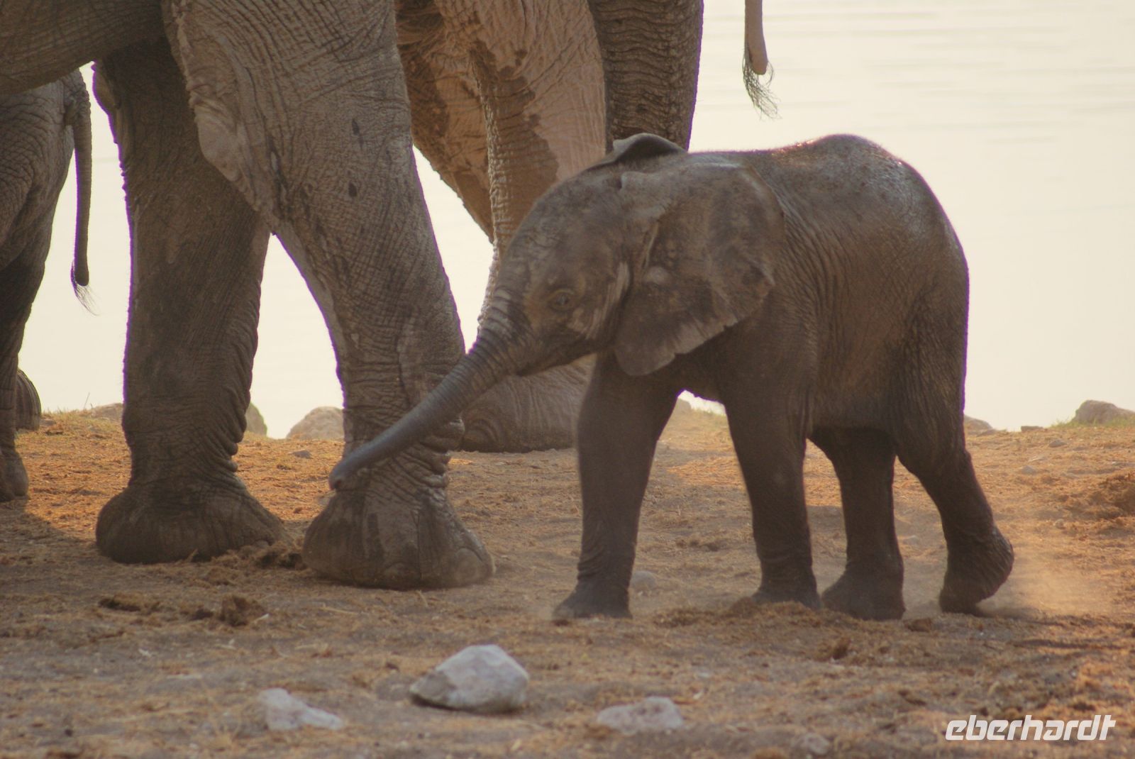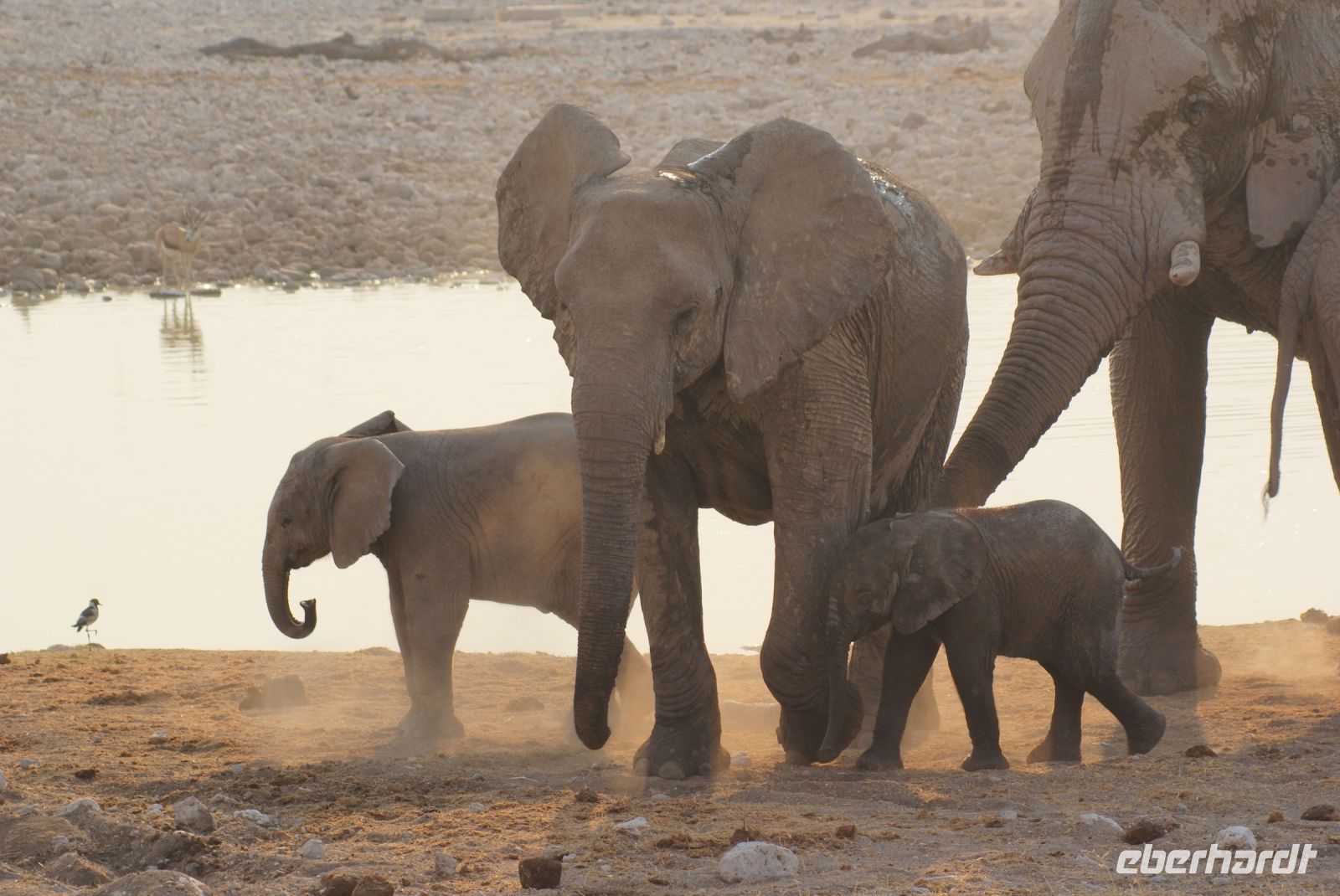 Nach einem tollen Frühstück verlassen wir bereits am sehr frühen Morgen unsere Lodge, um als eine der ersten nach Öffnung des Parks zum Sonnenaufgang hineinzufahren. Auf Safari gilt es die frühen Morgenstunden zu nutzen, in denen es noch kühl ist und man gute Möglichkeiten hat, die Tiere zu sichten. Unser Engagement soll schon bald belohnt werden. Eine Gruppe Elandantilopen, die größte Antilopenart Afrikas, kreuzt unseren Weg und wir bestaunen diese mächtigen Tiere, die bis zu 950 Kg schwer werden können. Anschließend erhalten wir einen heißen Tipp zu einer ganz besonderen Sichtung. Wir folgen diesem und entdecken schon bald ein mittlerweile sehr seltenes Spitzmaulnashorn, welches genüsslich die Blätter eines Buschs verzehrt. Kurz darauf stoßen wir auf eine Tüpfelhyäne, die an uns vorbeizieht. An einem Wasserloch hält sich eine Gruppe Kuhantilopen auf und auch diese anmutigen Tiere, sind im Normalfall auch eher selten anzutreffen. Viele Oryxantilopen oder auch Gemsböcke genannt, kommen zum Wasserloch und bilden eine Einheit mit den bereits vorhandenen Kudukühen. Die heiße Mittagszeit verbringen wir in unserer Lodge und nutzen die kleine Auszeit für einen Sprung in den Pool, ein kühles Getränk oder etwas Augenpflege. Am frühen Nachmittag ziehen die meisten von uns nochmals mit in den Park und auch nun haben wir wieder tolle Tiersichtungen zu vermelden. Eine Elefantenherde von elf Tieren halten sich am Wegesrand auf, eine Elefantenkuh mit Kalb kreuzt unsere Straße und natürlich sehen wir erneut die üblichen Verdächtigen wie Springböcke, Giraffen, Oryxantilopen, Impalas. Wieder großes Glück-wir finden gleich zwei der majestätischen Sekretärvögel, die tatsächlich aussehen, als stolzierten sie im Frack daher, immer auf der Suche nach schmackhaften Kriechtieren. Abschließend besuchen wir nochmals das Wasserloch am Okaukuejo Restcamp, wo sich die Tiere jedoch verzogen haben. Dafür stoßen wir allerdings auf eine große Gruppe von Zebramangusten und zählen dreißig dieser possierlichen Tierchen. Nach so viel Natur und Tierwelt sind wir froh wieder in die Lodge zurückzukehren, freuen uns auf eine wohltuende Dusche, ein kühles Getränk und ein erneut herrliches Abendessen unterm Sternenhimmel.