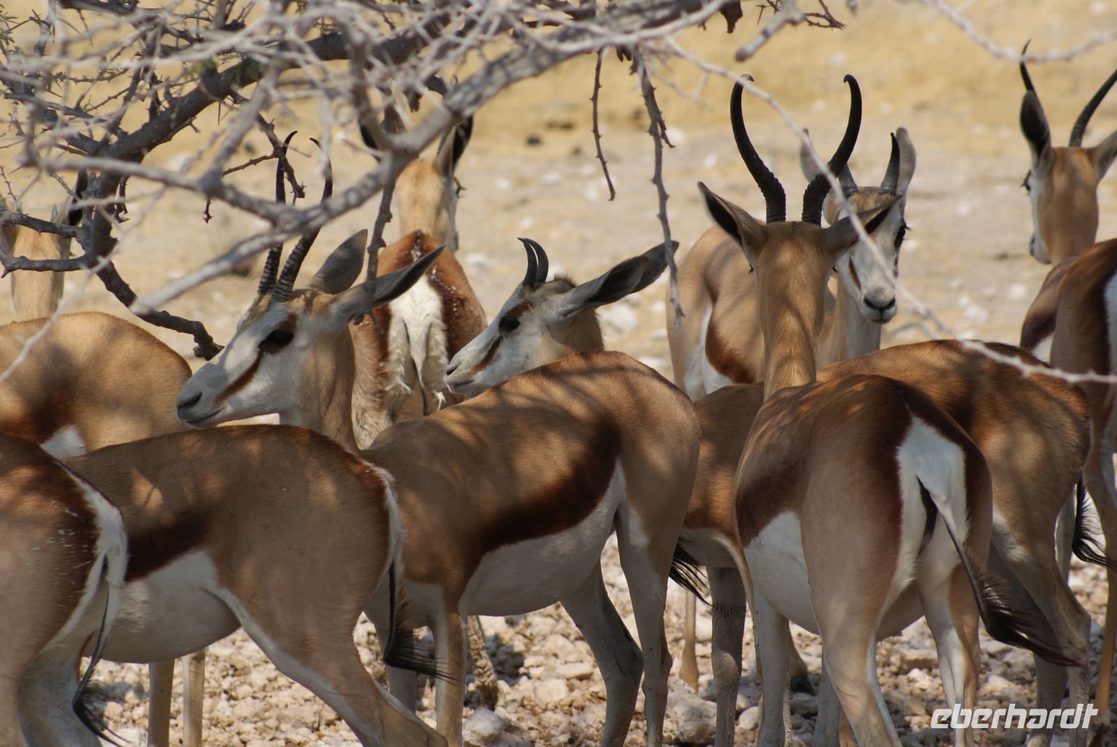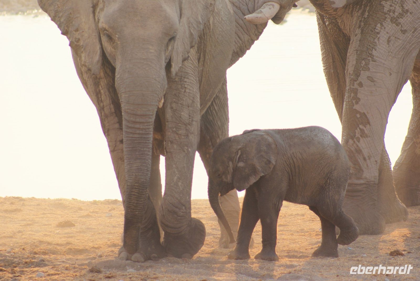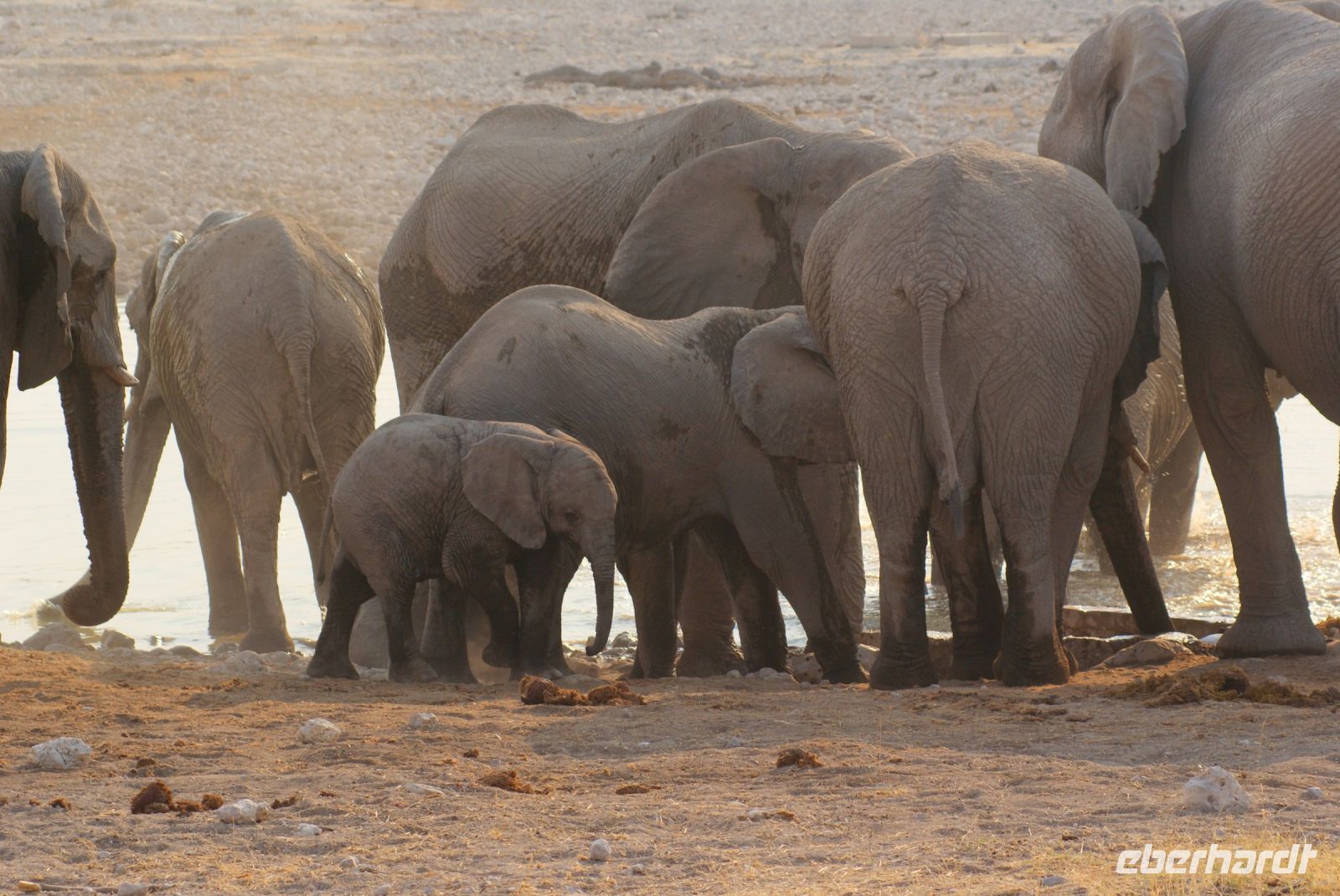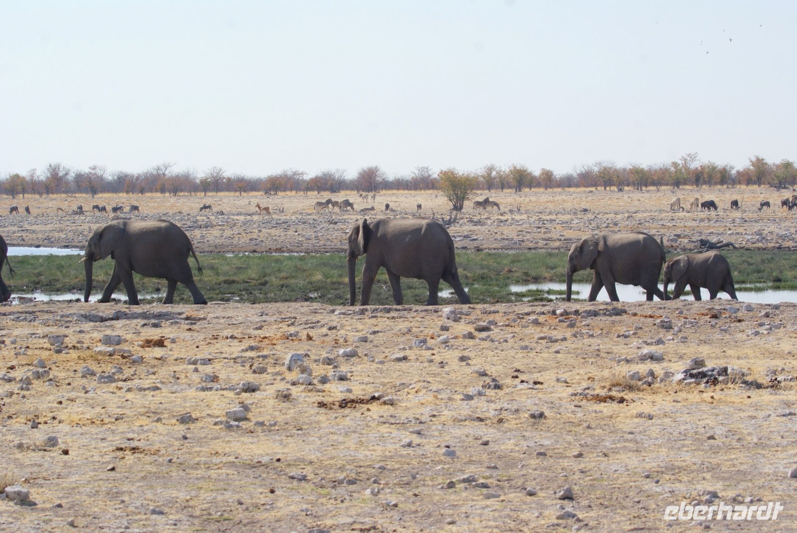 Nach einem tollen Frühstück verlassen wir bereits am sehr frühen Morgen unsere Lodge, um als eine der ersten nach Öffnung des Parks zum Sonnenaufgang hineinzufahren. Auf Safari gilt es die frühen Morgenstunden zu nutzen, in denen es noch kühl ist und man gute Möglichkeiten hat, die Tiere zu sichten. Unser Engagement soll schon bald belohnt werden. Eine Gruppe Elandantilopen, die größte Antilopenart Afrikas, kreuzt unseren Weg und wir bestaunen diese mächtigen Tiere, die bis zu 950 Kg schwer werden können. Anschließend erhalten wir einen heißen Tipp zu einer ganz besonderen Sichtung. Wir folgen diesem und entdecken schon bald ein mittlerweile sehr seltenes Spitzmaulnashorn, welches genüsslich die Blätter eines Buschs verzehrt. Kurz darauf stoßen wir auf eine Tüpfelhyäne, die an uns vorbeizieht. An einem Wasserloch hält sich eine Gruppe Kuhantilopen auf und auch diese anmutigen Tiere, sind im Normalfall auch eher selten anzutreffen. Viele Oryxantilopen oder auch Gemsböcke genannt, kommen zum Wasserloch und bilden eine Einheit mit den bereits vorhandenen Kudukühen. Die heiße Mittagszeit verbringen wir in unserer Lodge und nutzen die kleine Auszeit für einen Sprung in den Pool, ein kühles Getränk oder etwas Augenpflege. Am frühen Nachmittag ziehen die meisten von uns nochmals mit in den Park und auch nun haben wir wieder tolle Tiersichtungen zu vermelden. Eine Elefantenherde von elf Tieren halten sich am Wegesrand auf, eine Elefantenkuh mit Kalb kreuzt unsere Straße und natürlich sehen wir erneut die üblichen Verdächtigen wie Springböcke, Giraffen, Oryxantilopen, Impalas. Wieder großes Glück-wir finden gleich zwei der majestätischen Sekretärvögel, die tatsächlich aussehen, als stolzierten sie im Frack daher, immer auf der Suche nach schmackhaften Kriechtieren. Abschließend besuchen wir nochmals das Wasserloch am Okaukuejo Restcamp, wo sich die Tiere jedoch verzogen haben. Dafür stoßen wir allerdings auf eine große Gruppe von Zebramangusten und zählen dreißig dieser possierlichen Tierchen. Nach so viel Natur und Tierwelt sind wir froh wieder in die Lodge zurückzukehren, freuen uns auf eine wohltuende Dusche, ein kühles Getränk und ein erneut herrliches Abendessen unterm Sternenhimmel.