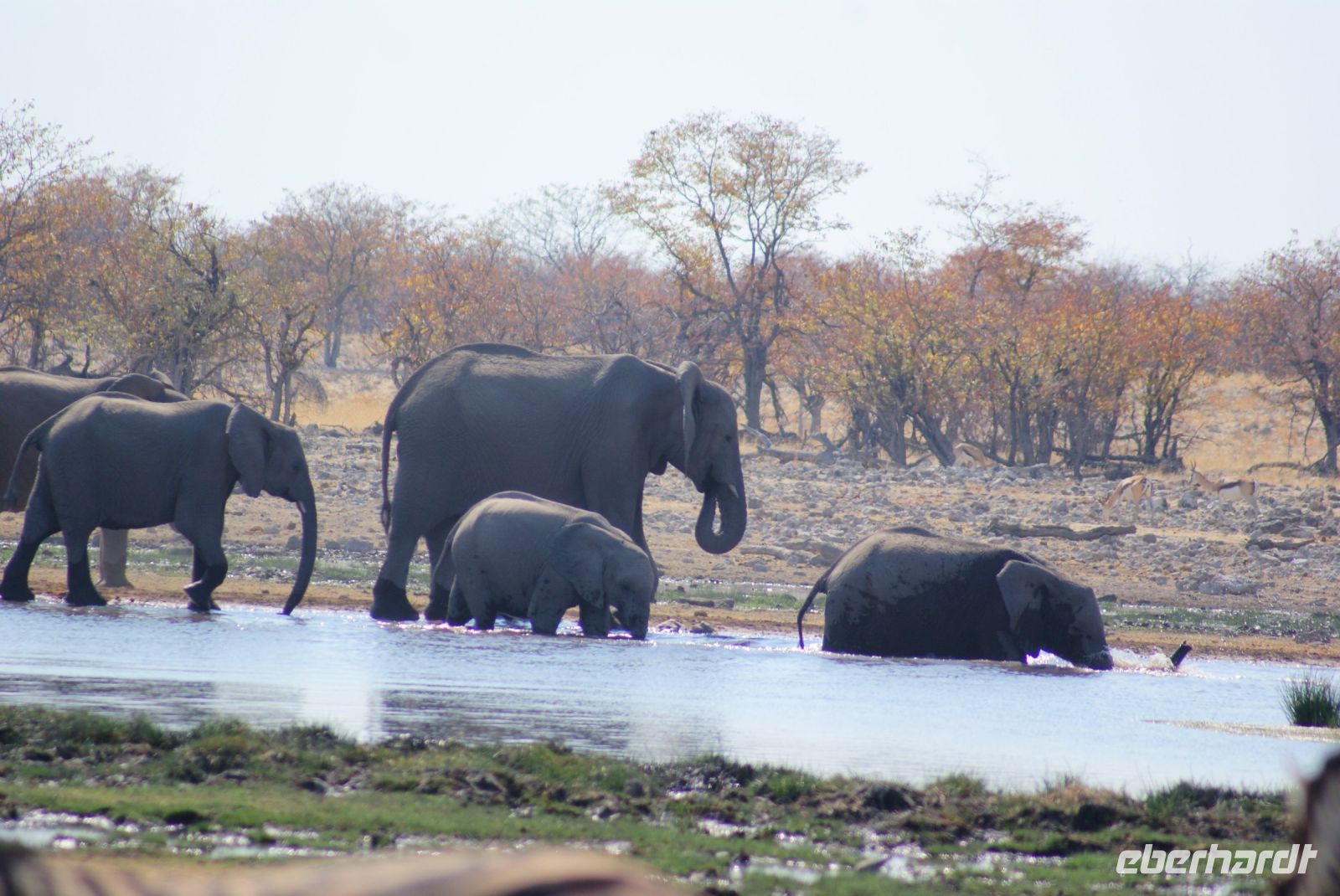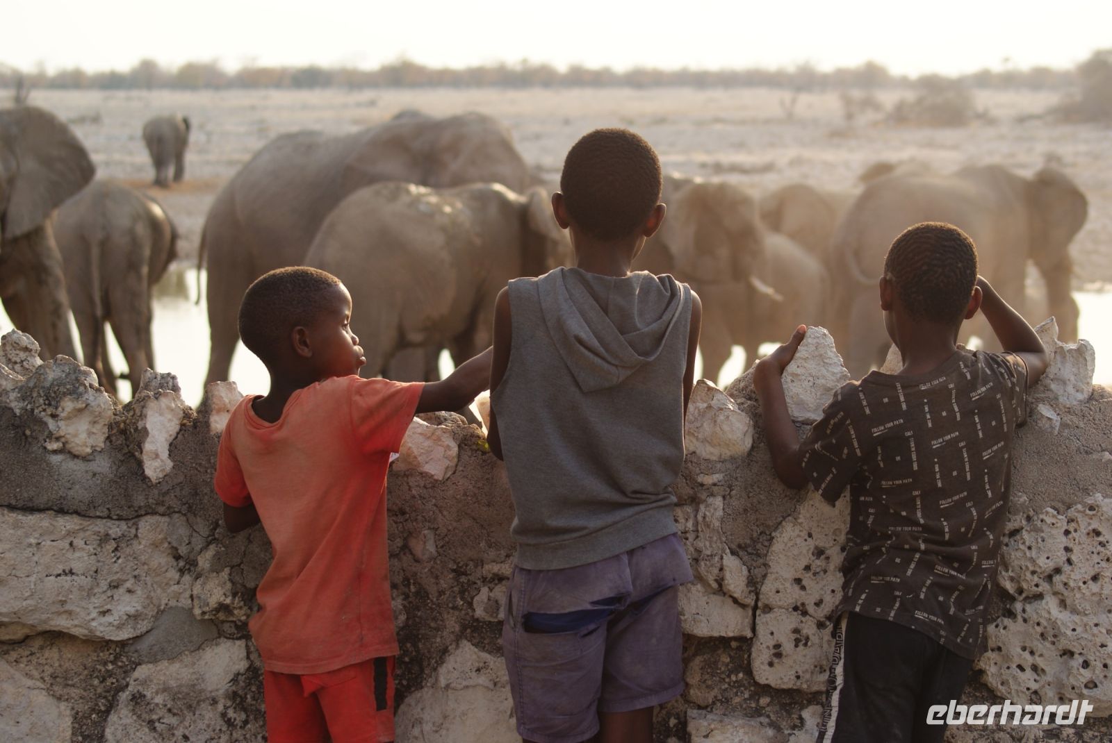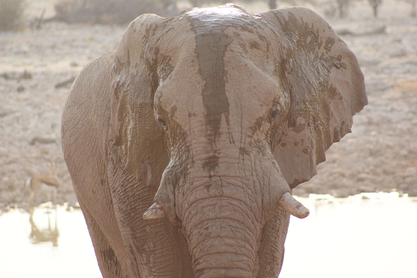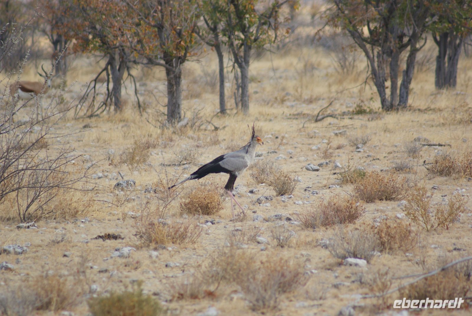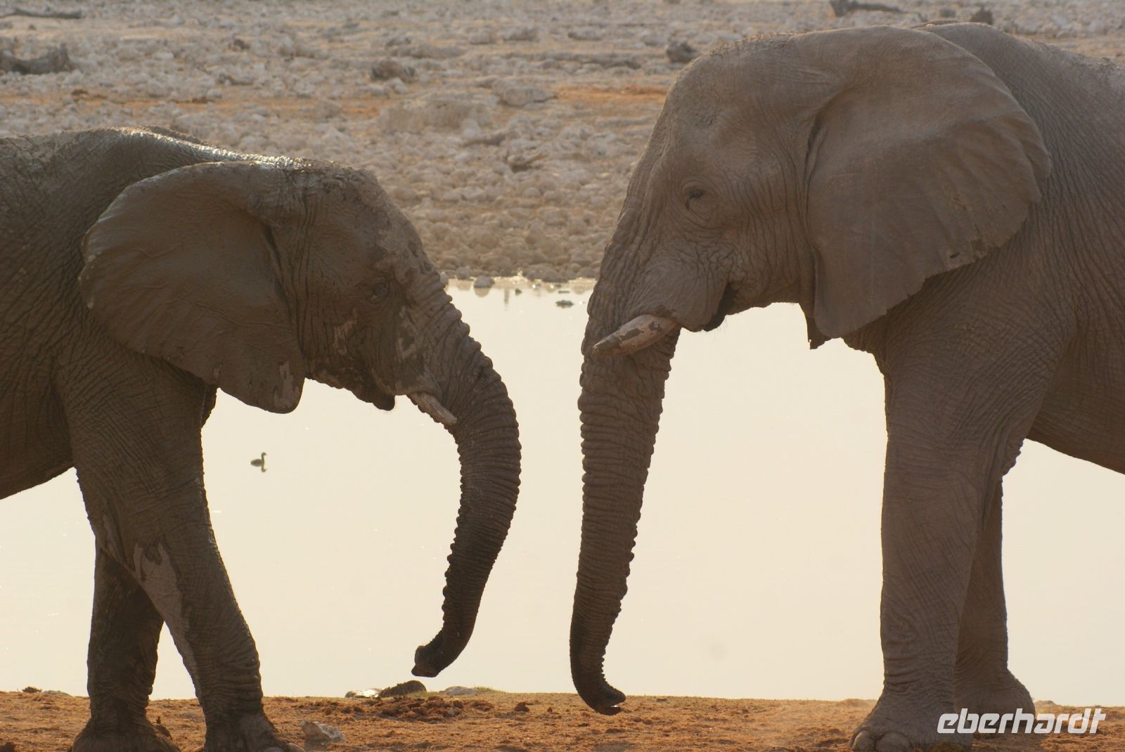 Nach einem tollen Frühstück verlassen wir bereits am sehr frühen Morgen unsere Lodge, um als eine der ersten nach Öffnung des Parks zum Sonnenaufgang hineinzufahren. Auf Safari gilt es die frühen Morgenstunden zu nutzen, in denen es noch kühl ist und man gute Möglichkeiten hat, die Tiere zu sichten. Unser Engagement soll schon bald belohnt werden. Eine Gruppe Elandantilopen, die größte Antilopenart Afrikas, kreuzt unseren Weg und wir bestaunen diese mächtigen Tiere, die bis zu 950 Kg schwer werden können. Anschließend erhalten wir einen heißen Tipp zu einer ganz besonderen Sichtung. Wir folgen diesem und entdecken schon bald ein mittlerweile sehr seltenes Spitzmaulnashorn, welches genüsslich die Blätter eines Buschs verzehrt. Kurz darauf stoßen wir auf eine Tüpfelhyäne, die an uns vorbeizieht. An einem Wasserloch hält sich eine Gruppe Kuhantilopen auf und auch diese anmutigen Tiere, sind im Normalfall auch eher selten anzutreffen. Viele Oryxantilopen oder auch Gemsböcke genannt, kommen zum Wasserloch und bilden eine Einheit mit den bereits vorhandenen Kudukühen. Die heiße Mittagszeit verbringen wir in unserer Lodge und nutzen die kleine Auszeit für einen Sprung in den Pool, ein kühles Getränk oder etwas Augenpflege. Am frühen Nachmittag ziehen die meisten von uns nochmals mit in den Park und auch nun haben wir wieder tolle Tiersichtungen zu vermelden. Eine Elefantenherde von elf Tieren halten sich am Wegesrand auf, eine Elefantenkuh mit Kalb kreuzt unsere Straße und natürlich sehen wir erneut die üblichen Verdächtigen wie Springböcke, Giraffen, Oryxantilopen, Impalas. Wieder großes Glück-wir finden gleich zwei der majestätischen Sekretärvögel, die tatsächlich aussehen, als stolzierten sie im Frack daher, immer auf der Suche nach schmackhaften Kriechtieren. Abschließend besuchen wir nochmals das Wasserloch am Okaukuejo Restcamp, wo sich die Tiere jedoch verzogen haben. Dafür stoßen wir allerdings auf eine große Gruppe von Zebramangusten und zählen dreißig dieser possierlichen Tierchen. Nach so viel Natur und Tierwelt sind wir froh wieder in die Lodge zurückzukehren, freuen uns auf eine wohltuende Dusche, ein kühles Getränk und ein erneut herrliches Abendessen unterm Sternenhimmel.