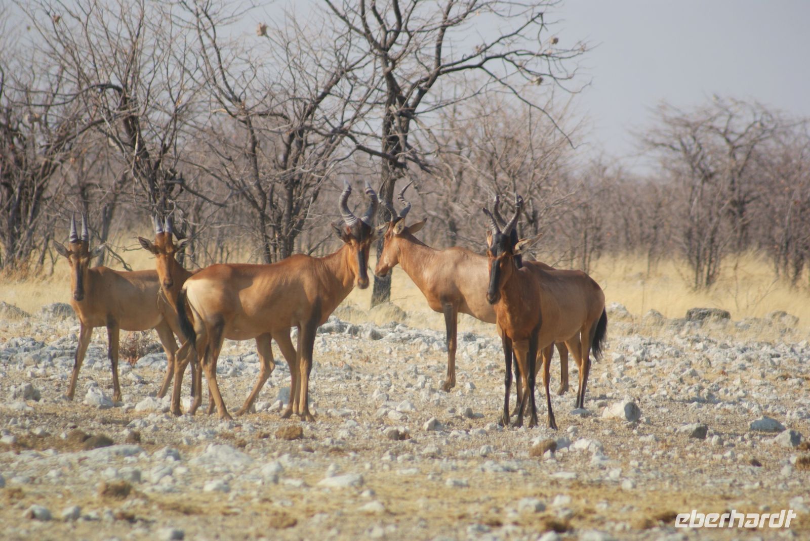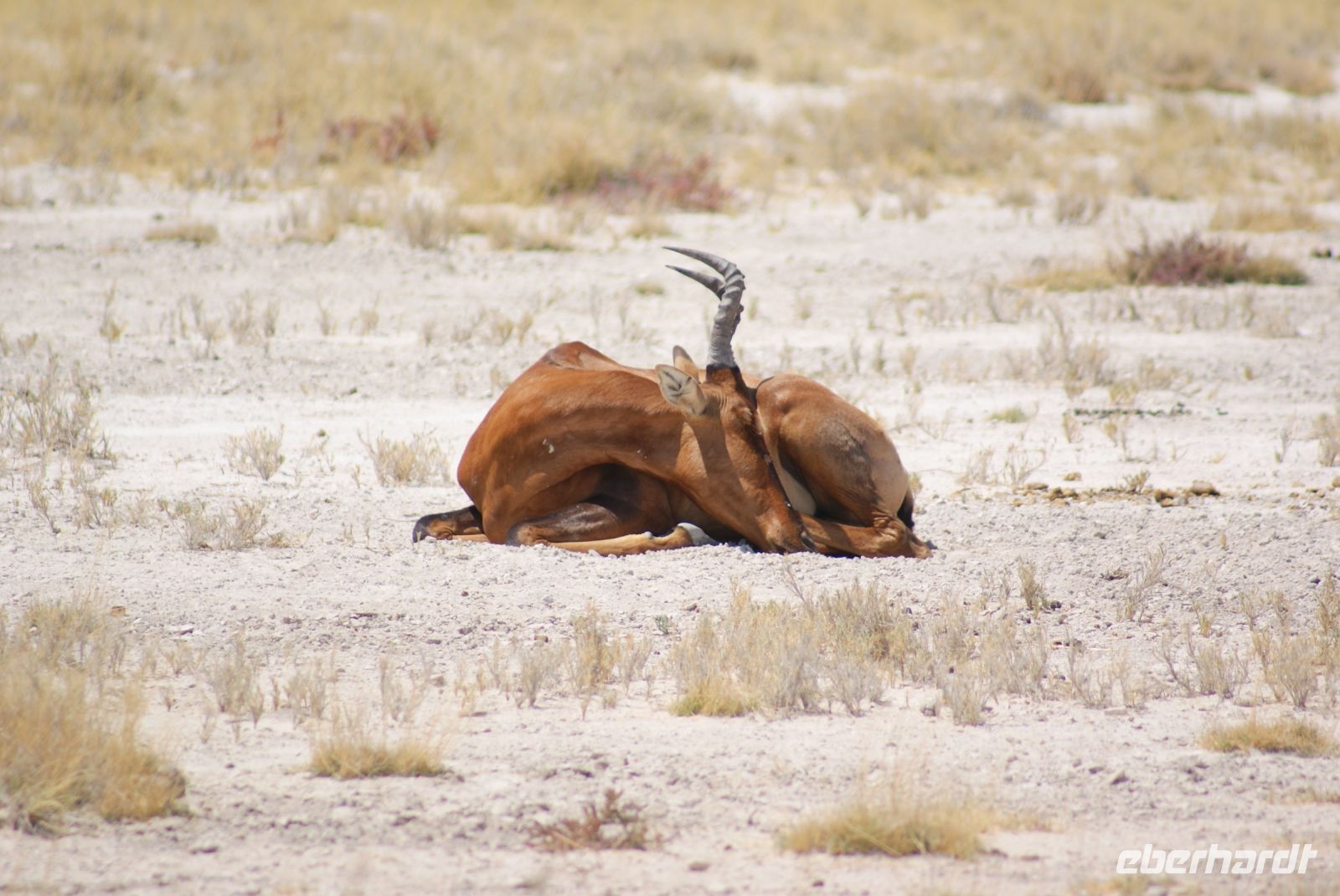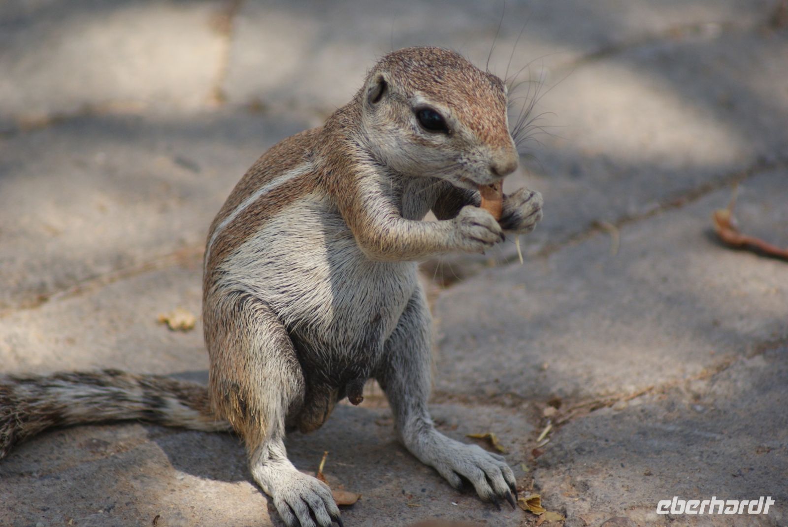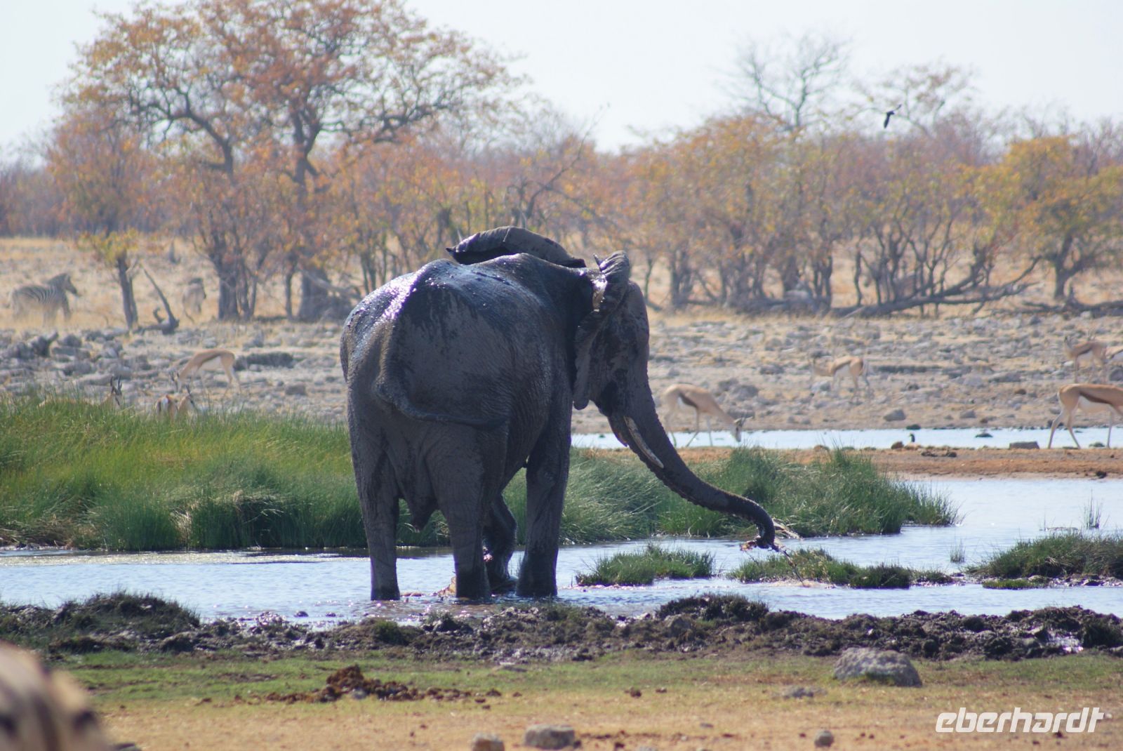 Nach einem tollen Frühstück verlassen wir bereits am sehr frühen Morgen unsere Lodge, um als eine der ersten nach Öffnung des Parks zum Sonnenaufgang hineinzufahren. Auf Safari gilt es die frühen Morgenstunden zu nutzen, in denen es noch kühl ist und man gute Möglichkeiten hat, die Tiere zu sichten. Unser Engagement soll schon bald belohnt werden. Eine Gruppe Elandantilopen, die größte Antilopenart Afrikas, kreuzt unseren Weg und wir bestaunen diese mächtigen Tiere, die bis zu 950 Kg schwer werden können. Anschließend erhalten wir einen heißen Tipp zu einer ganz besonderen Sichtung. Wir folgen diesem und entdecken schon bald ein mittlerweile sehr seltenes Spitzmaulnashorn, welches genüsslich die Blätter eines Buschs verzehrt. Kurz darauf stoßen wir auf eine Tüpfelhyäne, die an uns vorbeizieht. An einem Wasserloch hält sich eine Gruppe Kuhantilopen auf und auch diese anmutigen Tiere, sind im Normalfall auch eher selten anzutreffen. Viele Oryxantilopen oder auch Gemsböcke genannt, kommen zum Wasserloch und bilden eine Einheit mit den bereits vorhandenen Kudukühen. Die heiße Mittagszeit verbringen wir in unserer Lodge und nutzen die kleine Auszeit für einen Sprung in den Pool, ein kühles Getränk oder etwas Augenpflege. Am frühen Nachmittag ziehen die meisten von uns nochmals mit in den Park und auch nun haben wir wieder tolle Tiersichtungen zu vermelden. Eine Elefantenherde von elf Tieren halten sich am Wegesrand auf, eine Elefantenkuh mit Kalb kreuzt unsere Straße und natürlich sehen wir erneut die üblichen Verdächtigen wie Springböcke, Giraffen, Oryxantilopen, Impalas. Wieder großes Glück-wir finden gleich zwei der majestätischen Sekretärvögel, die tatsächlich aussehen, als stolzierten sie im Frack daher, immer auf der Suche nach schmackhaften Kriechtieren. Abschließend besuchen wir nochmals das Wasserloch am Okaukuejo Restcamp, wo sich die Tiere jedoch verzogen haben. Dafür stoßen wir allerdings auf eine große Gruppe von Zebramangusten und zählen dreißig dieser possierlichen Tierchen. Nach so viel Natur und Tierwelt sind wir froh wieder in die Lodge zurückzukehren, freuen uns auf eine wohltuende Dusche, ein kühles Getränk und ein erneut herrliches Abendessen unterm Sternenhimmel.