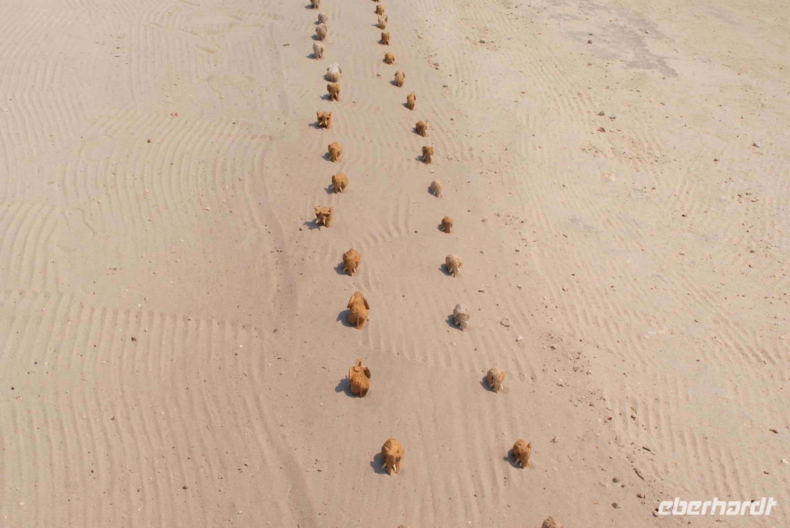Geschlafen wie die Steine, treffen wir uns zu einer tollen Frühstückstafel wieder. Bestens versorgt starten wir unsere Fahrt Richtung Etosha Nationalpark. Vorbei an Otjiwarongo, was so viel wie „Platz der fetten Rinder“ bedeutet, statten wir noch am Bahnhof einer historischen, deutschen Eisenbahn aus dem Jahr 1960 einen Besuch ab. Diese wurde einst in Kassel gebaut und steht als eine der letzten Zeitzeugen vergangener Tage auf einem Schmalspurgleis. Weiter geht die Reise nach Outjo (= Kleiner Hügel) und wie Guide Gian-Paolo erklärt, verändert sich nun die Umgebung zu einer Hügellandschaft. Hier haben wir ausreichend Zeit, um im Ort den Spar Supermarkt, die örtliche Bäckerei mit vielen deutschen Spezialitäten und den Souvenirshop zu entern. Natürlich können wir nicht abreisen, ohne der Schweiz-Namibianerin Anastasia und ihrem Biergarten einen Besuch abzustatten. Gegen Mittag fahren wir am Anderson Gate in den 22.000 Km² großen Etosha Park hinein. Den Namen erhielt dieser von der Ableitung „großer, weißer Platz“ und hiermit gemeint ist die riesige Etosha Pfanne, eine weiße, ausgetrocknete Senke mit unfassbaren Dimensionen. Nachmittags trennt sich unsere Gruppe und ein Teil bucht eine optionale Pirschfahrt im offenen Jeep, der restliche Teil zieht mit Gian-Paolo im Safaritruck weiter. Nachdem es zur Mittagszeit ziemlich ruhig im Park ist, es ist sehr heiß und die Sonne brennt vom Himmel, sind wir am Nachmittag deutlich erfolgreicher. Wir sehen dann doch noch etliche Giraffen, Springböcke, zwei Löwen, elf Giraffen, Gnus, Kudus, Sekretärvögel, u.v.m. Zum Schluss bringt uns Guide Bartromeus nochmals zum Wasserloch im Restcamp und wir staunen nicht schlecht, dass schließlich an die zwanzig Elefanten das grüne Nass aufsuchen und sich kein bisschen stören lassen. Zurück in der Lodge und noch etwas Freizeit, erwartet uns ein herrliches Abendessen unter dem Sternenhimmel, wo es sich bei herrlich milden Temperaturen bestens aushalten lässt.