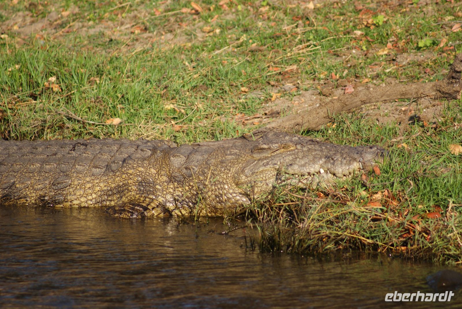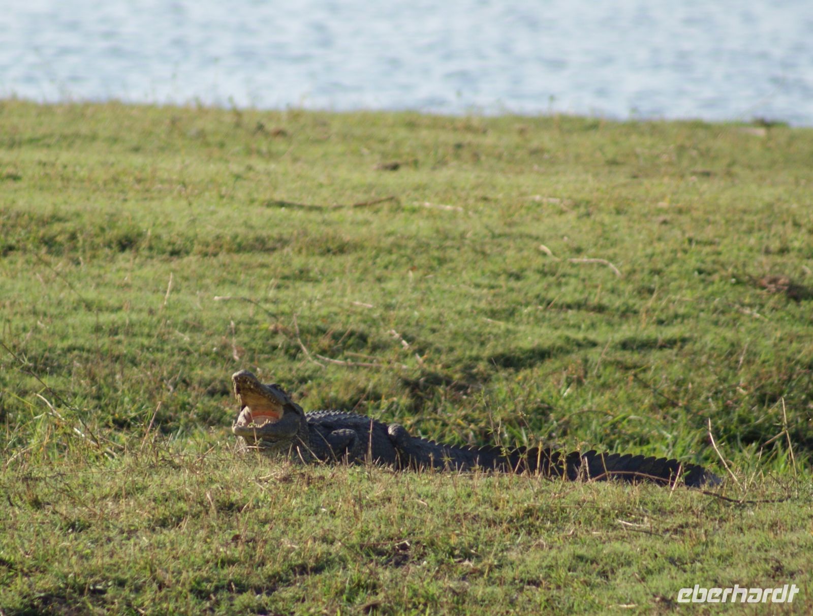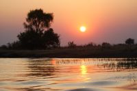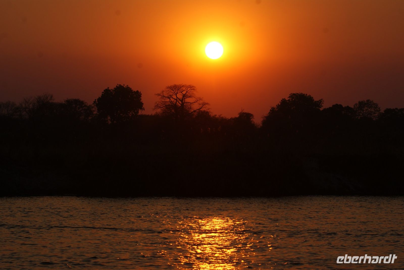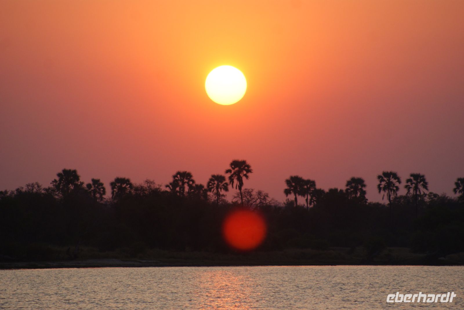 Obwohl wir heute etwas länger schlafen können, so werden wir doch schon von so manchem Vogelgezwitscher und Flusspferdgrunzen geweckt-nun es gibt wirklich schlimmeres…. Am Frühstückstreffpunkt angekommen, erhalten wir eine Überraschung! Das heutige Frühstück findet im Rahmen einer morgendlichen Bootsfahrt auf dem Kavango statt. Wow! So genießen wir das tolle Buffet, welches für uns bereitsteht und die herrliche Kulisse, die sich uns bietet. Viele Tiere grasen entlang des Flussufers, Flusspferde beäugen uns aus dem Wasser, Krokodile erwärmen sich mit den ersten Sonnenstrahlen, Hagedasch-Ibisse begrüßen uns lautstark aus der Luft-ein wunderbarer Start in den Tag! Anschließend geht es mit unserem Safari-Truck in den Mahango Nationalpark. Hier sehen wir wieder so manche Tiere, wie Warzenschweine, die seltenen Riedböcke, den seltenen Riesenglanzstar, Bienenfresser mit wunderschönem Federkleid sowie Buschböcke, die nur in dieser Region zu sehen sind. Den Park verlassend geht es auf zu den „Popa Falls“, diese ähneln eher Stromschnellen und wir entdecken Fischotter, die vergnügt im Wasser tollen, dazu noch ein Krokodil, welches auf einem Felsen Platz nimmt. Zurück in der Lodge genießen wir freie Stunden und die tolle Atmosphäre der Anlage, bevor es nachmittags wieder auf Bootstour mit Sundowner geht. Auch diese Fahrt ist für uns eine wahre Wonne, umgeben von Hippos, Tieren links und rechts am Ufer, ein laues Lüftchen und ein kühles Getränk, lässt es sich nun wahrlich aushalten. Es folgt ein wunderschöner Sonnenuntergang, der uns schweigen und die Atmosphäre genießen lässt. Abends wird für alle Gäste der Lodge wieder ein tolles Abendessen bereitet, erstaunt stellen wir fest, dass der Mond heute eine Stunde später aufgeht als noch am Vorabend, wie sich das verhält, lässt sich uns nicht erschließen.