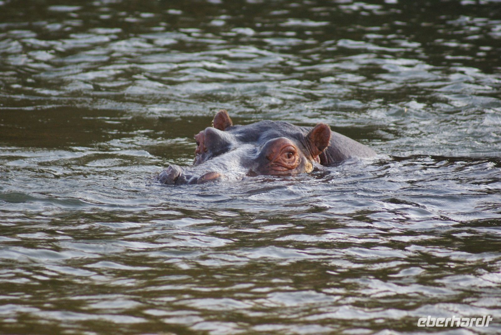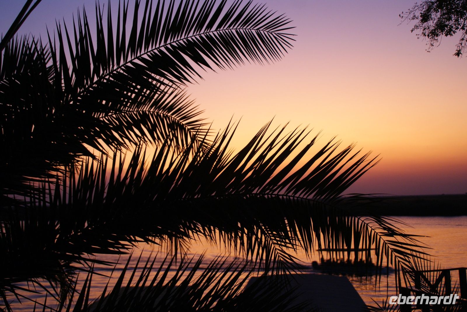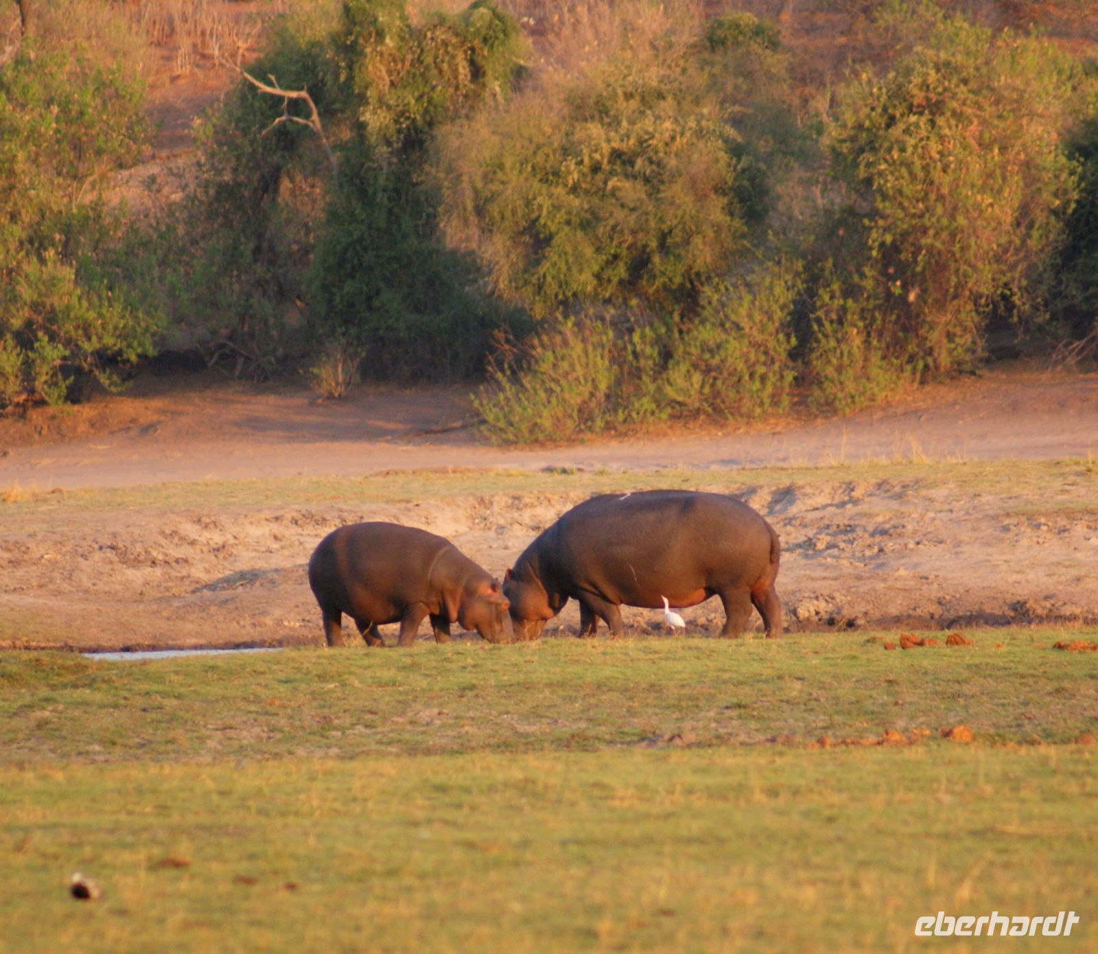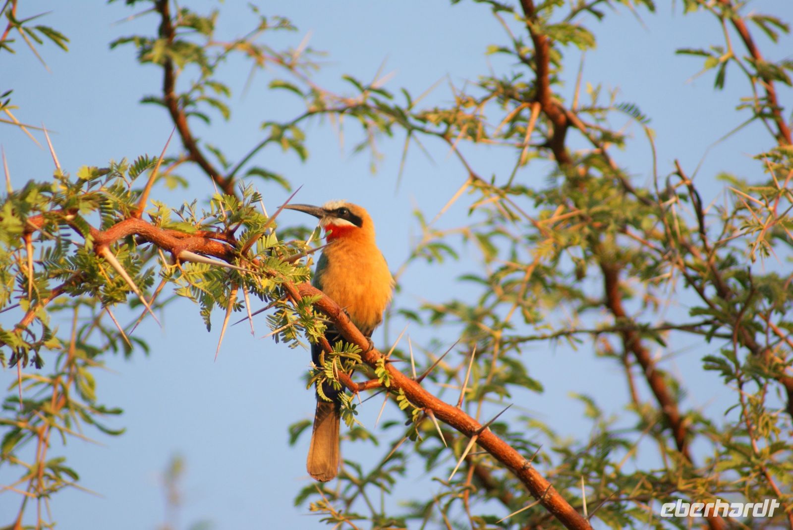 Obwohl wir heute etwas länger schlafen können, so werden wir doch schon von so manchem Vogelgezwitscher und Flusspferdgrunzen geweckt-nun es gibt wirklich schlimmeres…. Am Frühstückstreffpunkt angekommen, erhalten wir eine Überraschung! Das heutige Frühstück findet im Rahmen einer morgendlichen Bootsfahrt auf dem Kavango statt. Wow! So genießen wir das tolle Buffet, welches für uns bereitsteht und die herrliche Kulisse, die sich uns bietet. Viele Tiere grasen entlang des Flussufers, Flusspferde beäugen uns aus dem Wasser, Krokodile erwärmen sich mit den ersten Sonnenstrahlen, Hagedasch-Ibisse begrüßen uns lautstark aus der Luft-ein wunderbarer Start in den Tag! Anschließend geht es mit unserem Safari-Truck in den Mahango Nationalpark. Hier sehen wir wieder so manche Tiere, wie Warzenschweine, die seltenen Riedböcke, den seltenen Riesenglanzstar, Bienenfresser mit wunderschönem Federkleid sowie Buschböcke, die nur in dieser Region zu sehen sind. Den Park verlassend geht es auf zu den „Popa Falls“, diese ähneln eher Stromschnellen und wir entdecken Fischotter, die vergnügt im Wasser tollen, dazu noch ein Krokodil, welches auf einem Felsen Platz nimmt. Zurück in der Lodge genießen wir freie Stunden und die tolle Atmosphäre der Anlage, bevor es nachmittags wieder auf Bootstour mit Sundowner geht. Auch diese Fahrt ist für uns eine wahre Wonne, umgeben von Hippos, Tieren links und rechts am Ufer, ein laues Lüftchen und ein kühles Getränk, lässt es sich nun wahrlich aushalten. Es folgt ein wunderschöner Sonnenuntergang, der uns schweigen und die Atmosphäre genießen lässt. Abends wird für alle Gäste der Lodge wieder ein tolles Abendessen bereitet, erstaunt stellen wir fest, dass der Mond heute eine Stunde später aufgeht als noch am Vorabend, wie sich das verhält, lässt sich uns nicht erschließen.