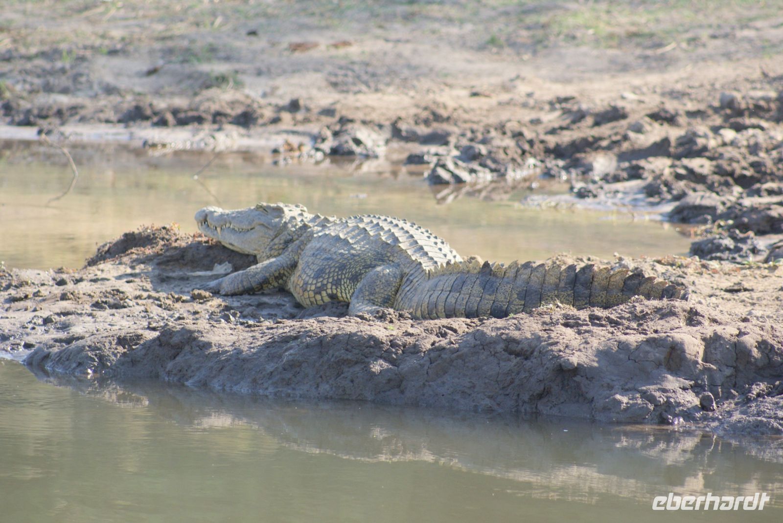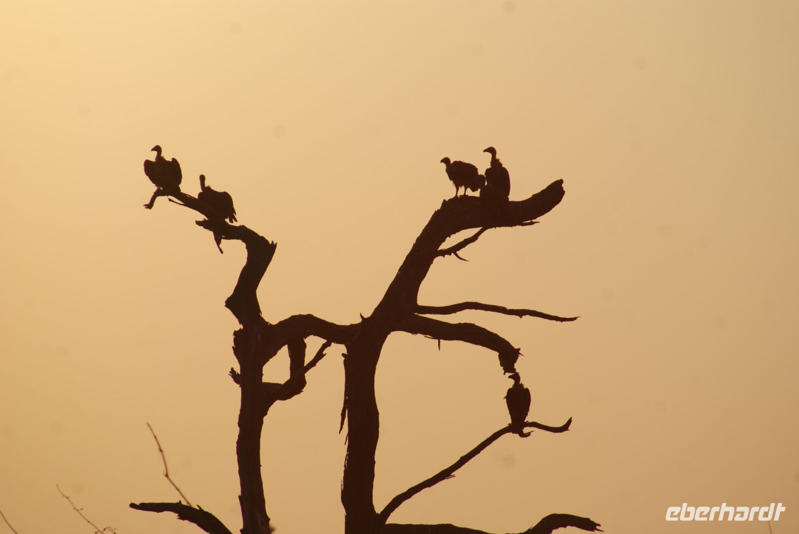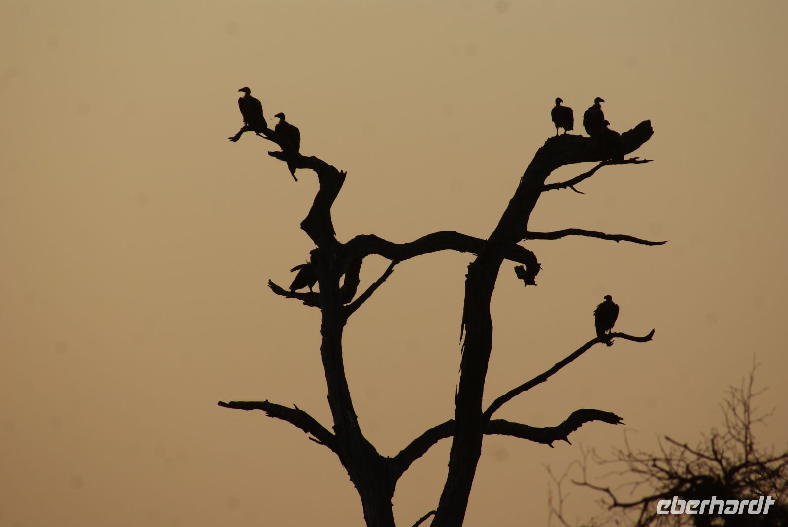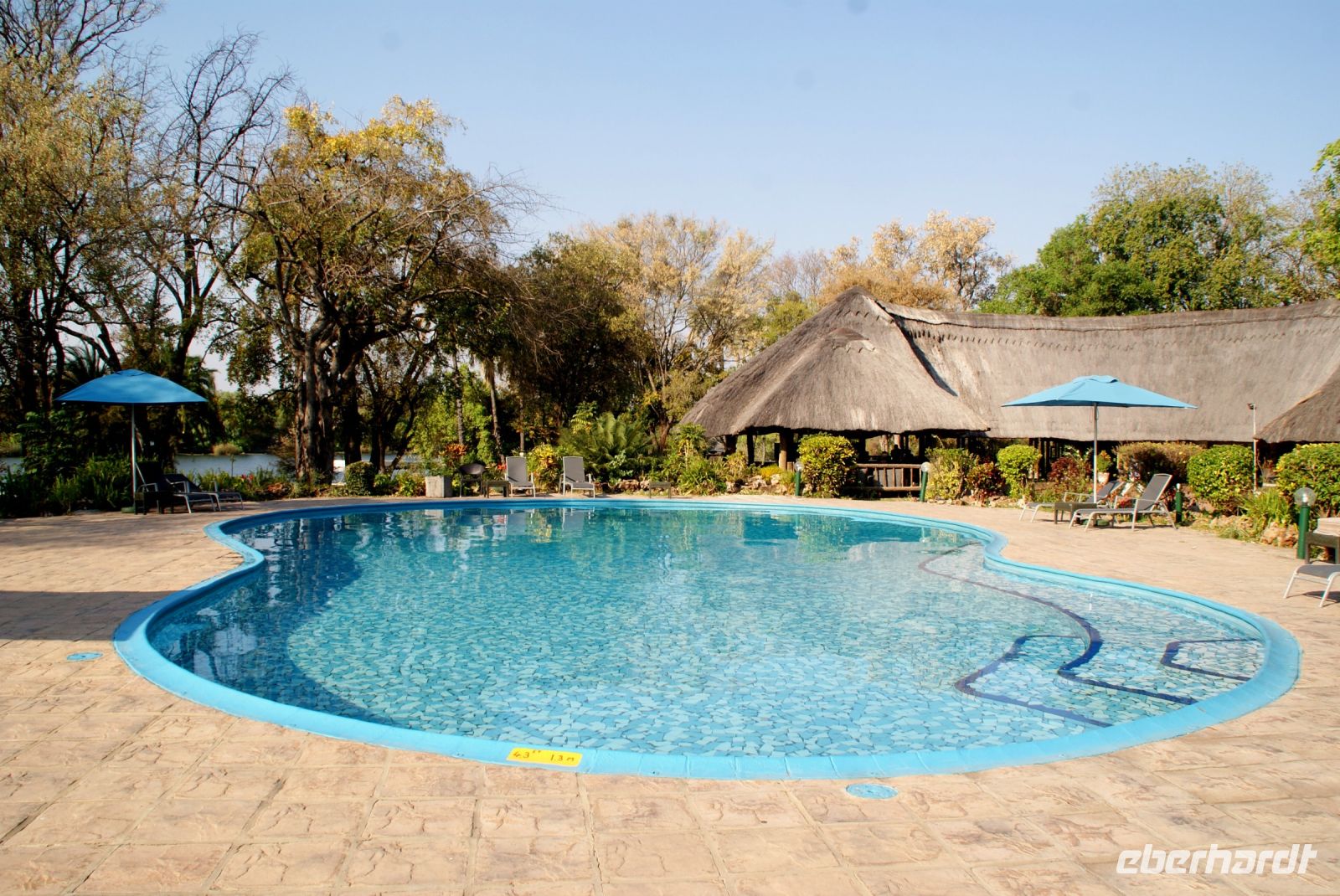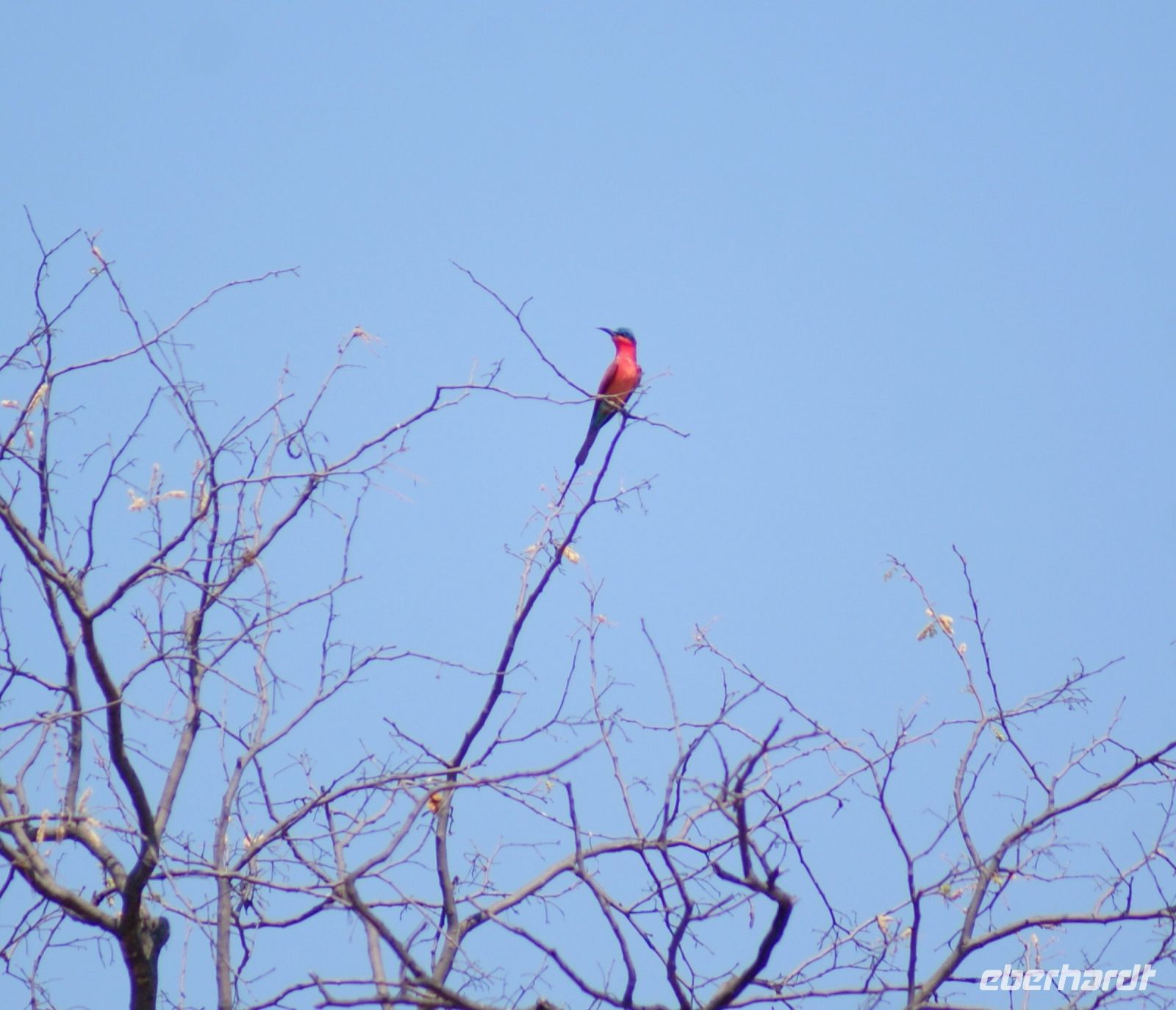 Obwohl wir heute etwas länger schlafen können, so werden wir doch schon von so manchem Vogelgezwitscher und Flusspferdgrunzen geweckt-nun es gibt wirklich schlimmeres…. Am Frühstückstreffpunkt angekommen, erhalten wir eine Überraschung! Das heutige Frühstück findet im Rahmen einer morgendlichen Bootsfahrt auf dem Kavango statt. Wow! So genießen wir das tolle Buffet, welches für uns bereitsteht und die herrliche Kulisse, die sich uns bietet. Viele Tiere grasen entlang des Flussufers, Flusspferde beäugen uns aus dem Wasser, Krokodile erwärmen sich mit den ersten Sonnenstrahlen, Hagedasch-Ibisse begrüßen uns lautstark aus der Luft-ein wunderbarer Start in den Tag! Anschließend geht es mit unserem Safari-Truck in den Mahango Nationalpark. Hier sehen wir wieder so manche Tiere, wie Warzenschweine, die seltenen Riedböcke, den seltenen Riesenglanzstar, Bienenfresser mit wunderschönem Federkleid sowie Buschböcke, die nur in dieser Region zu sehen sind. Den Park verlassend geht es auf zu den „Popa Falls“, diese ähneln eher Stromschnellen und wir entdecken Fischotter, die vergnügt im Wasser tollen, dazu noch ein Krokodil, welches auf einem Felsen Platz nimmt. Zurück in der Lodge genießen wir freie Stunden und die tolle Atmosphäre der Anlage, bevor es nachmittags wieder auf Bootstour mit Sundowner geht. Auch diese Fahrt ist für uns eine wahre Wonne, umgeben von Hippos, Tieren links und rechts am Ufer, ein laues Lüftchen und ein kühles Getränk, lässt es sich nun wahrlich aushalten. Es folgt ein wunderschöner Sonnenuntergang, der uns schweigen und die Atmosphäre genießen lässt. Abends wird für alle Gäste der Lodge wieder ein tolles Abendessen bereitet, erstaunt stellen wir fest, dass der Mond heute eine Stunde später aufgeht als noch am Vorabend, wie sich das verhält, lässt sich uns nicht erschließen.