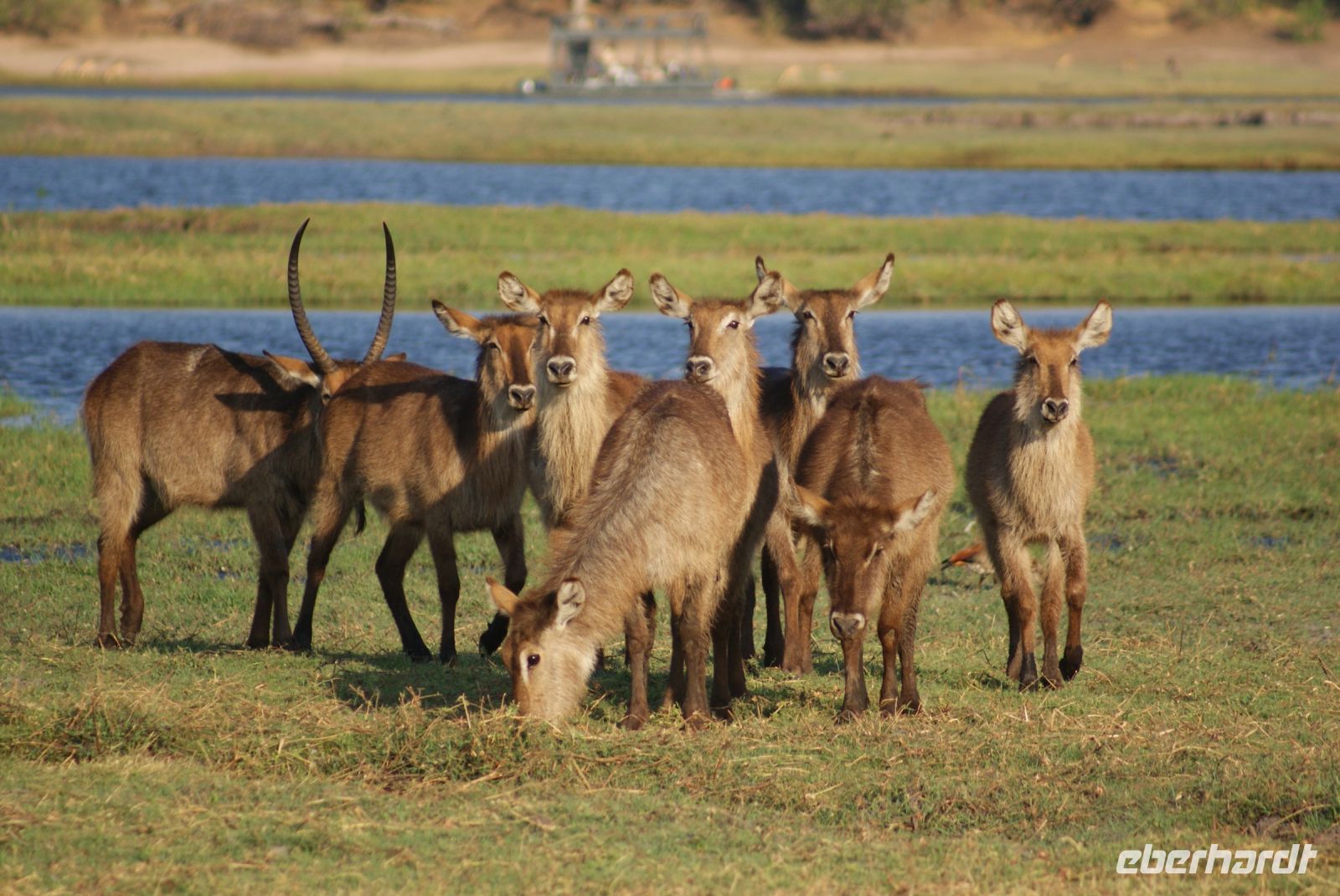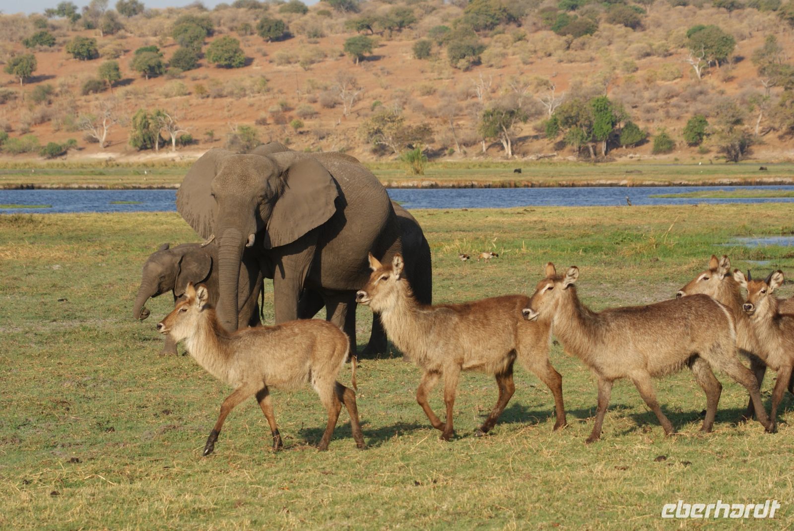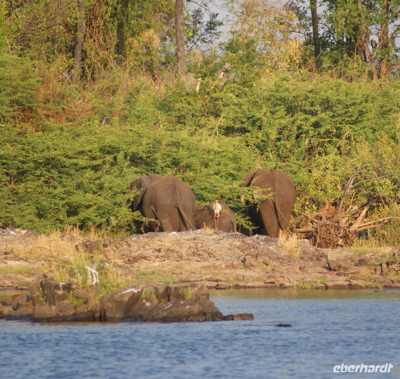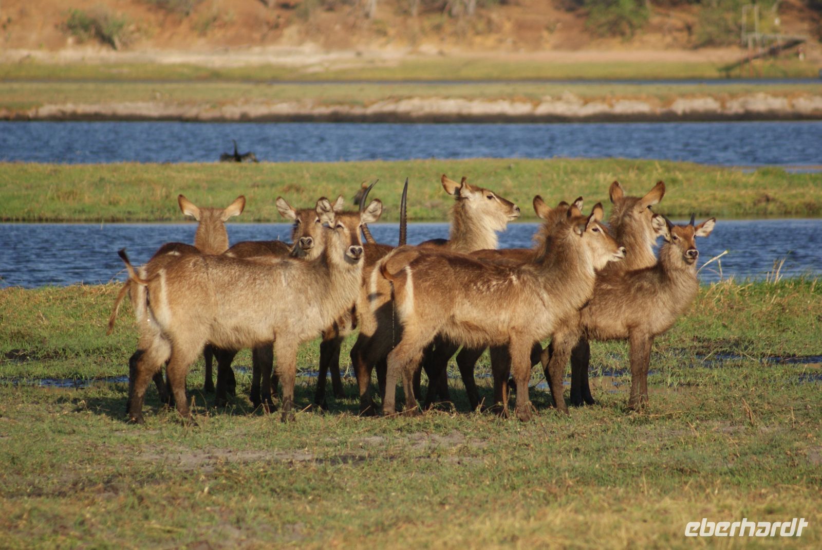 Nach einer geruhsamen Nacht und einem wunderbaren Frühstück mit Blick auf den Fluss ziehen wir weiter entlang der Sambesi Region Richtung Osten. Wir durchfahren den Bwabwata Nationalpark und befinden uns nun zwischen zwei Ländern. Zur rechten Seite liegt Botswana, zur linken Seite Angola, wir auf der Transitstraße noch in Namibia. Elefantenwarnschilder weisen darauf hin, dass jederzeit mit den Dickhäutern zu rechnen ist. Nachdem wir das besondere Schild fotografiert haben, stoßen wir auf eine große Herde mit ca. 20 Elefanten-einfach unglaublich. Kurz vor unserem Tagesziel sehen wir die seltenen Lechwe Antilopen, die jedoch zu scheu sind, um sich von uns fotografieren zu lassen. Dafür präsentieren sich viele Kudus mit riesengroßen Ohren und lassen sich bereitwillig von uns aufnehmen. In Kongola besuchen wir einen schönen Souvenirladen und erreichen am frühen Nachmittag die wunderschöne Namushasha Lodge, welche idyllisch am Kwando liegt. Wir genießen den freien Nachmittag in unseren komfortablen Unterkünften und lassen die Seele mit Blick auf Fluss und Landschaft dahinter baumeln. Abends erfolgt ein sehr köstliches Abendessen, welches wir auf der Terrasse der Lodge unter dem Sternenhimmel mehr als zu schätzen wissen.