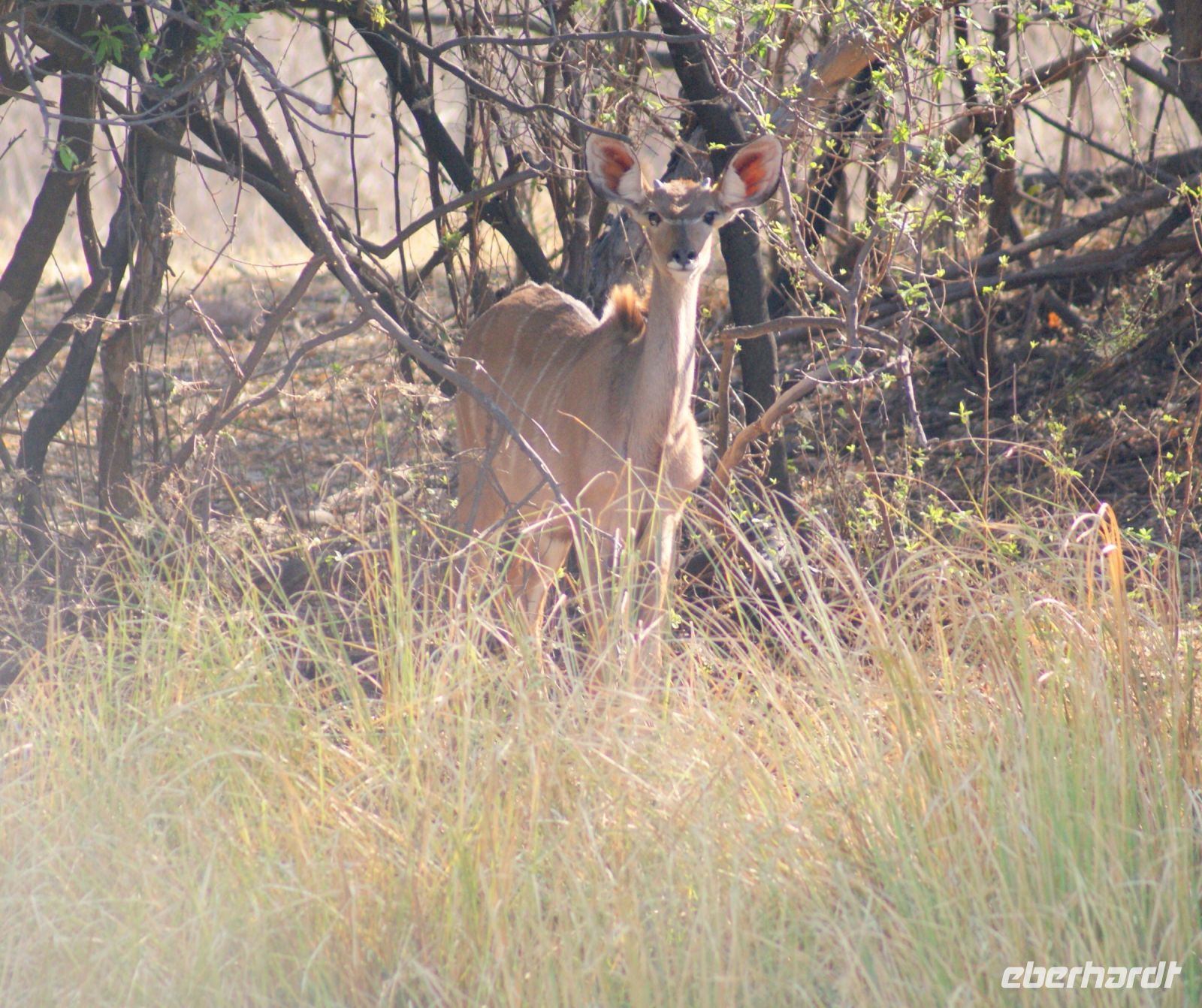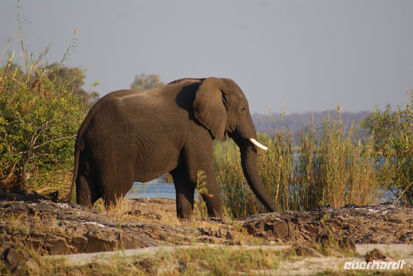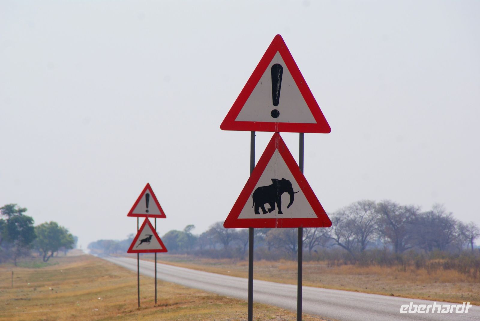 Nach einer geruhsamen Nacht und einem wunderbaren Frühstück mit Blick auf den Fluss ziehen wir weiter entlang der Sambesi Region Richtung Osten. Wir durchfahren den Bwabwata Nationalpark und befinden uns nun zwischen zwei Ländern. Zur rechten Seite liegt Botswana, zur linken Seite Angola, wir auf der Transitstraße noch in Namibia. Elefantenwarnschilder weisen darauf hin, dass jederzeit mit den Dickhäutern zu rechnen ist. Nachdem wir das besondere Schild fotografiert haben, stoßen wir auf eine große Herde mit ca. 20 Elefanten-einfach unglaublich. Kurz vor unserem Tagesziel sehen wir die seltenen Lechwe Antilopen, die jedoch zu scheu sind, um sich von uns fotografieren zu lassen. Dafür präsentieren sich viele Kudus mit riesengroßen Ohren und lassen sich bereitwillig von uns aufnehmen. In Kongola besuchen wir einen schönen Souvenirladen und erreichen am frühen Nachmittag die wunderschöne Namushasha Lodge, welche idyllisch am Kwando liegt. Wir genießen den freien Nachmittag in unseren komfortablen Unterkünften und lassen die Seele mit Blick auf Fluss und Landschaft dahinter baumeln. Abends erfolgt ein sehr köstliches Abendessen, welches wir auf der Terrasse der Lodge unter dem Sternenhimmel mehr als zu schätzen wissen.